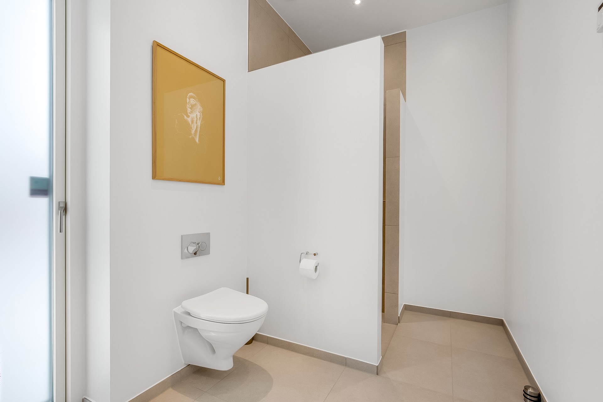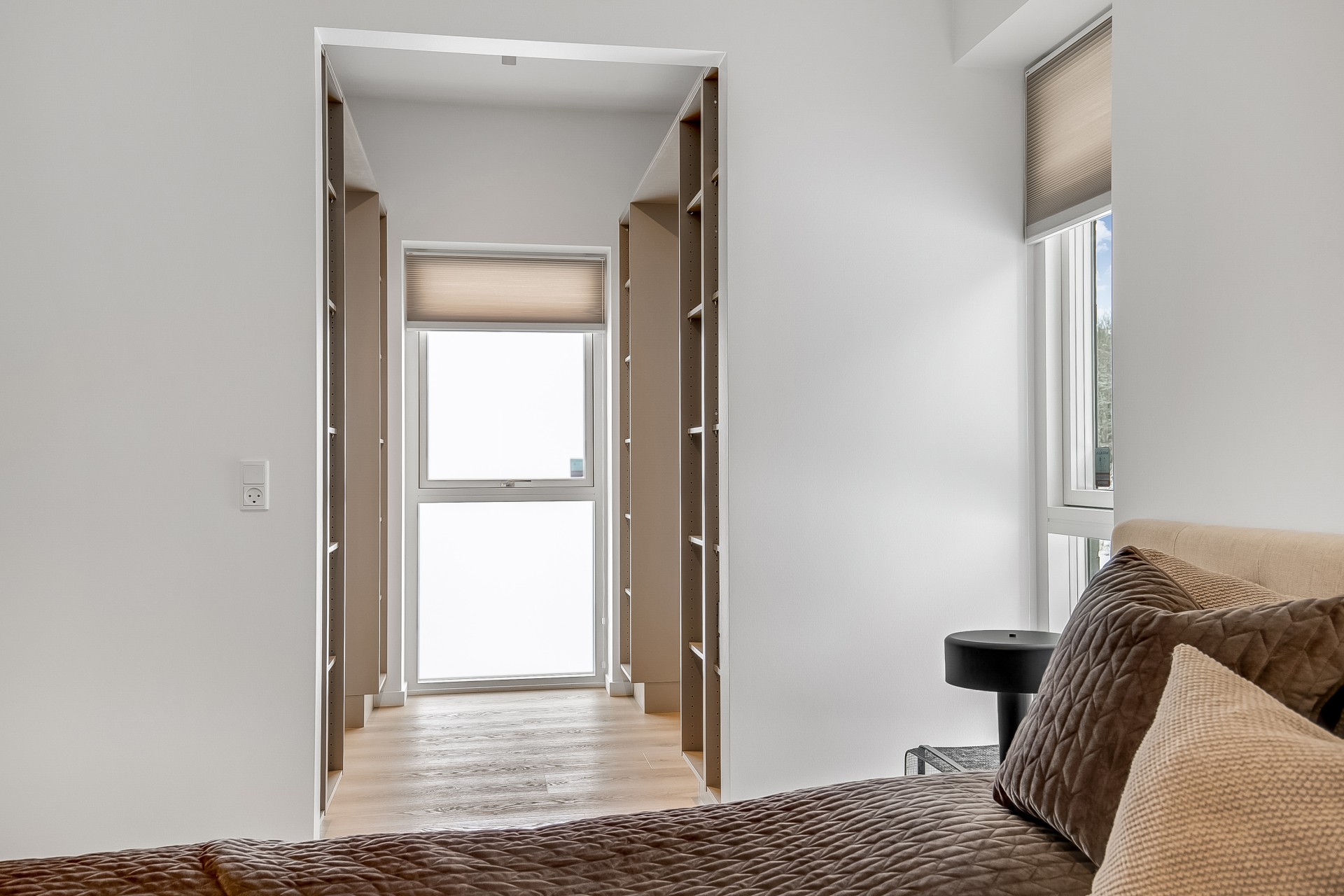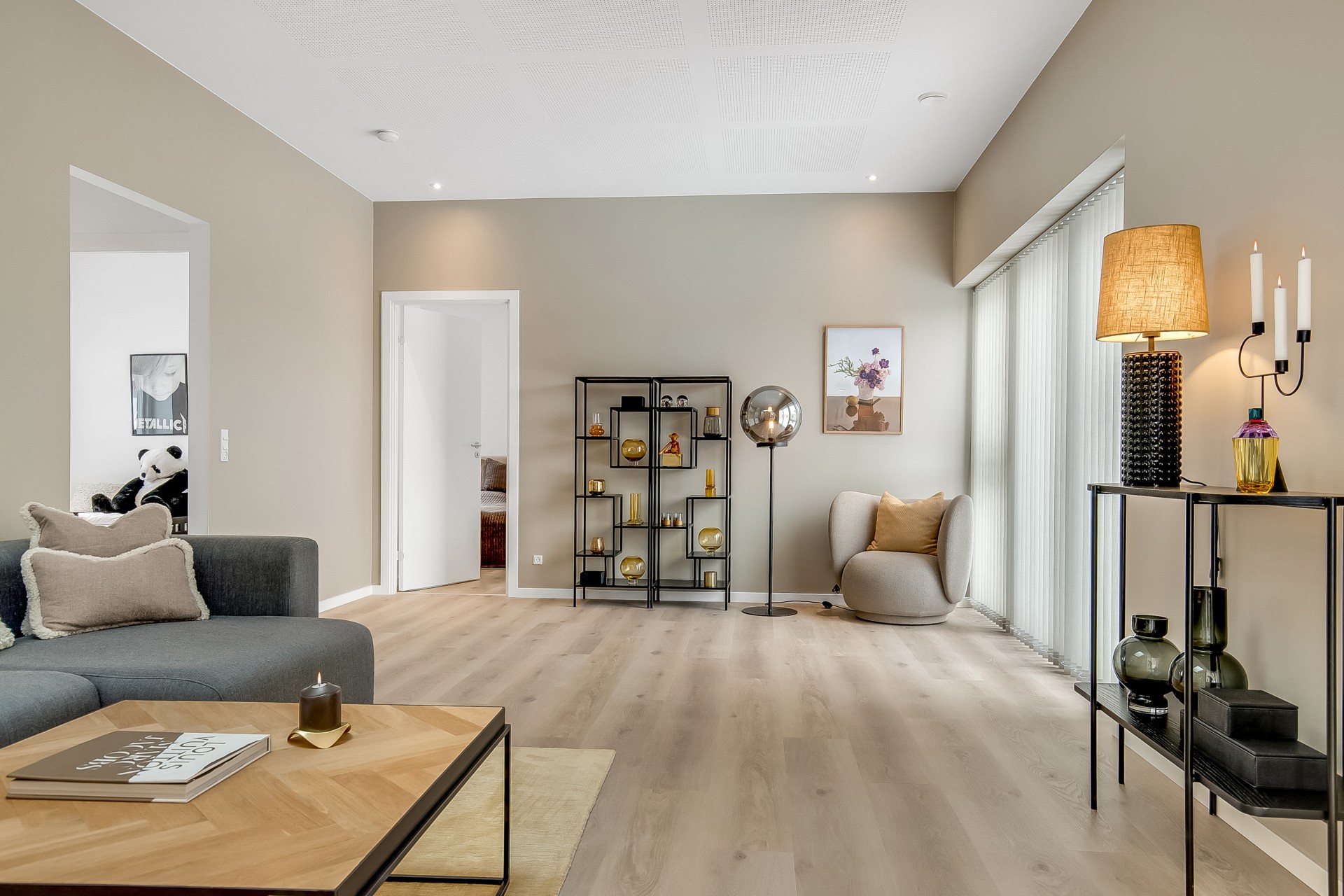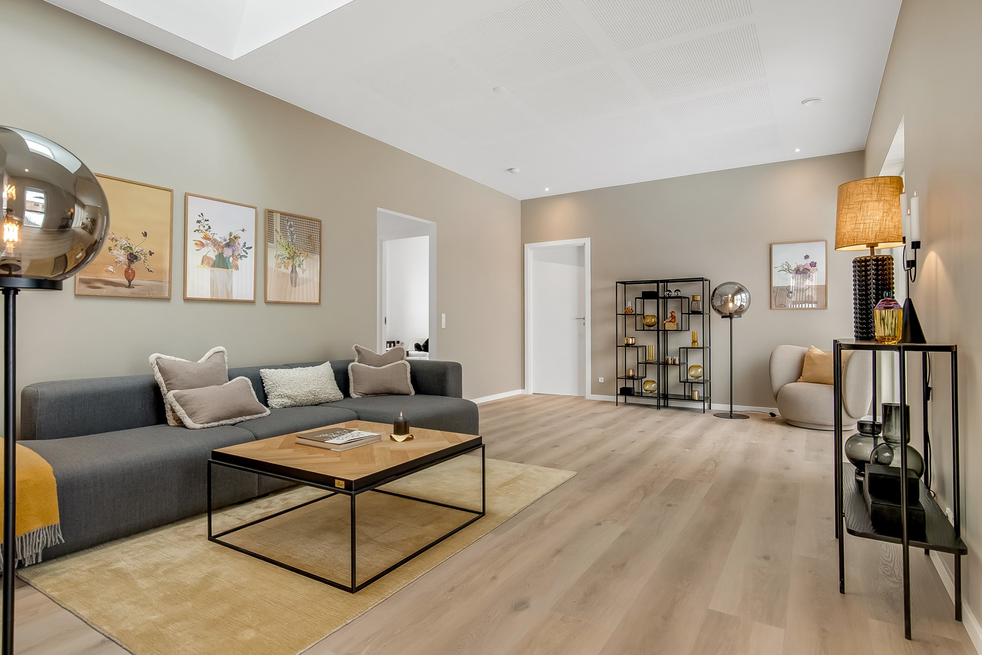 Fra køkken-alrummet træder du to trin ned i en hyggelig stue med et stort ovenlysvindue over sofasektionen. I denne del af boligen er loftshøjden ca. 275 cm, mens alrummet har skrå lofter. Den ekstra loftshøjde får selv mindre værelser til at føles markant større. Ligesom alrummet fungerer stuen fordelingspunkt til værelserne, hvilket minimerer gangarealer til fordel for opholdsplads, du faktisk bruger. Her ligger to gode børneværelser med eget badeværelse samt en forældreafdeling med walk-in og badeværelse med udgang til haven.