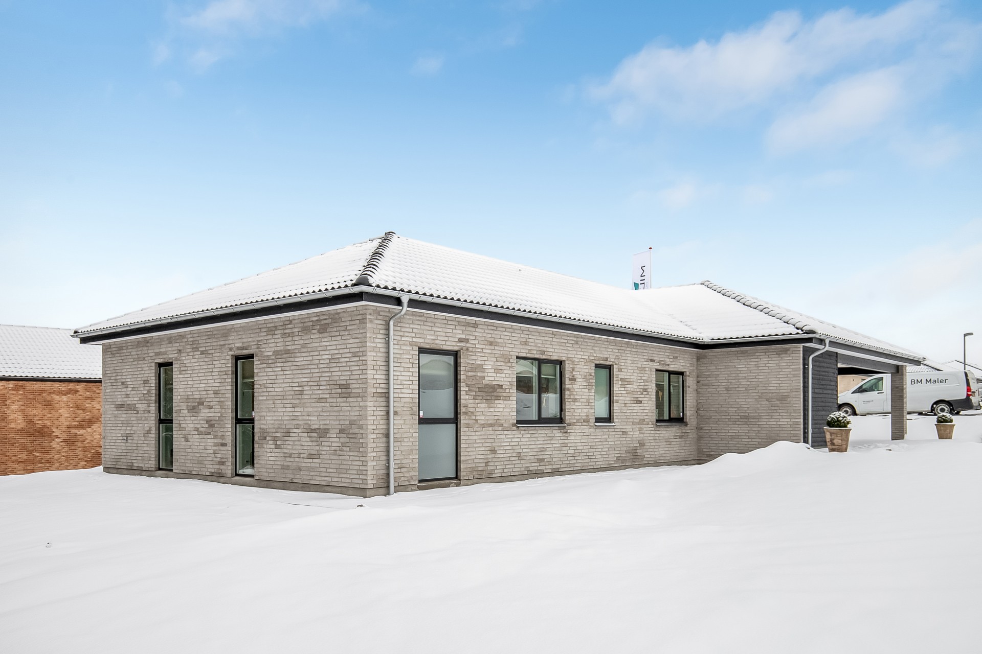 Formmæssigt er der tale om et forskudt vinkelhus med valmtag og udhæng, en integreret carport og et redskabsrum med muret søjle. Facaden er beklædt med Taurus Massiv.