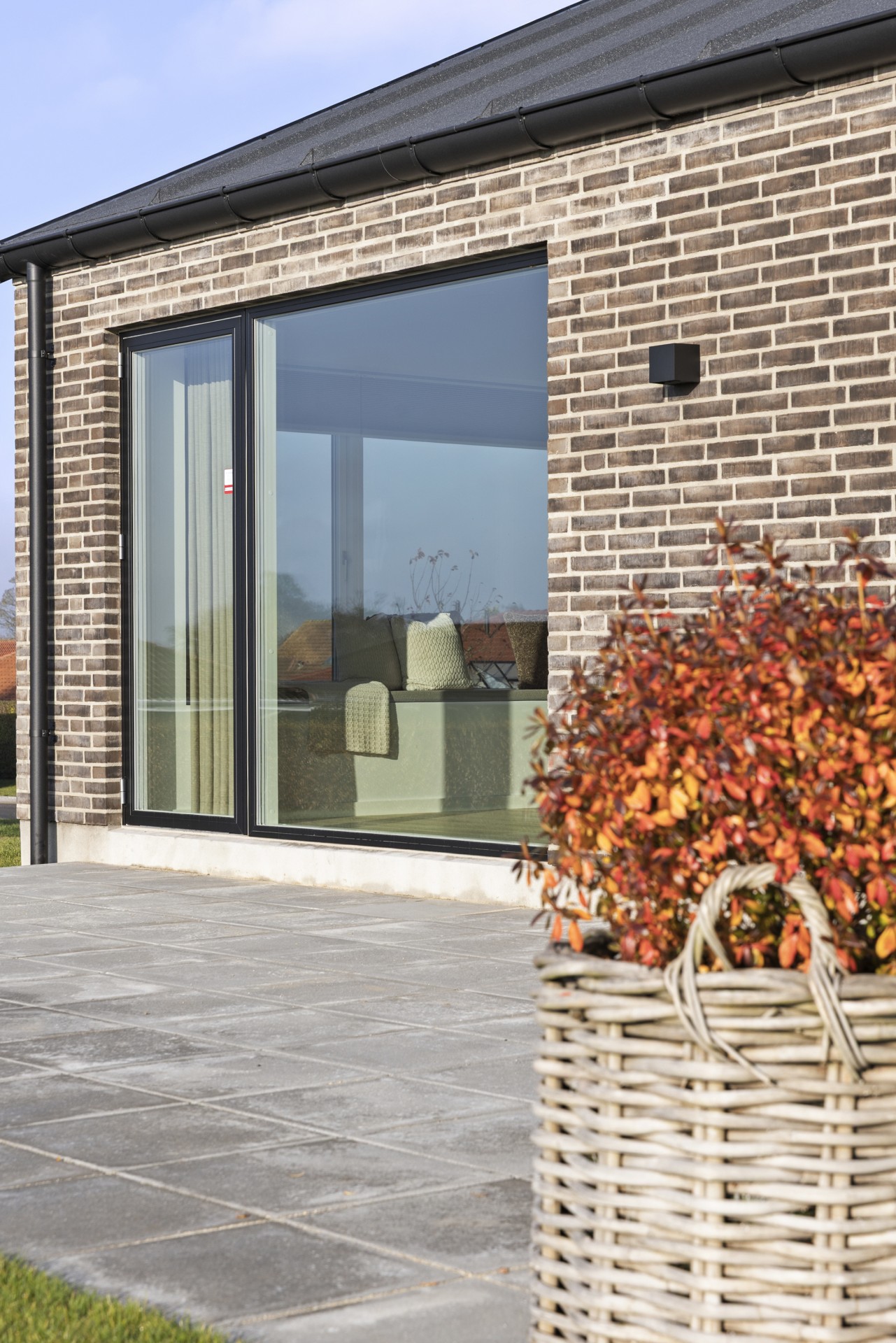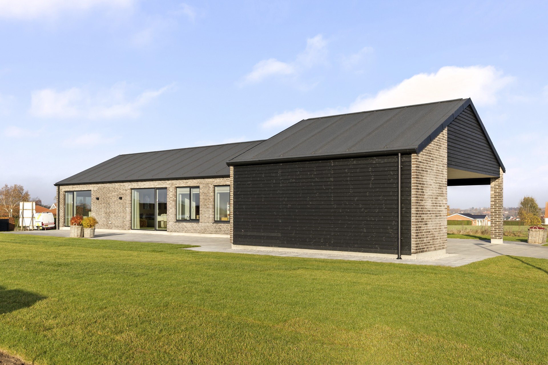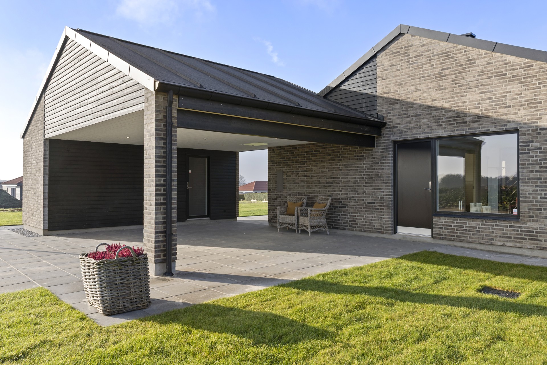 Udvendigt er huset opført med et stilrent sadeltag uden udhæng og beklædt med tagpap, der sammen med de sorte arkitekttagrender i alu skaber et rent og enkelt udtryk. Facaden er opmuret i den smukke mursten EW2403 Gråklit, hvis grå og brune nuancer giver et varmt og moderne udtryk.
