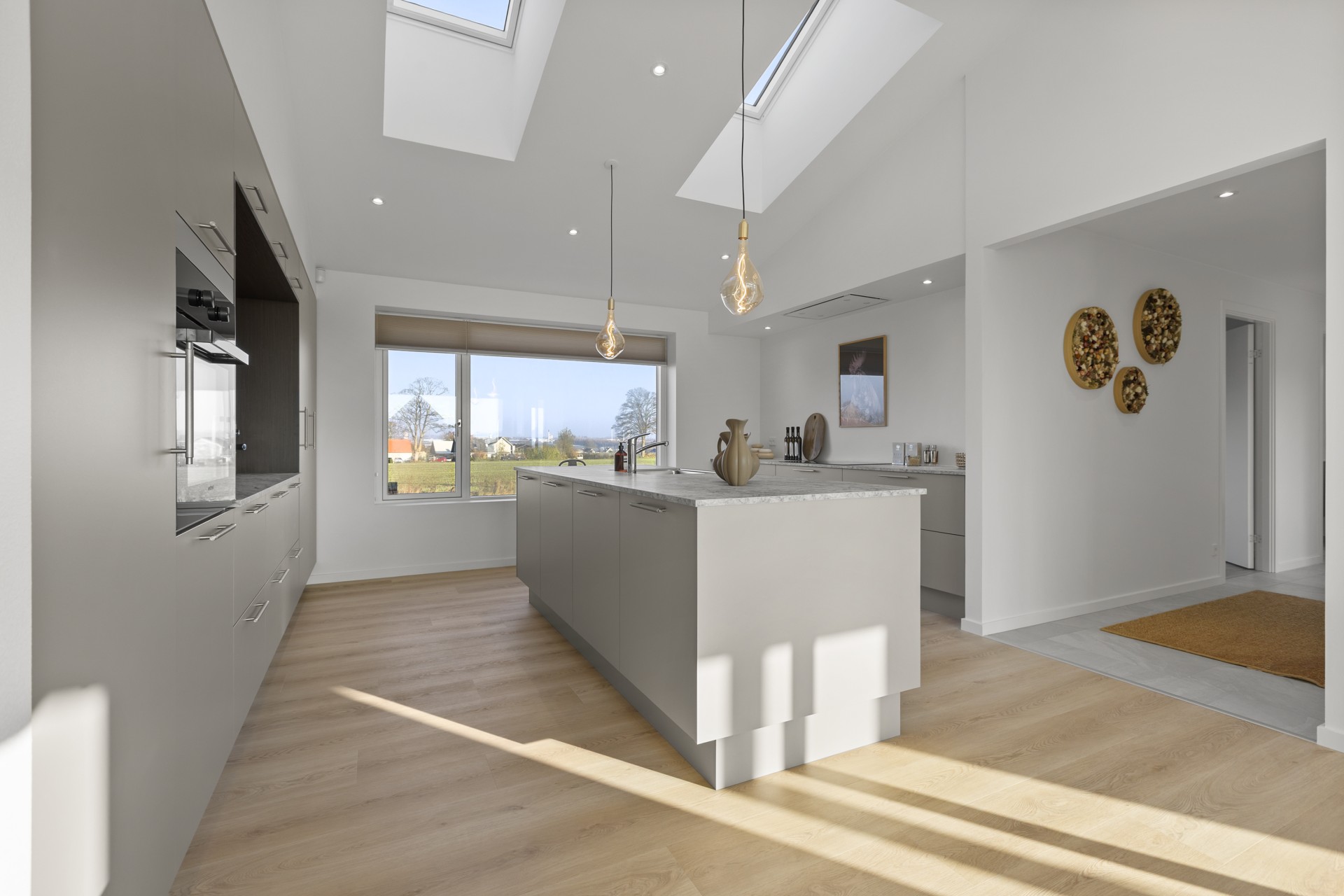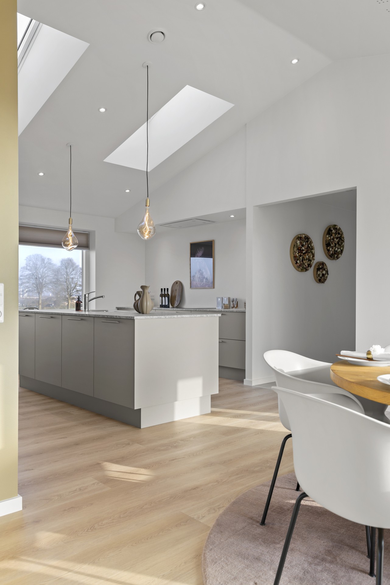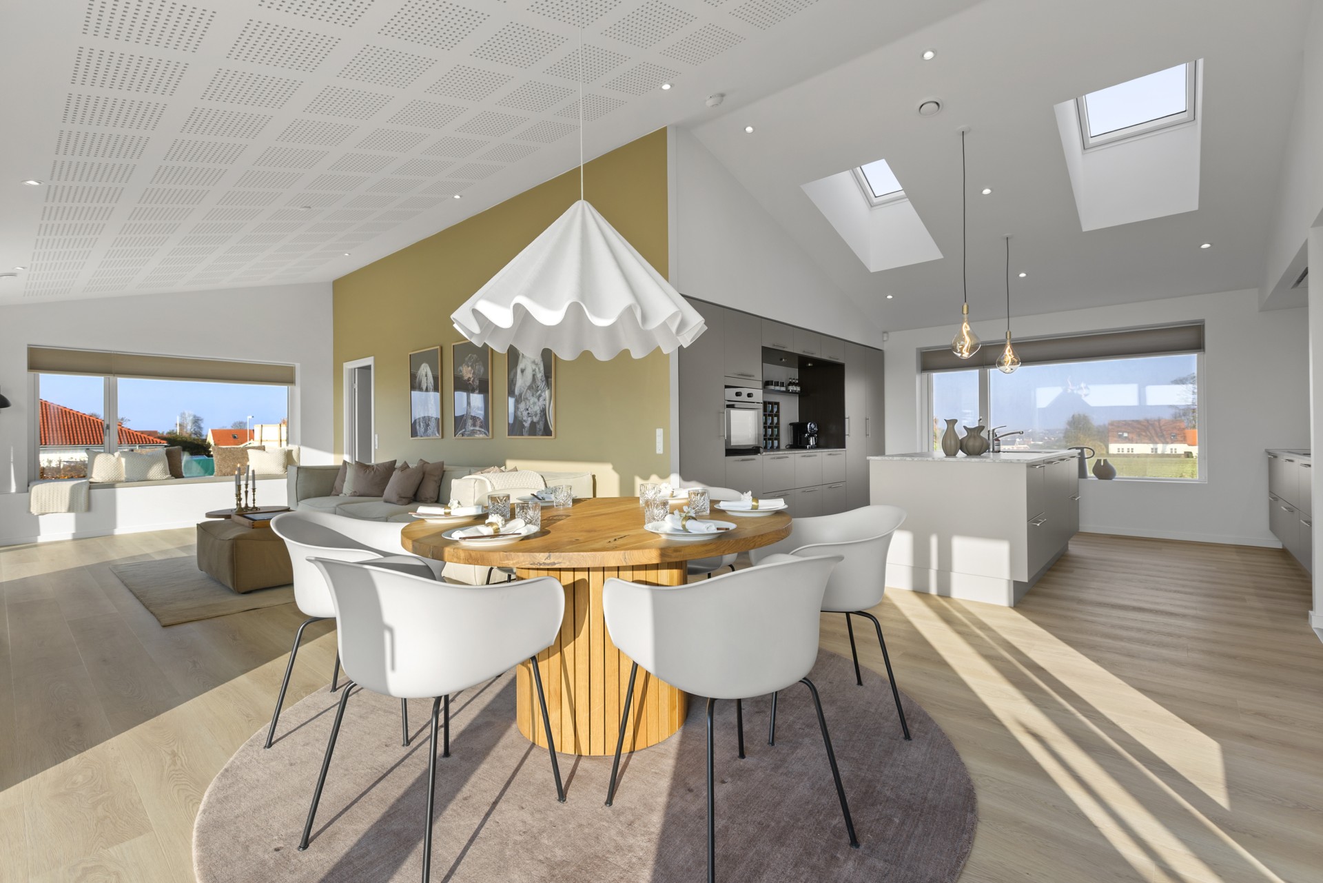 Boligens centrale rum er det gennemgående køkken-alrum, som ligger i åben forbindelse med stuen. Det sammenhængende areal på i alt 56 kvm giver rigelig plads til både hverdagens familieliv og de store mærkedage. To ovenlysvinduer sikrer et godt lysindfald, som fremhæver loftshøjden og de skrå lofter, der går igen i stuen og forældreafdelingen. Store vinduespartier åbner til haven, mens det brede vindue i stuen med indbygget vinduesbænk danner en hyggelig krog med ekstra siddepladser. Køkkenet er praktisk indrettet med en fritstående køkkenø, et depotrum med skjult indgang til alt det, der roder, samt en stor niche, hvor du kan brygge morgenkaffen. Fra alrummet er der adgang til et kontor med dobbelte glasdøre.