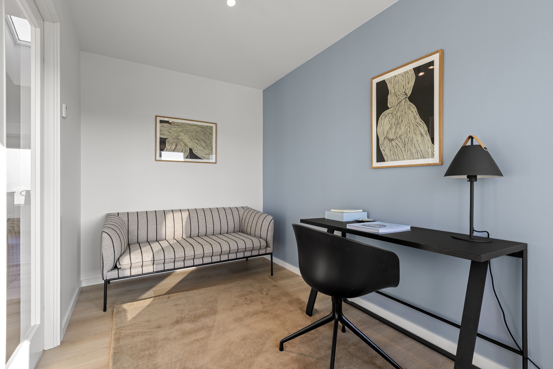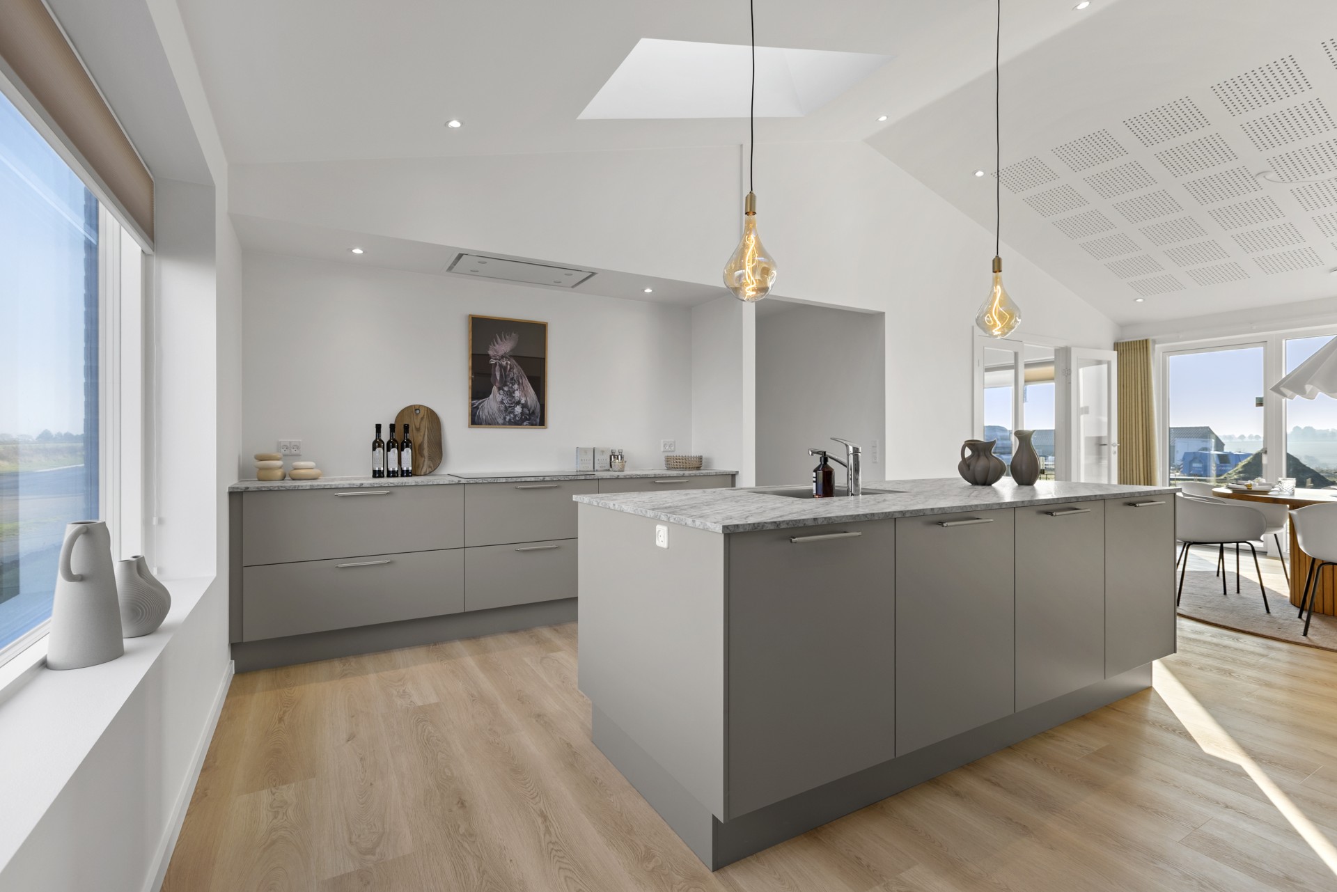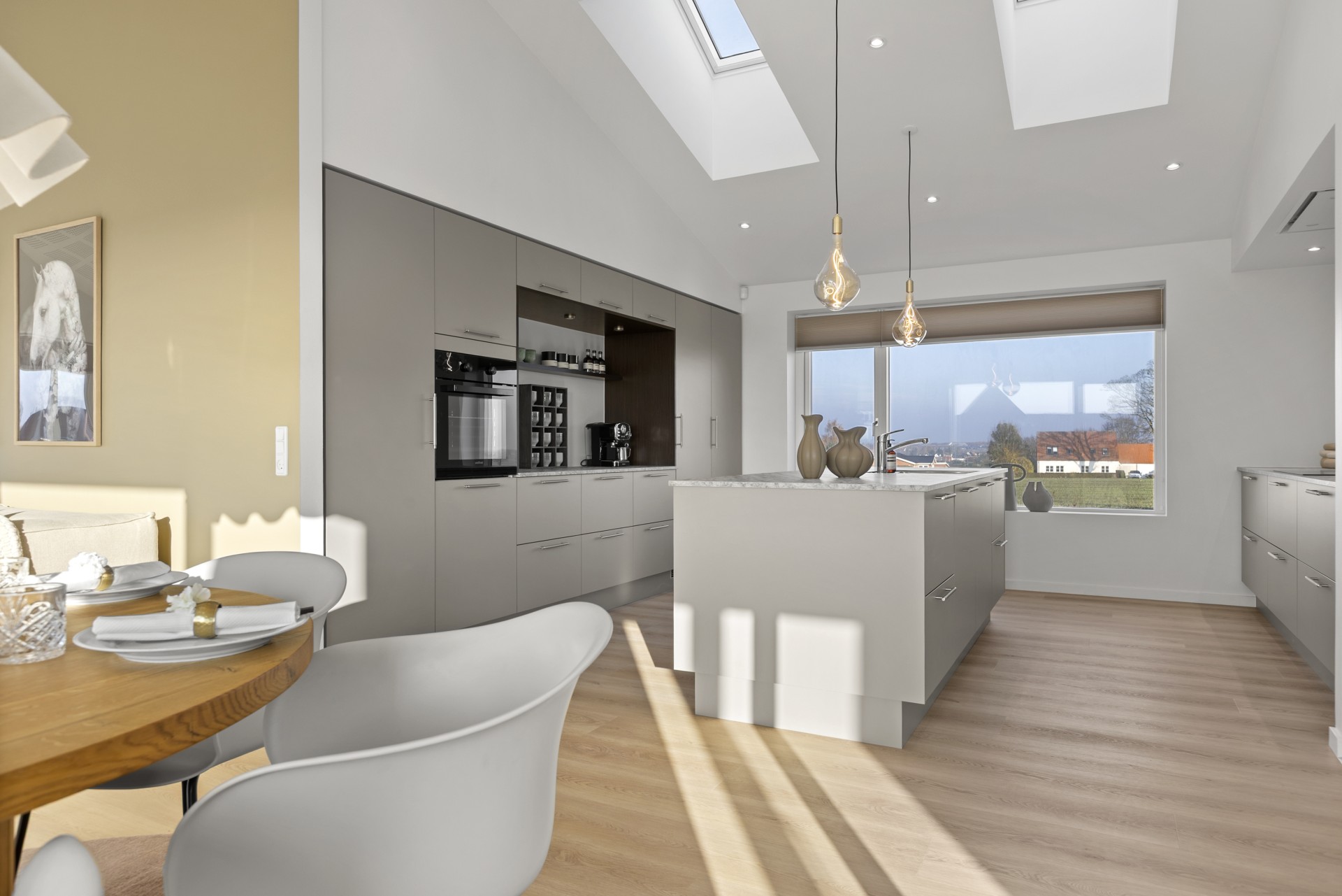 Boligens centrale rum er det gennemgående køkken-alrum, som ligger i åben forbindelse med stuen. Det sammenhængende areal på i alt 56 kvm giver rigelig plads til både hverdagens familieliv og de store mærkedage. To ovenlysvinduer sikrer et godt lysindfald, som fremhæver loftshøjden og de skrå lofter, der går igen i stuen og forældreafdelingen. Store vinduespartier åbner til haven, mens det brede vindue i stuen med indbygget vinduesbænk danner en hyggelig krog med ekstra siddepladser. Køkkenet er praktisk indrettet med en fritstående køkkenø, et depotrum med skjult indgang til alt det, der roder, samt en stor niche, hvor du kan brygge morgenkaffen. Fra alrummet er der adgang til et kontor med dobbelte glasdøre.
