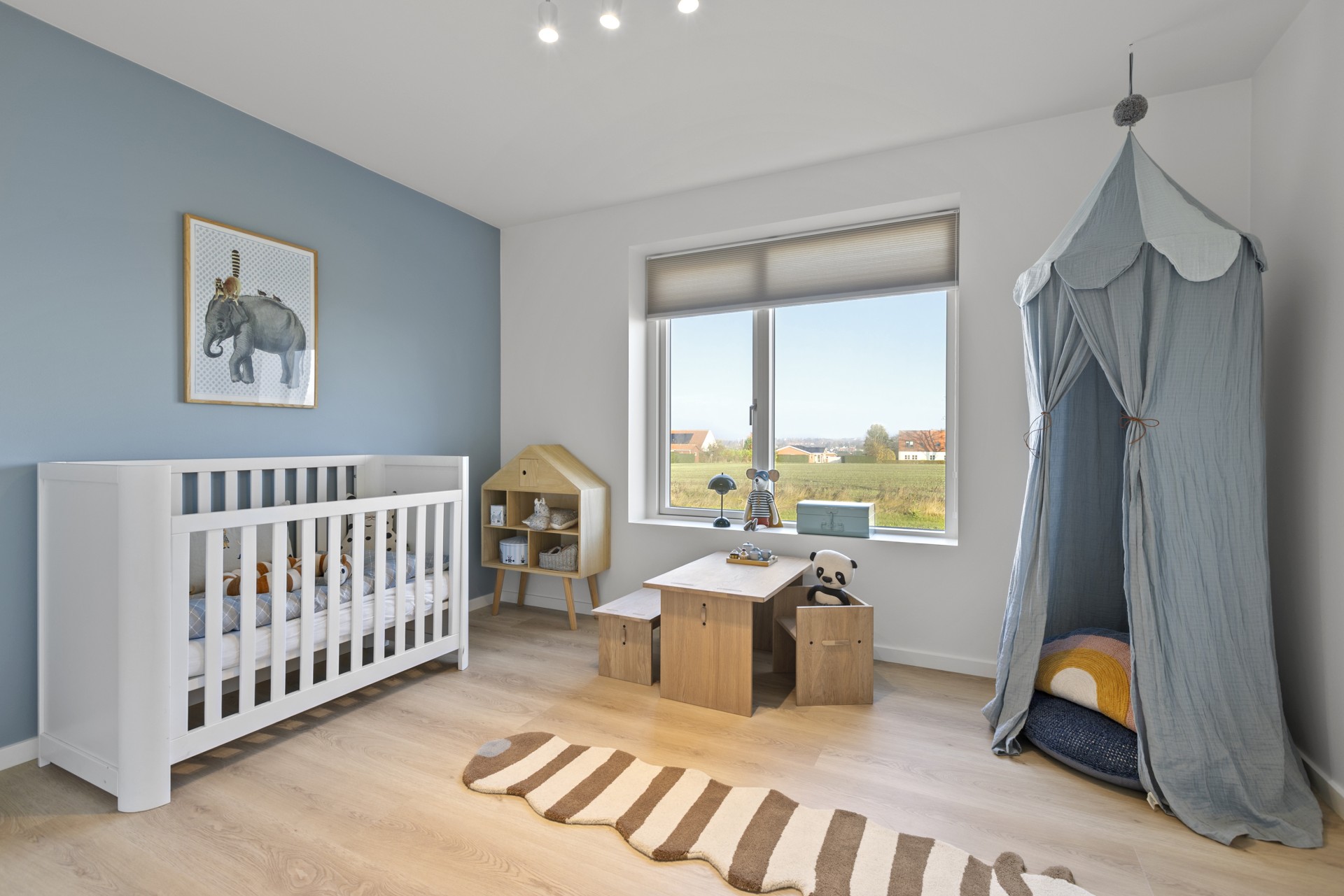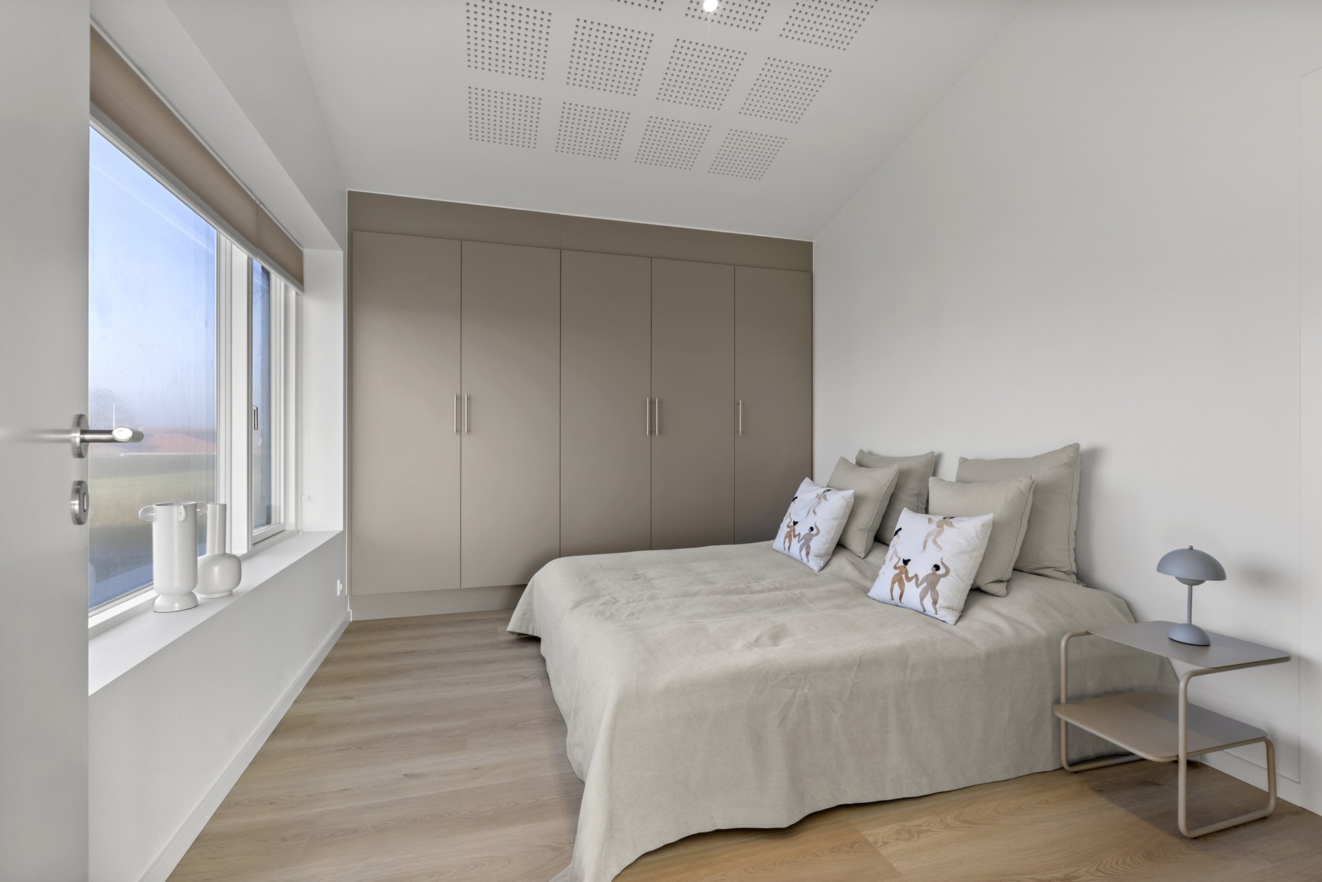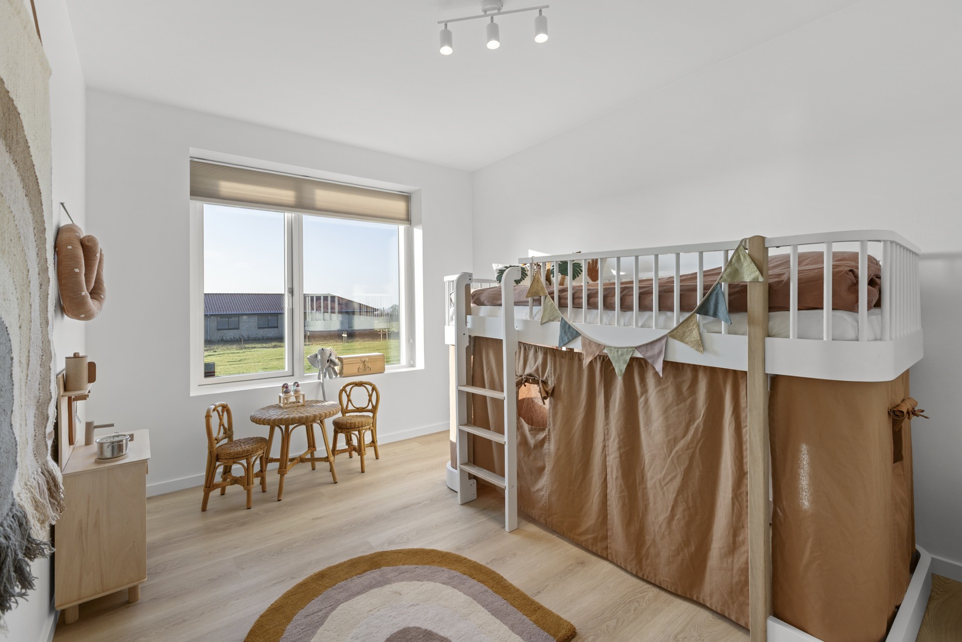 Huset er opdelt i to separate værelsesafdelinger. Forældreafdelingen i den ene ende byder på et soveværelse med indbyggede skabe, skrålofter og direkte adgang til et lækkert badeværelse med ovenlys og en stor bruseniche. Børneafdelingen i den modsatte ende af boligen består af to gode værelser samt et tilsvarende stort badeværelse - her med indbygget bænk i brusenichen for ekstra funktionalitet.