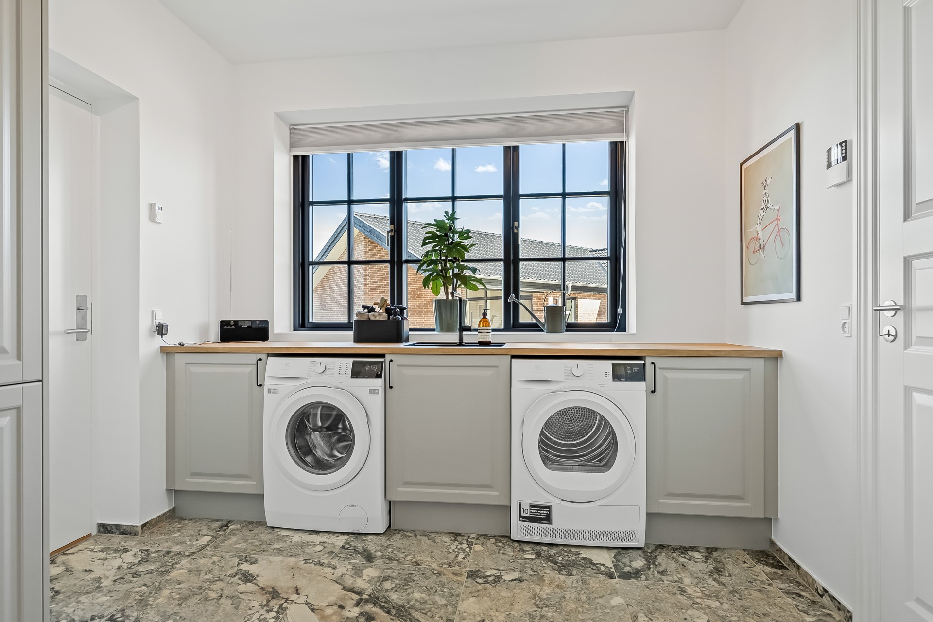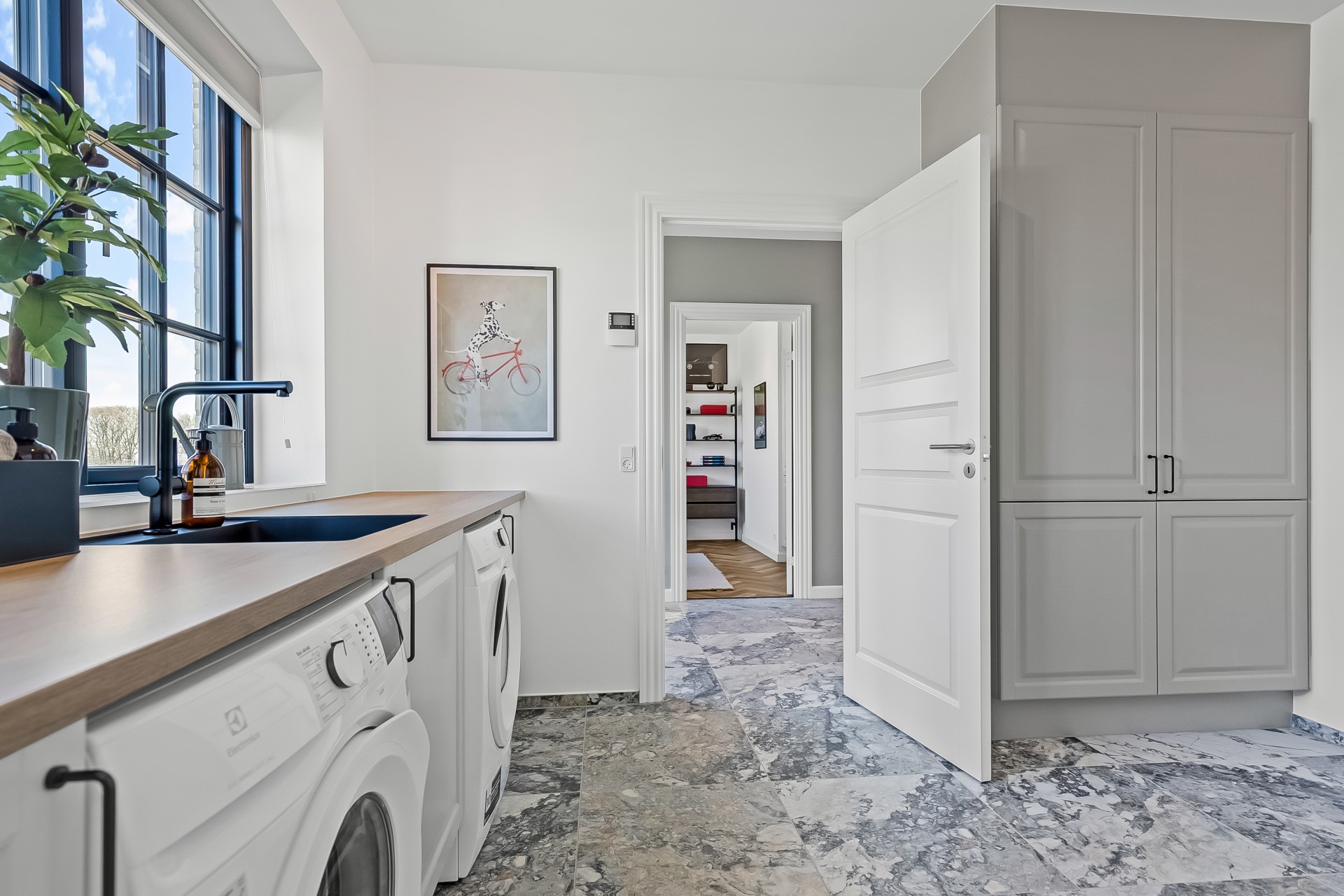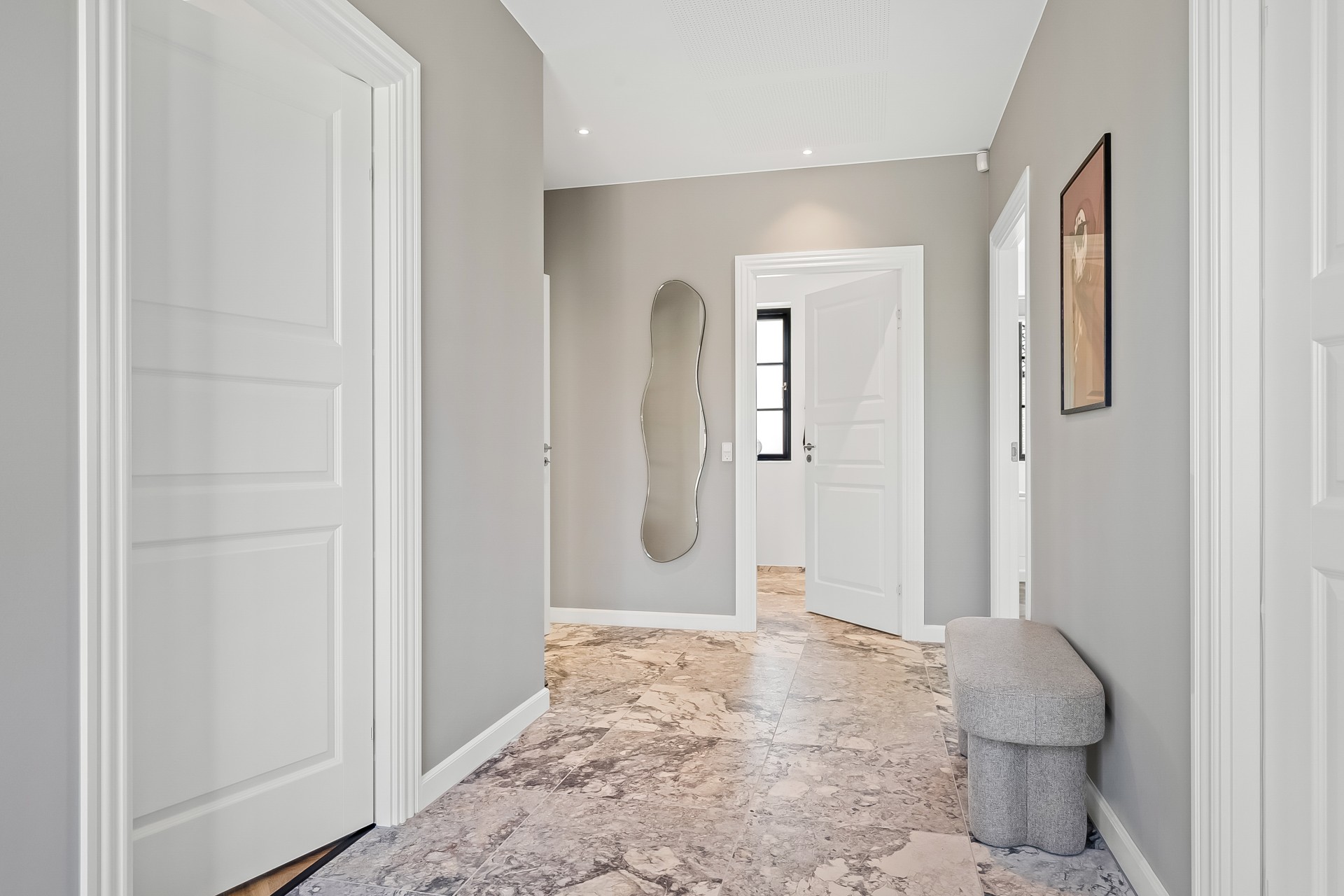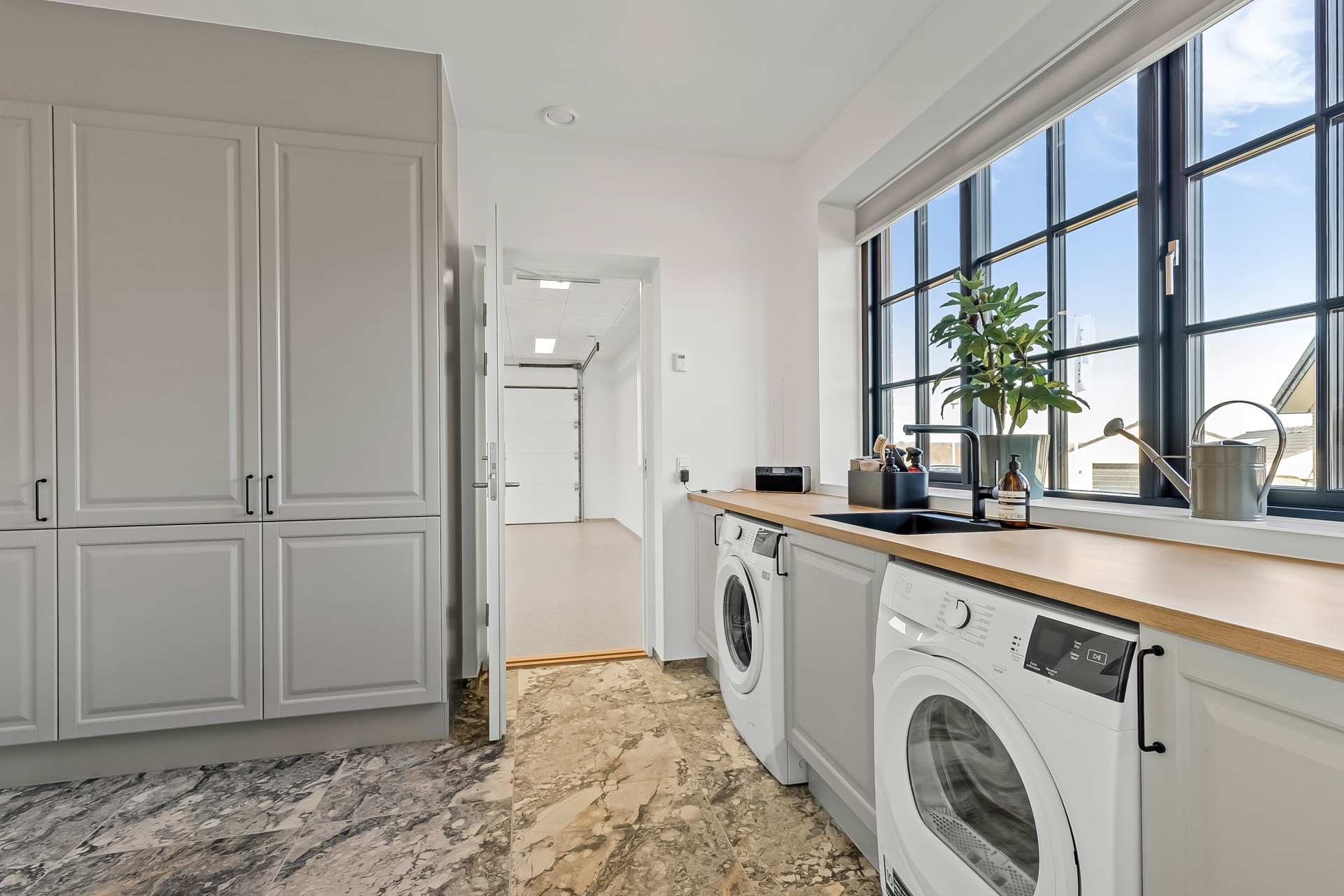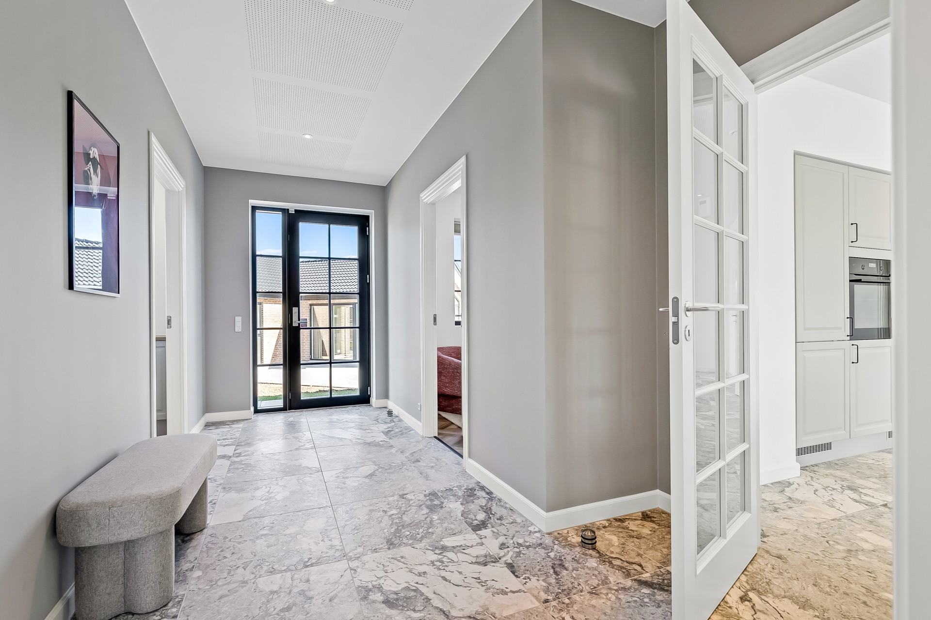 Fra den brede entré er der adgang til et rummeligt og praktisk bryggers. I hele huset er loftshøjden hævet til 262 cm. I kombination med de store gulvflader giver det en oplevelse af luft og lethed, der præger hvert eneste rum.