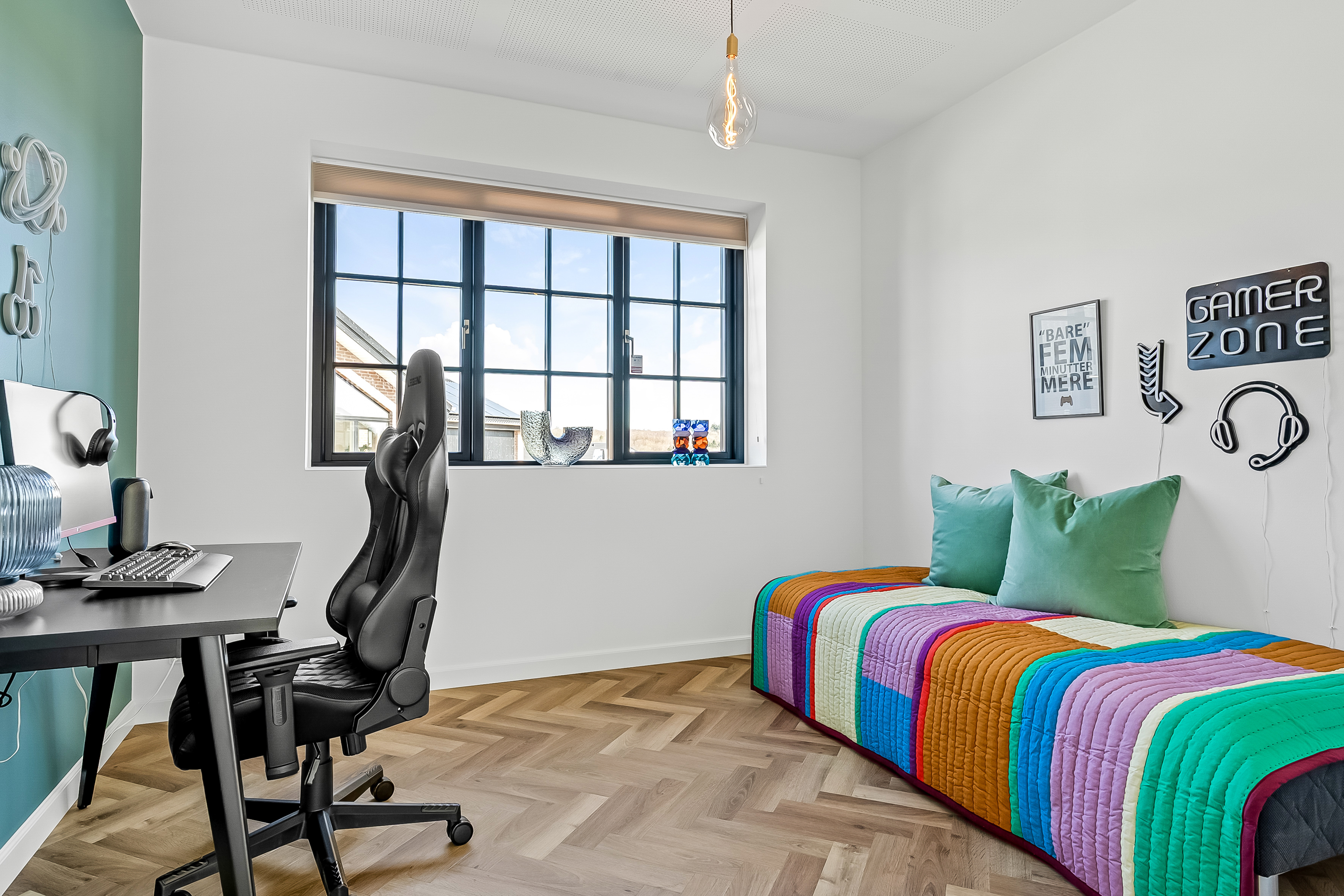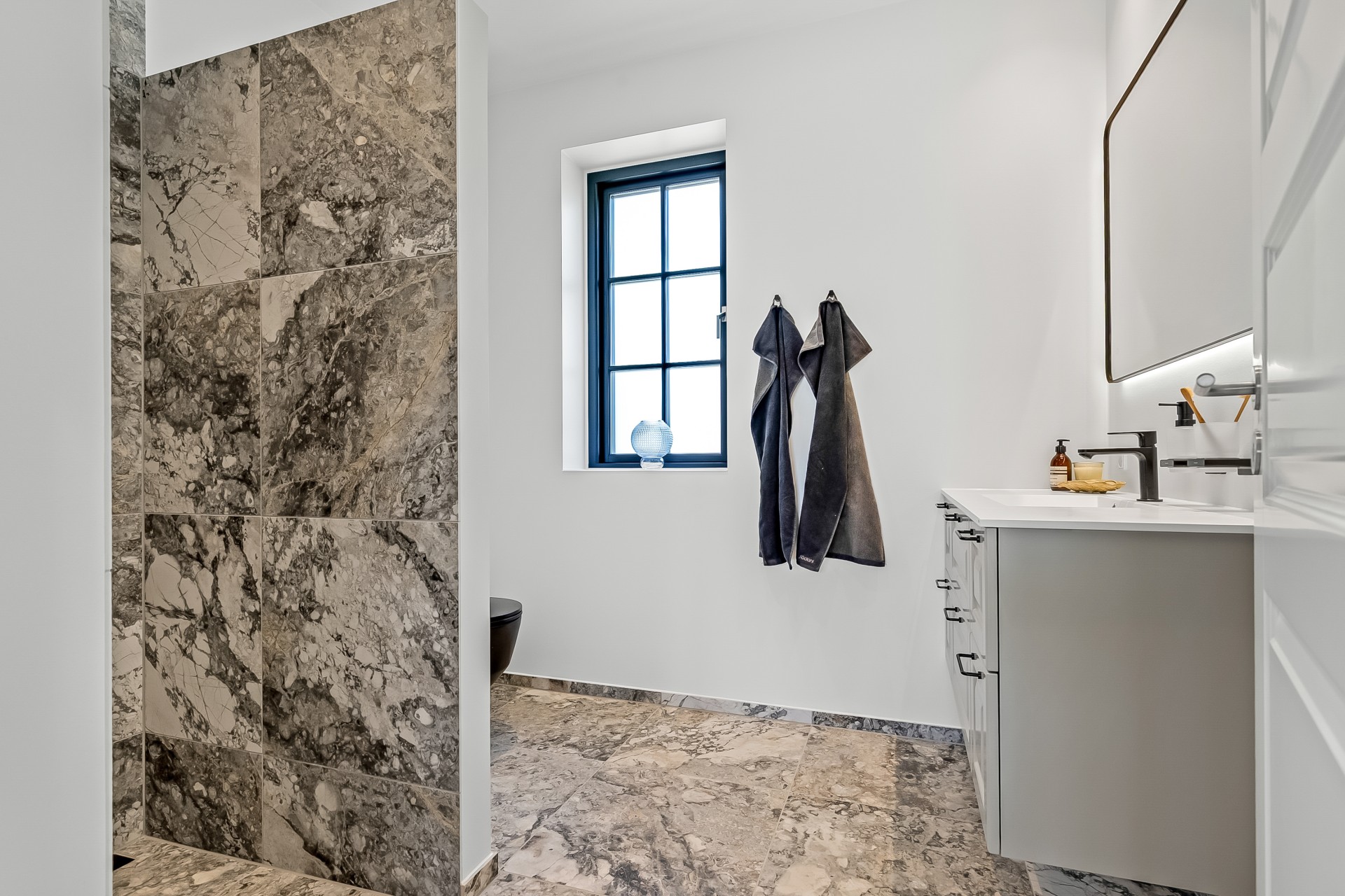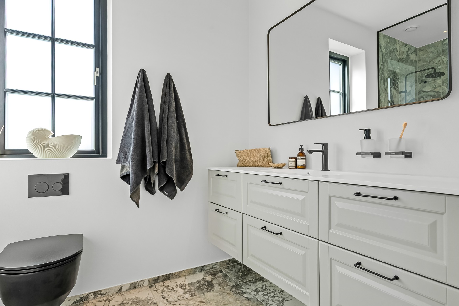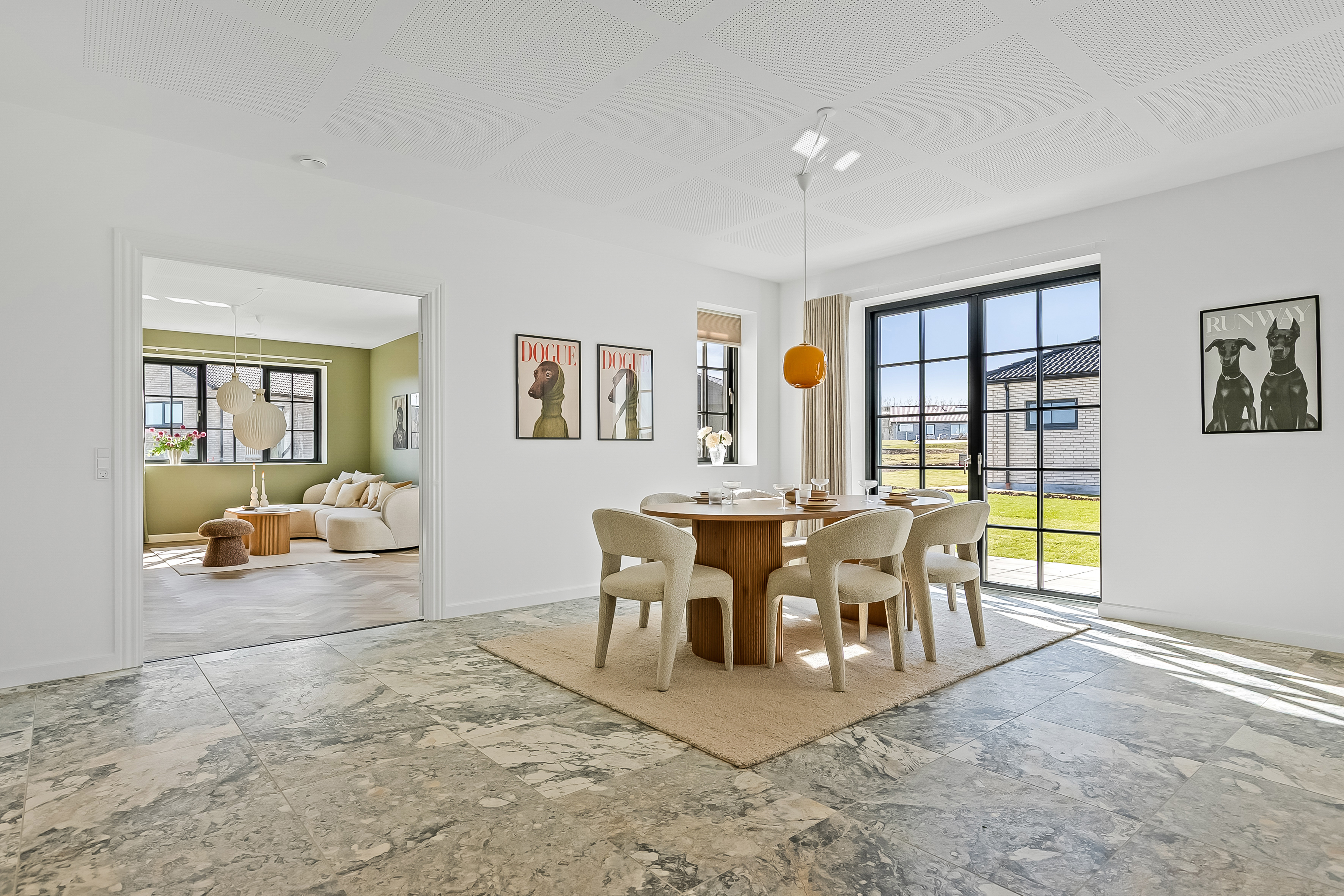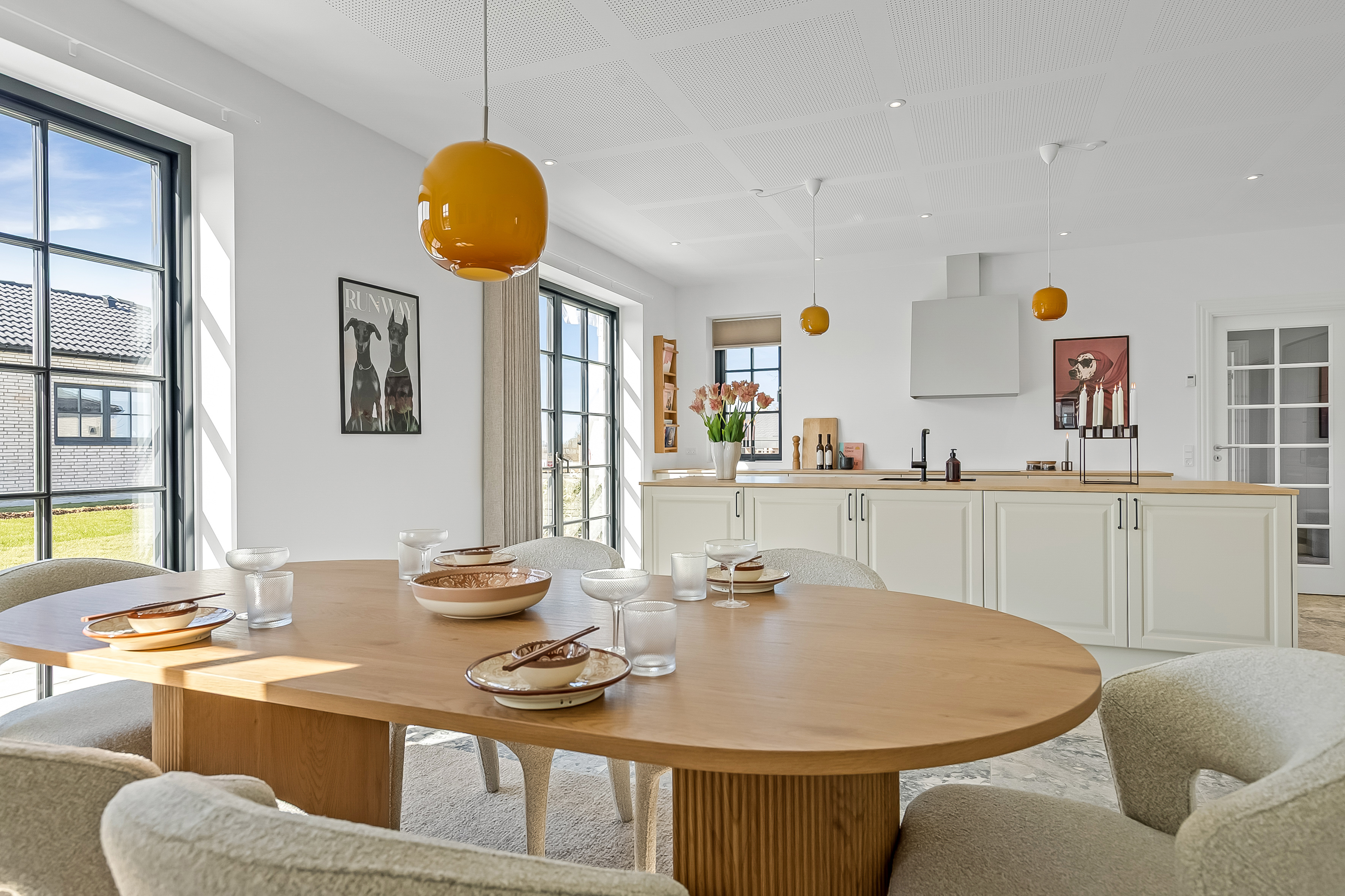 Fra den brede entré er der adgang til et rummeligt og praktisk bryggers. I hele huset er loftshøjden hævet til 262 cm. I kombination med de store gulvflader giver det en oplevelse af luft og lethed, der præger hvert eneste rum.