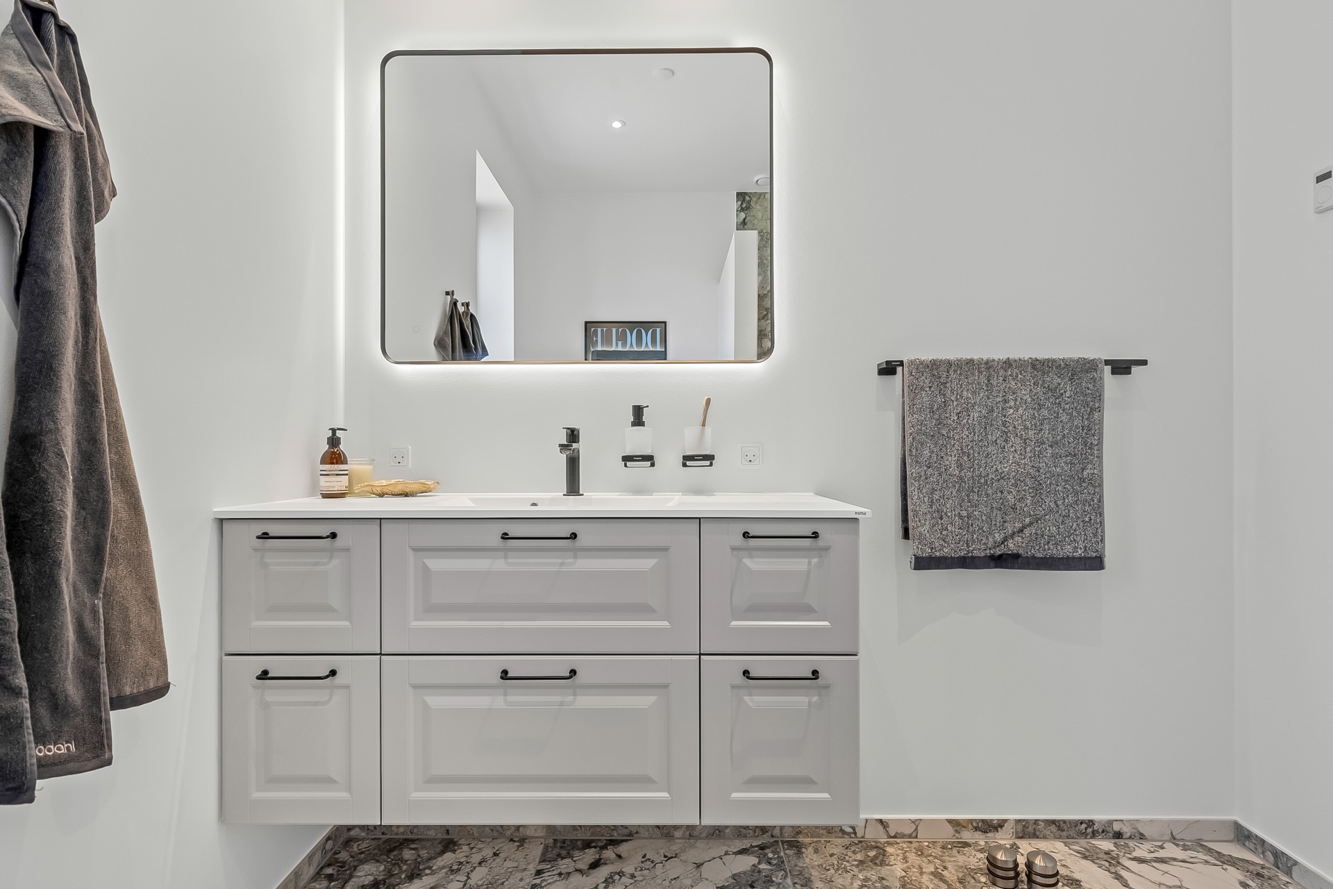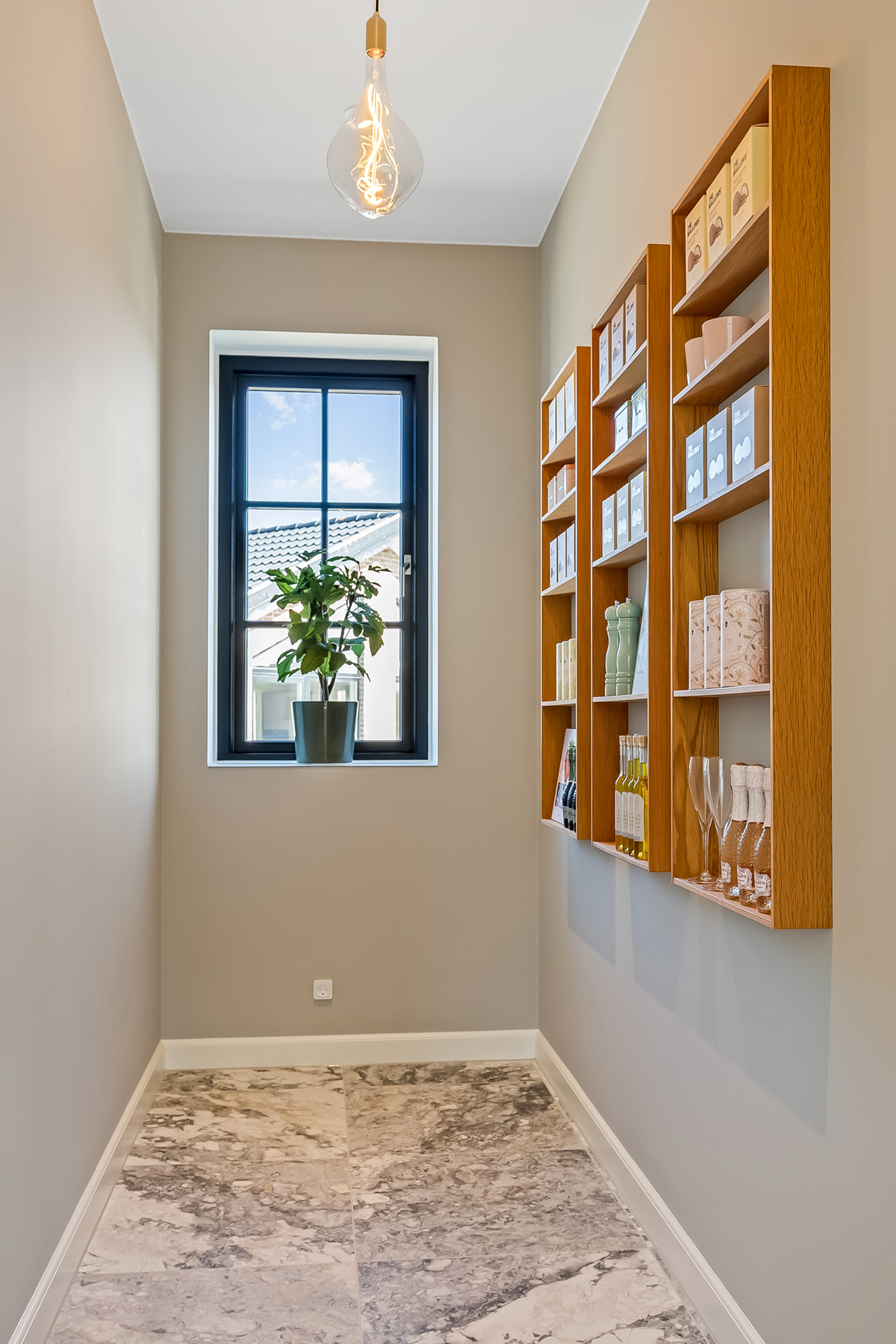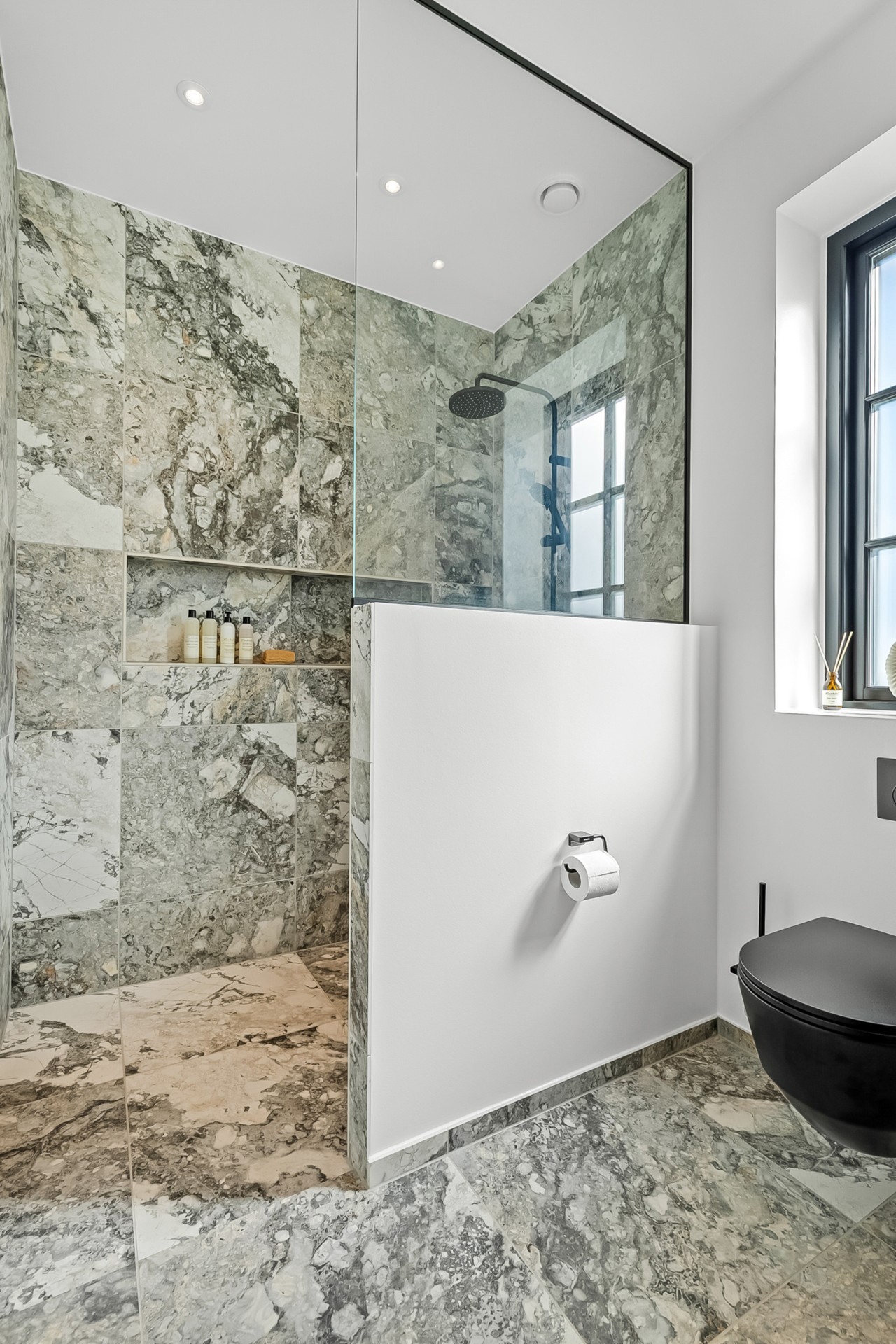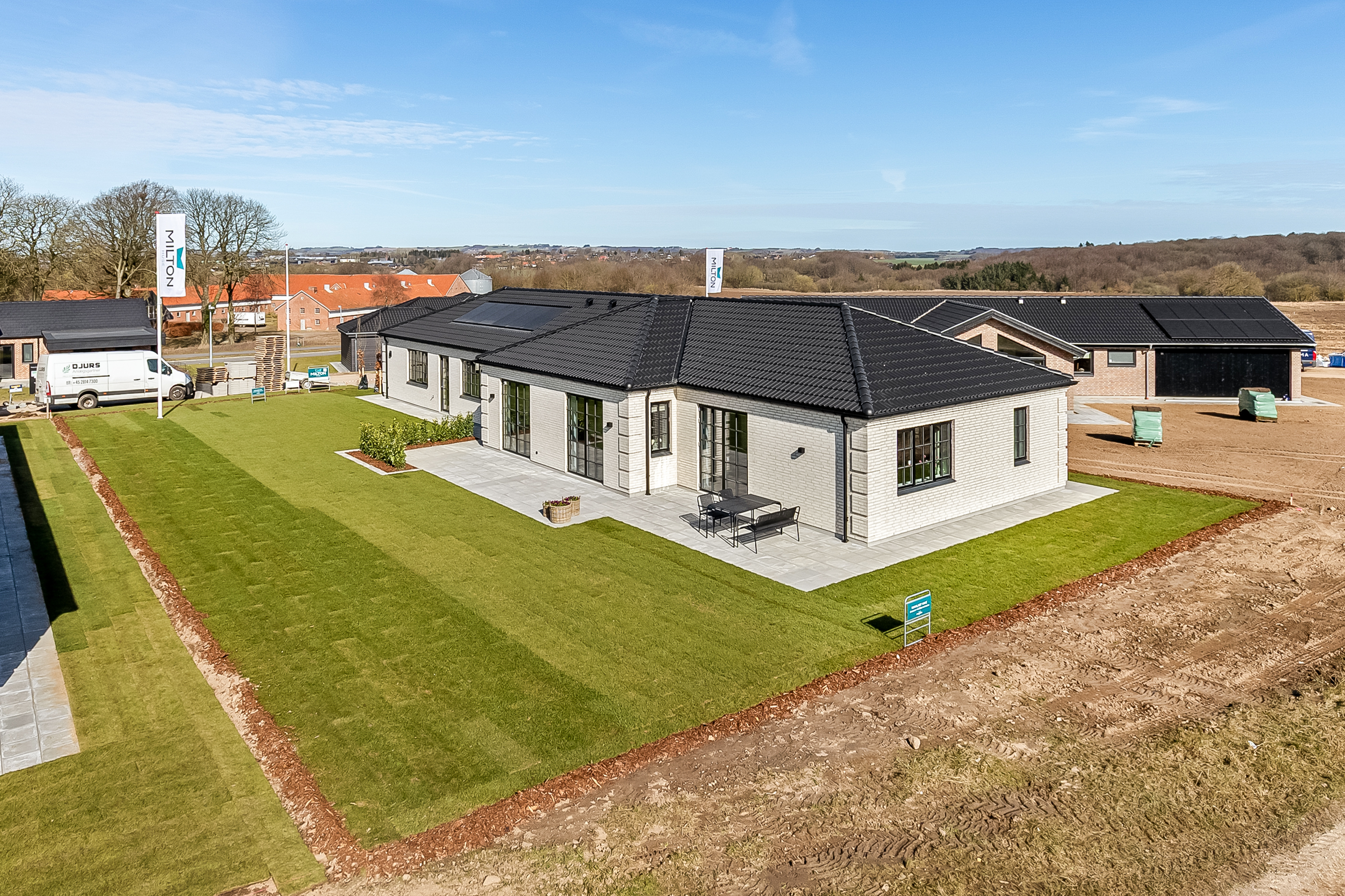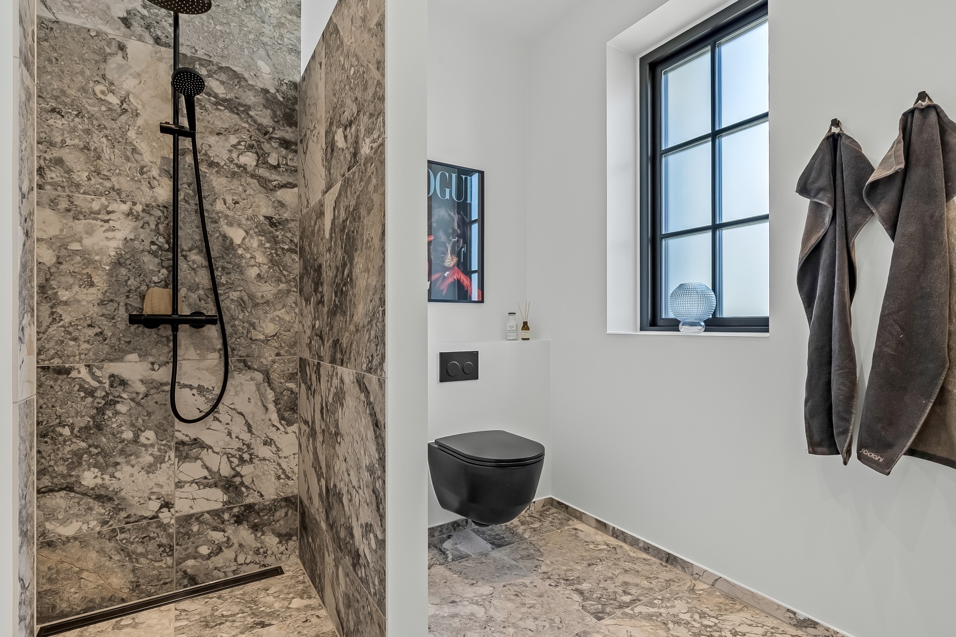 Fra den brede entré er der adgang til et rummeligt og praktisk bryggers. I hele huset er loftshøjden hævet til 262 cm. I kombination med de store gulvflader giver det en oplevelse af luft og lethed, der præger hvert eneste rum.