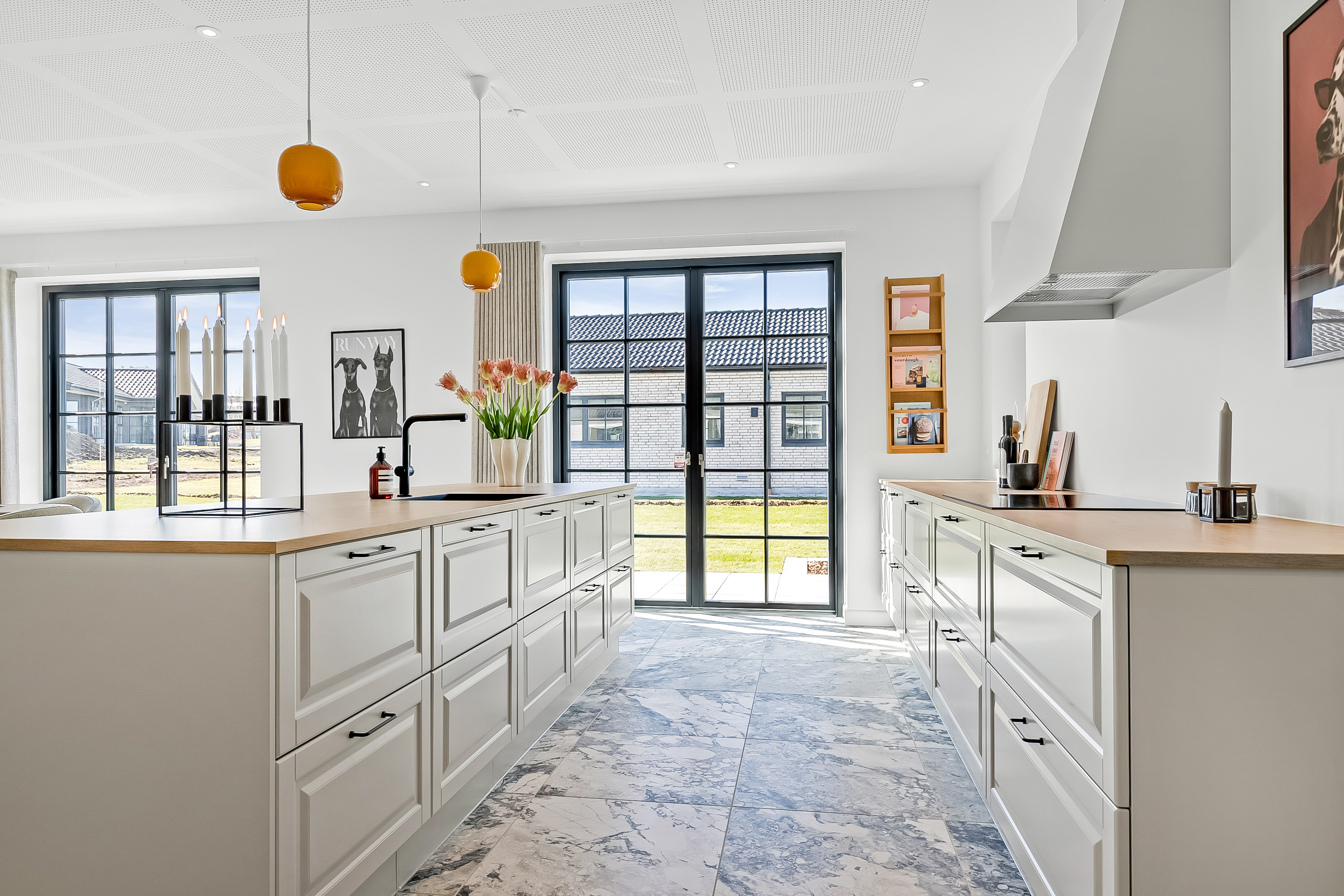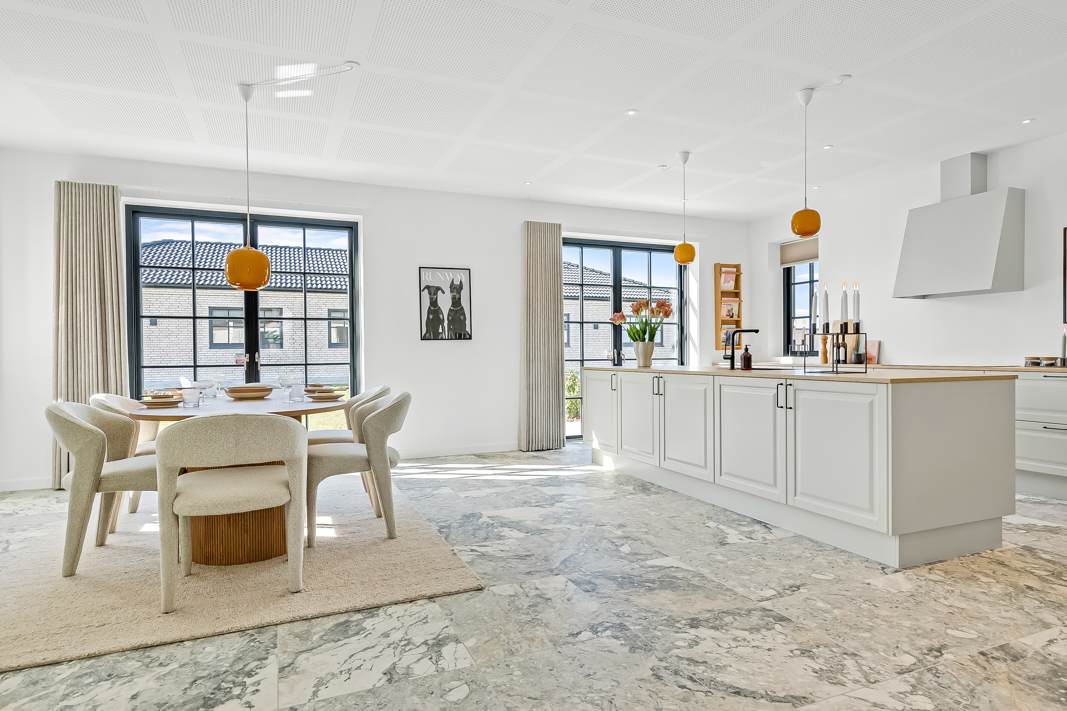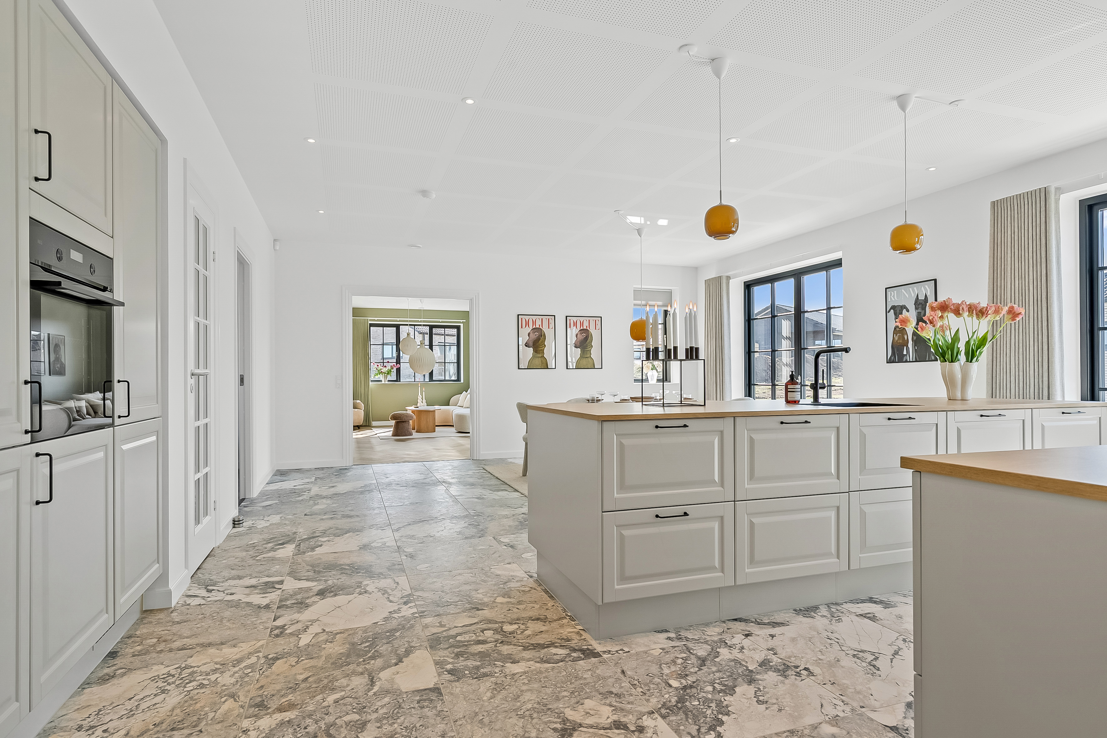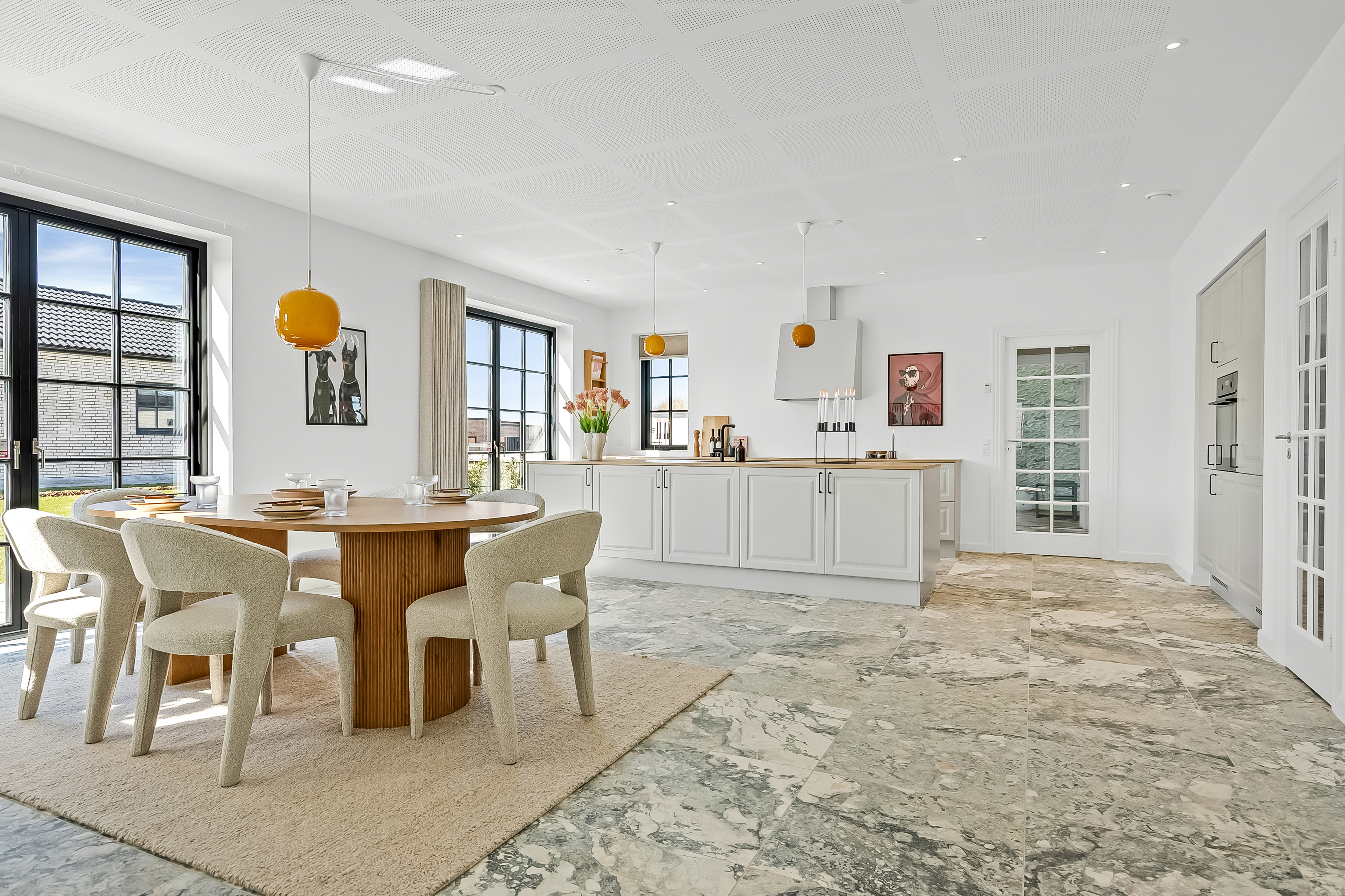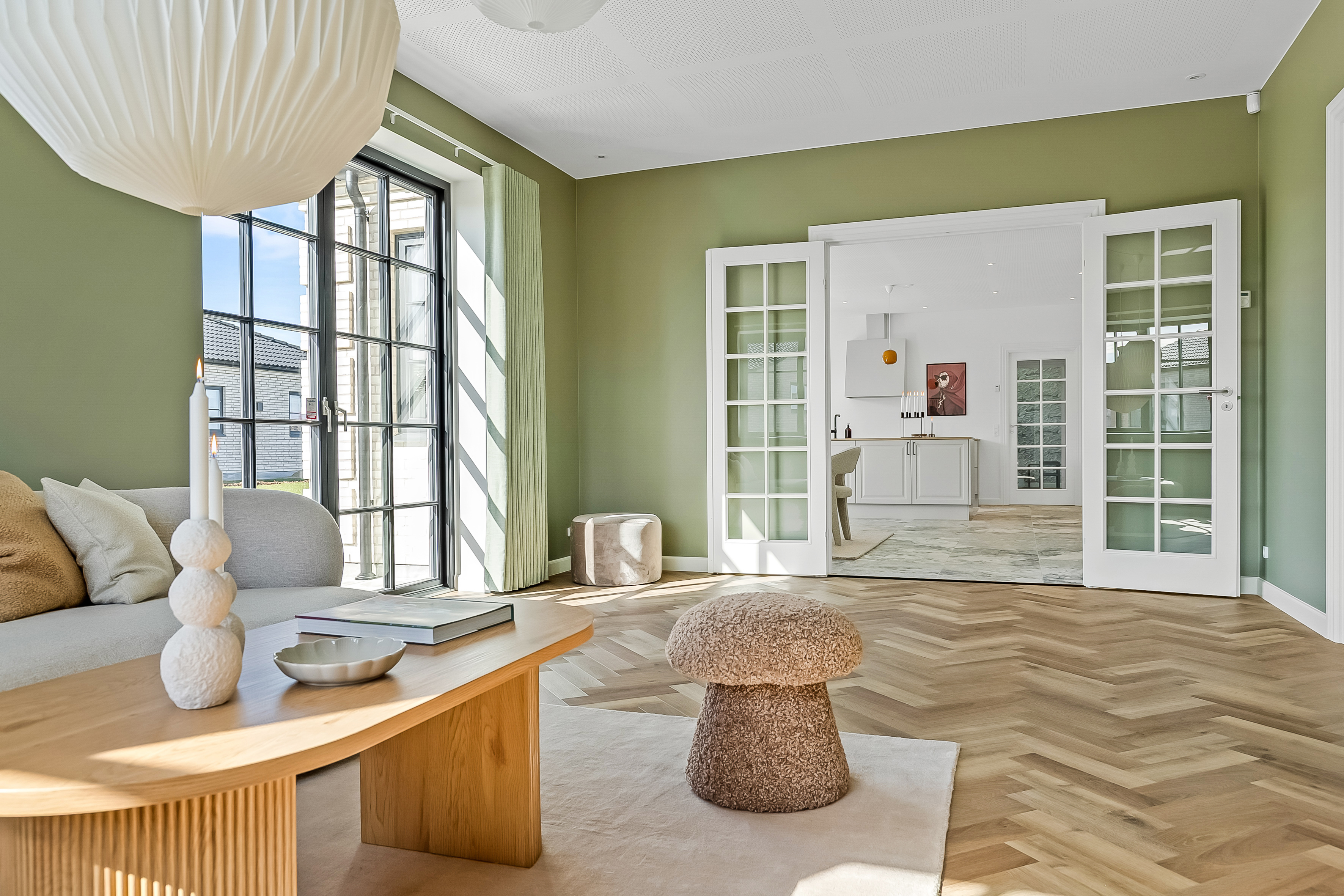 Materialevalget henter inspiration fra herskabsvillaer og fransk landstil: Sildebensgulve, formpressede døre, fyldningslåger, gerigter og lister i almuestil samt vinduer med sprosser giver boligen en gennemført og tidløs karakter. Det samme gælder de markante klinker i alrum, entré og badeværelser, der er både smukke og praktiske.