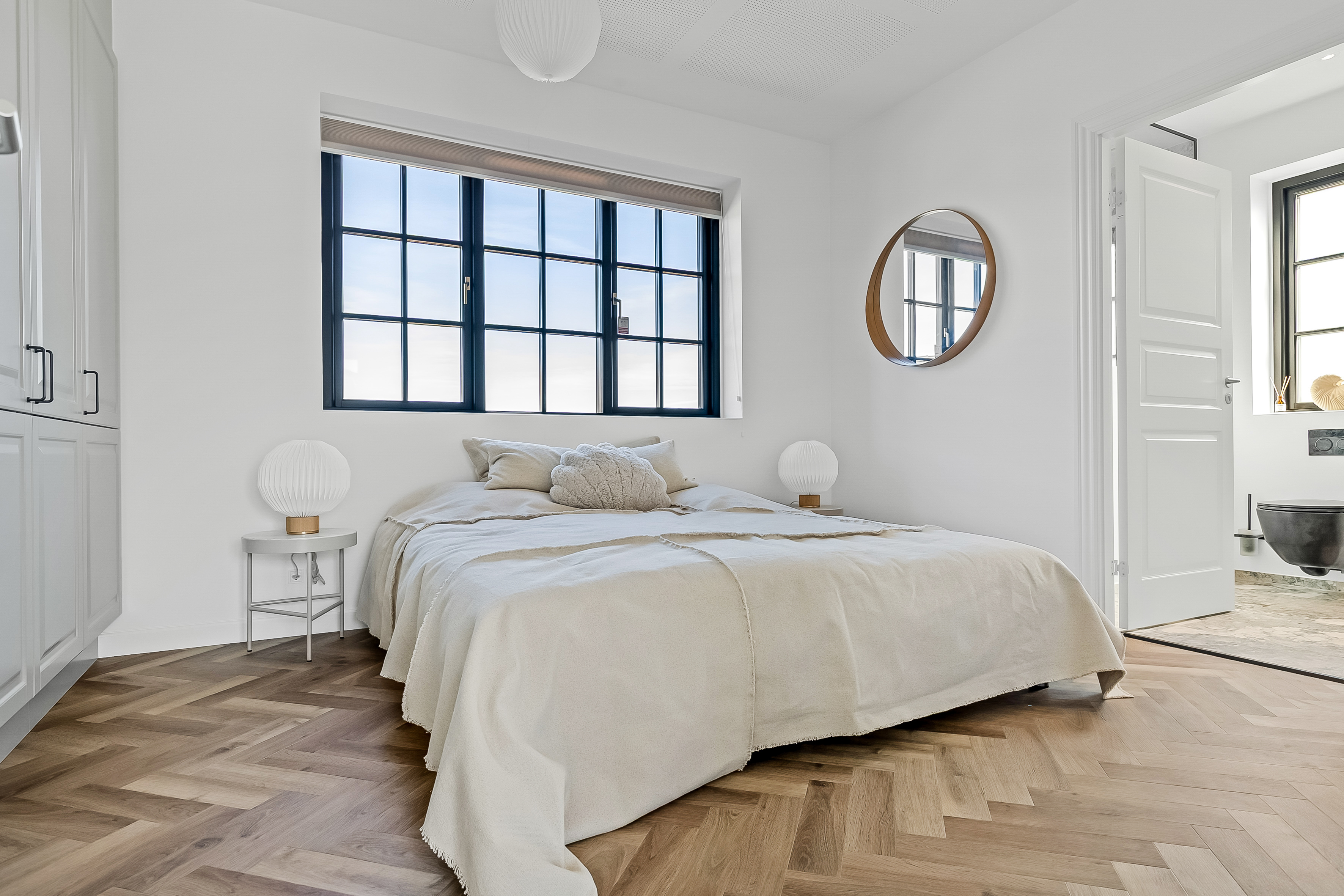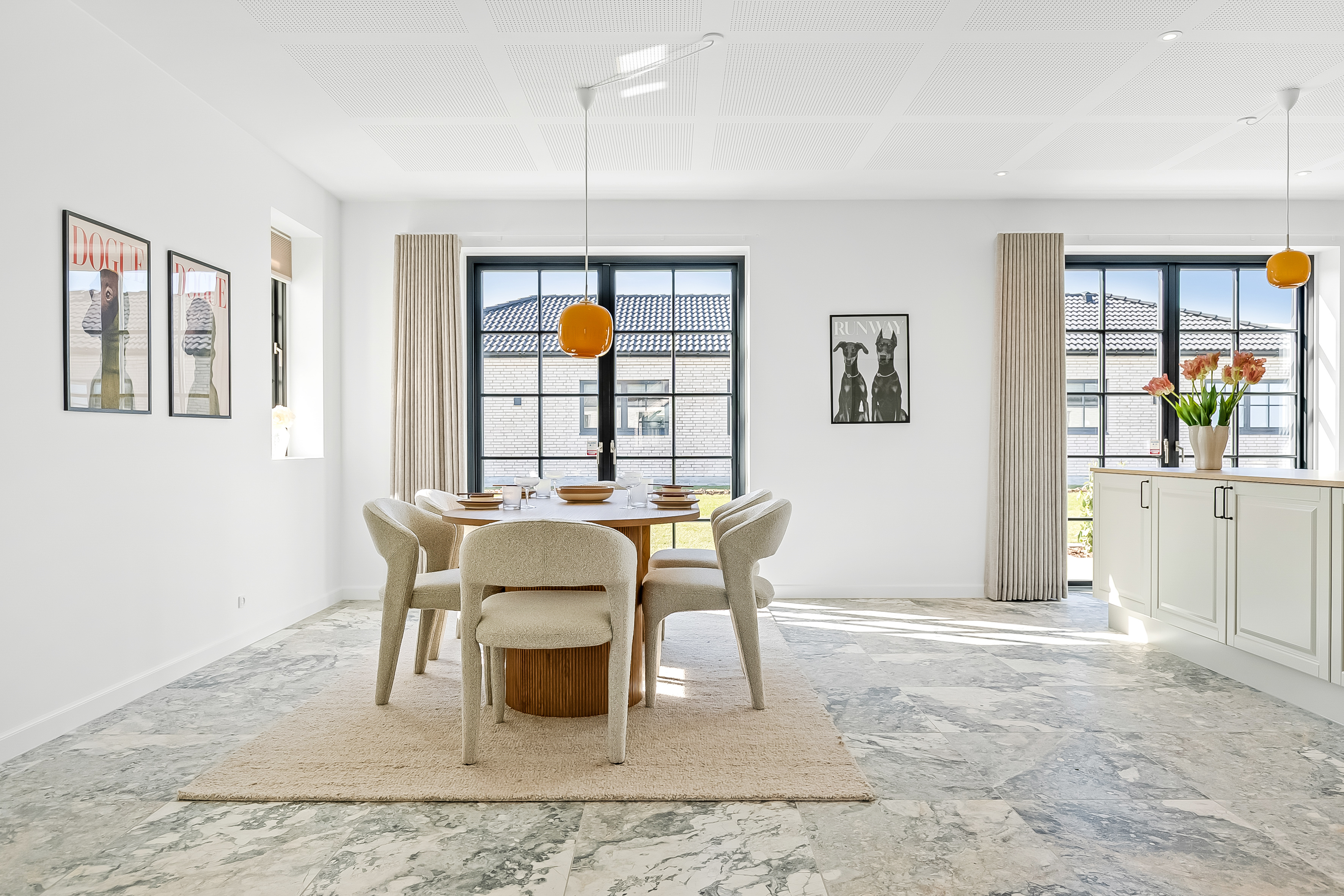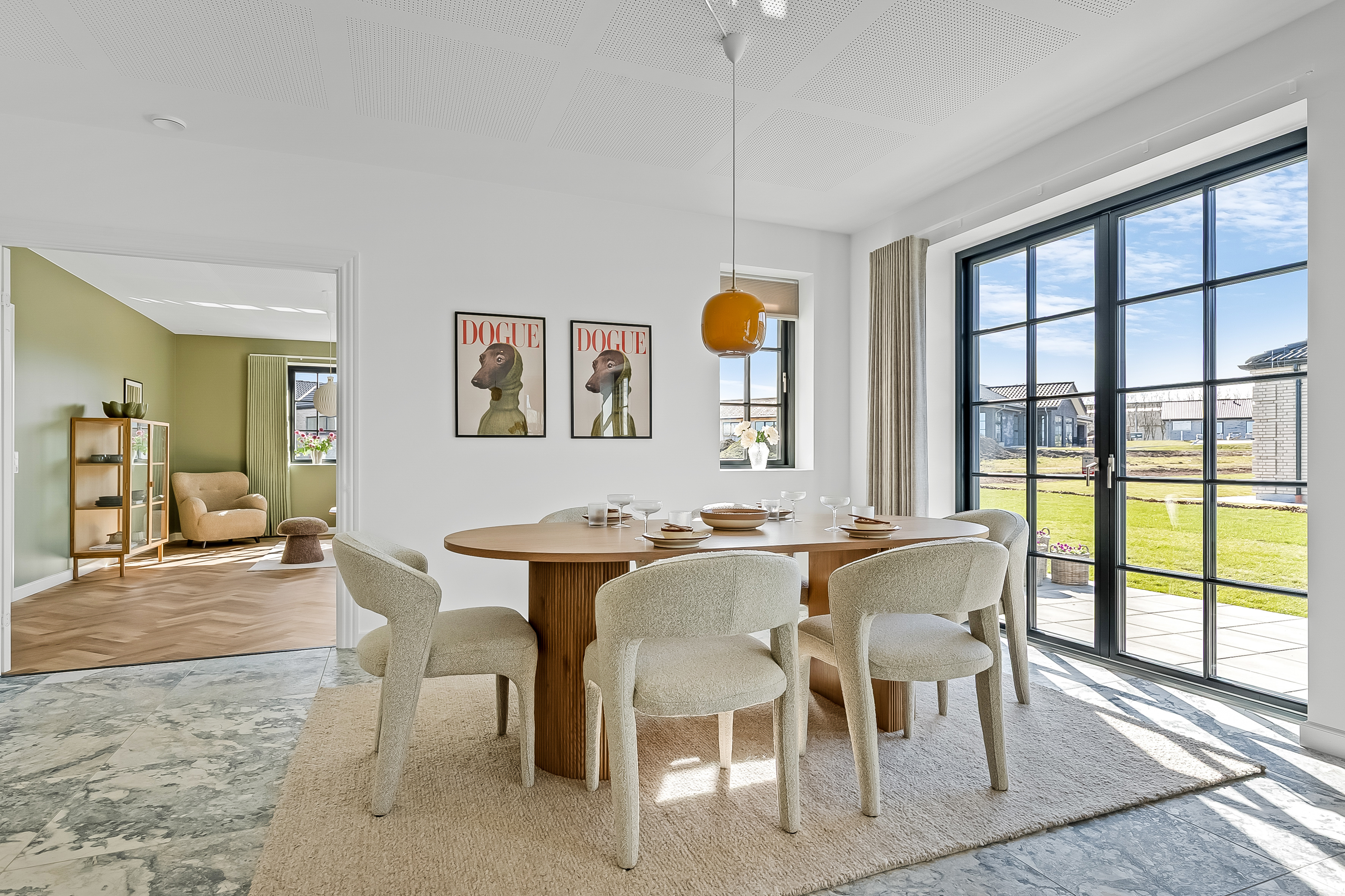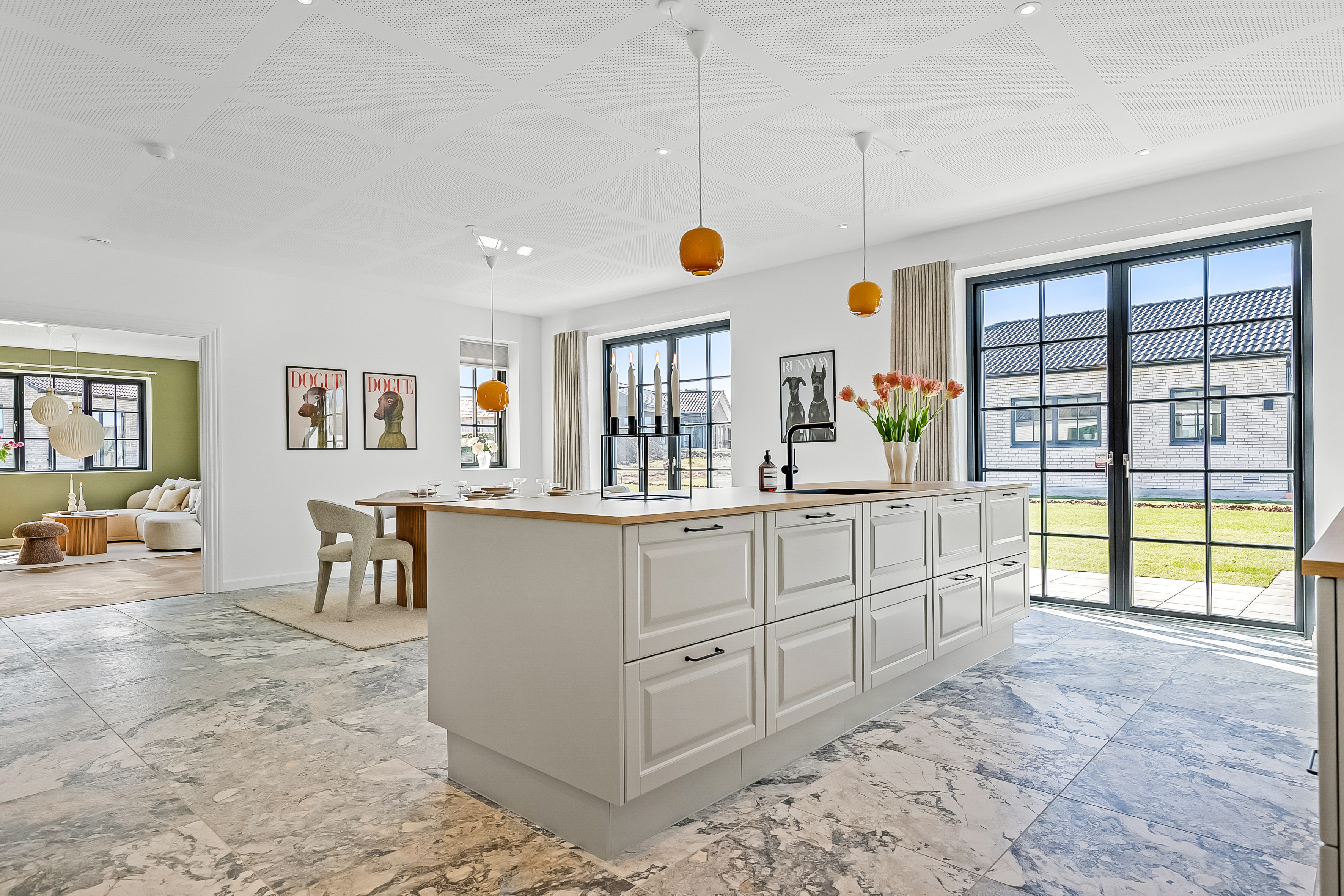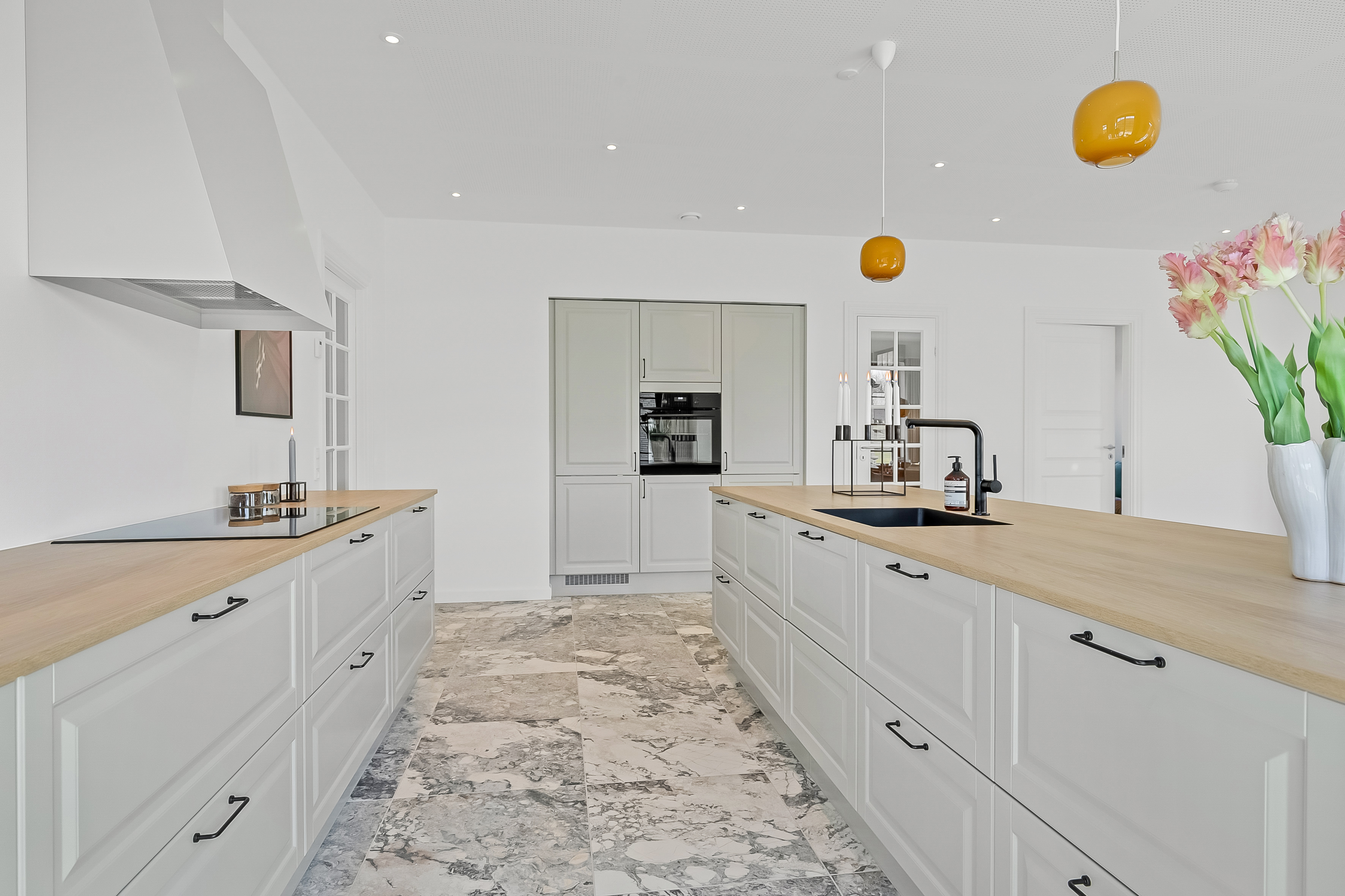 Materialevalget henter inspiration fra herskabsvillaer og fransk landstil: Sildebensgulve, formpressede døre, fyldningslåger, gerigter og lister i almuestil samt vinduer med sprosser giver boligen en gennemført og tidløs karakter. Det samme gælder de markante klinker i alrum, entré og badeværelser, der er både smukke og praktiske.
