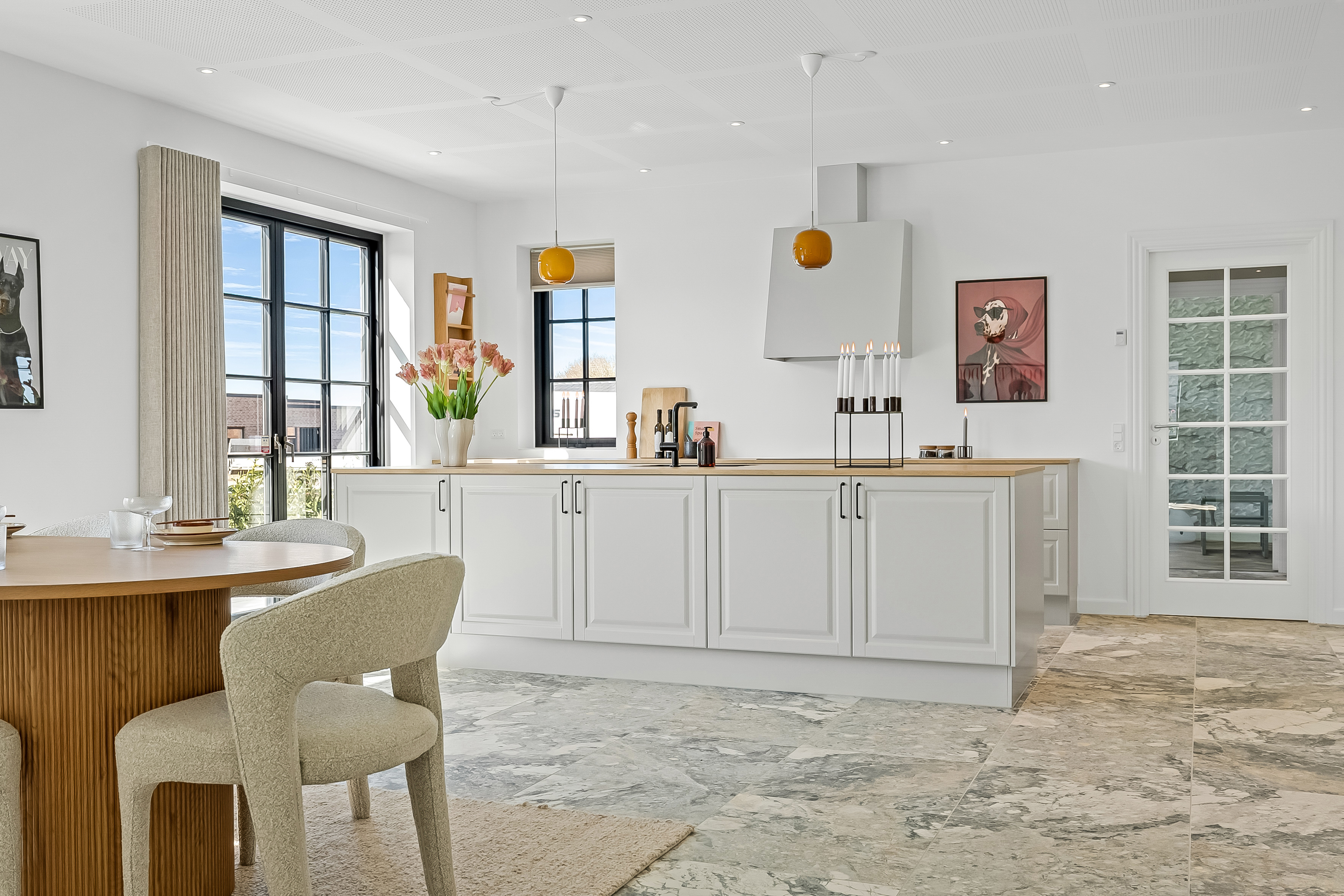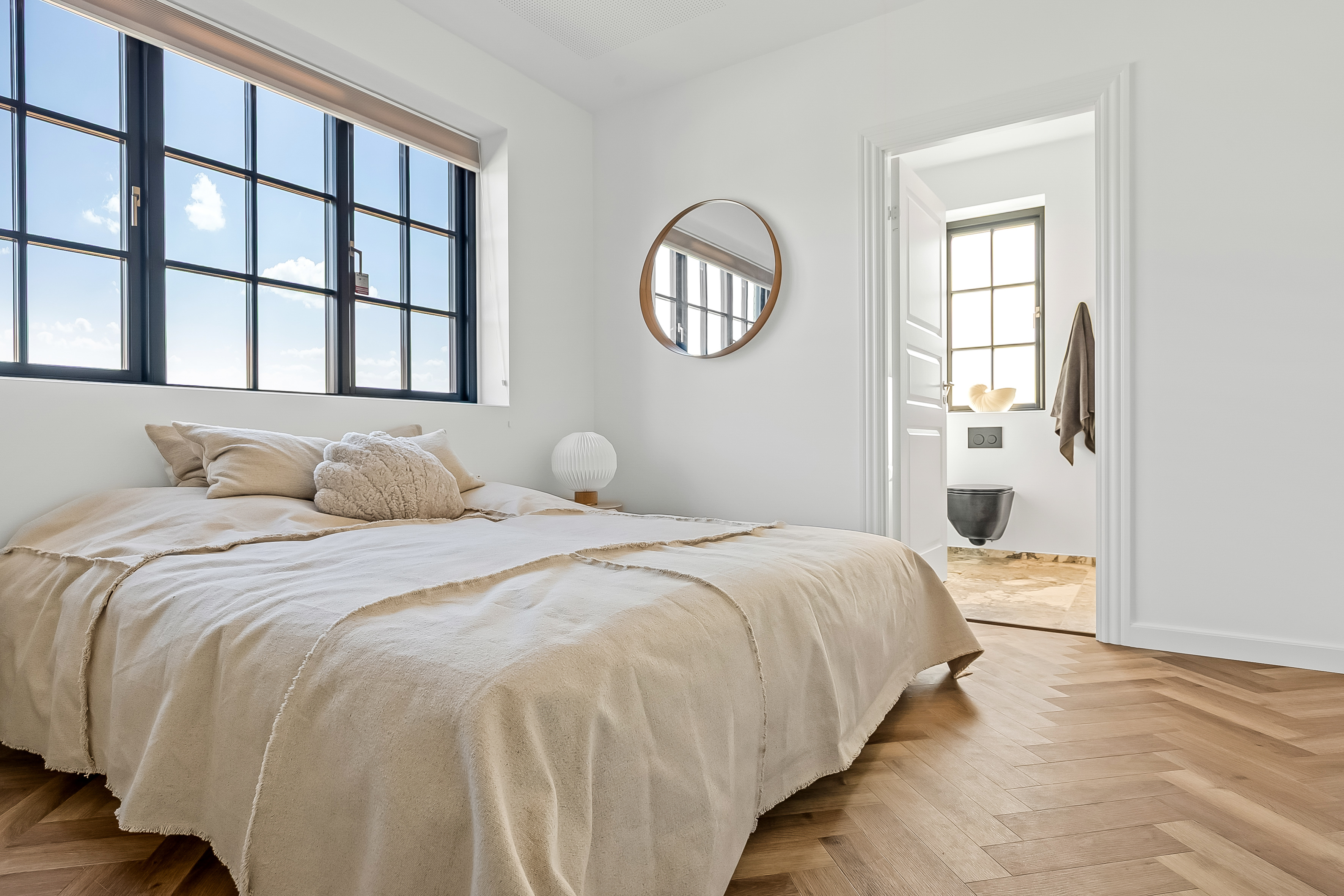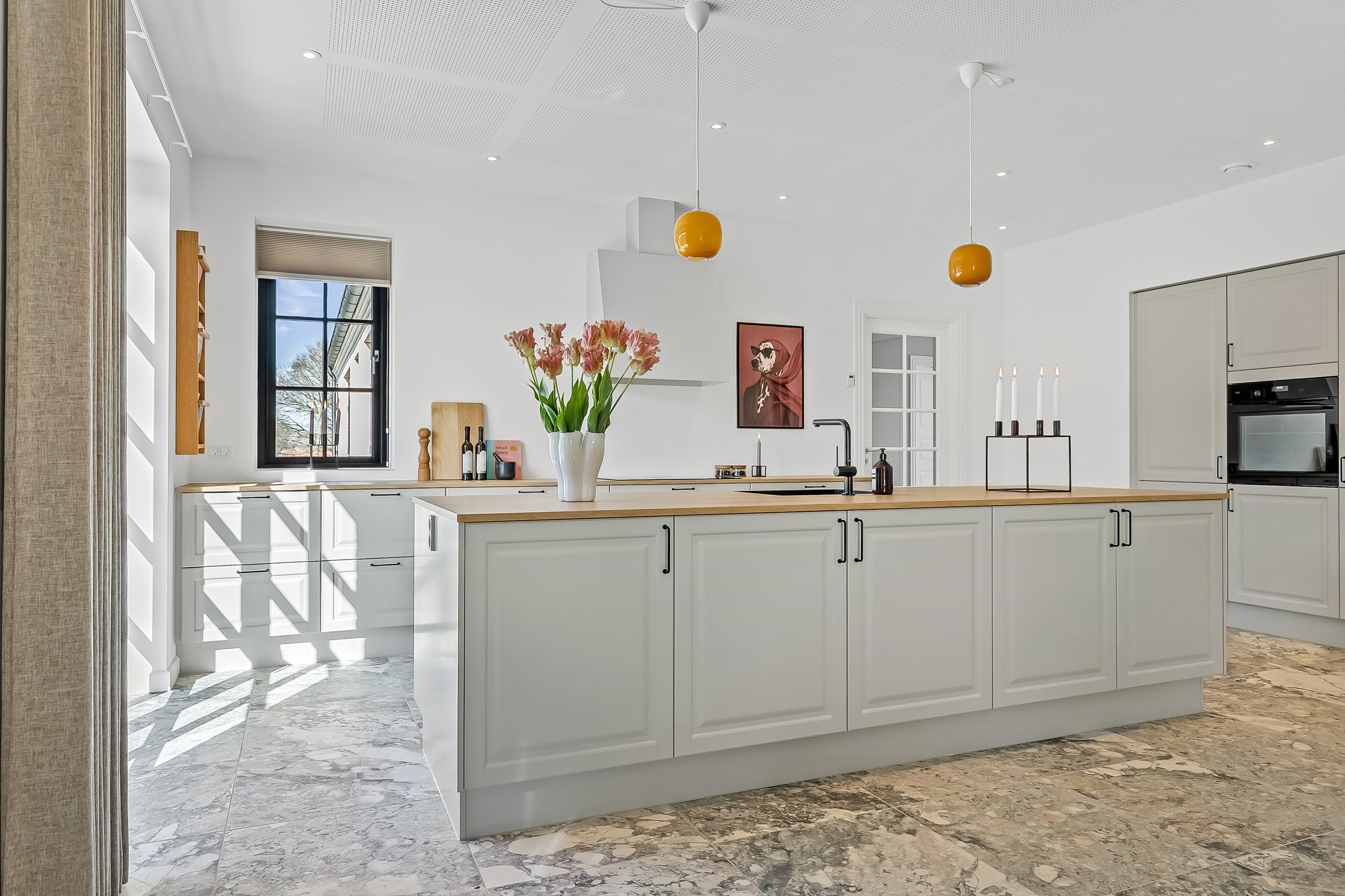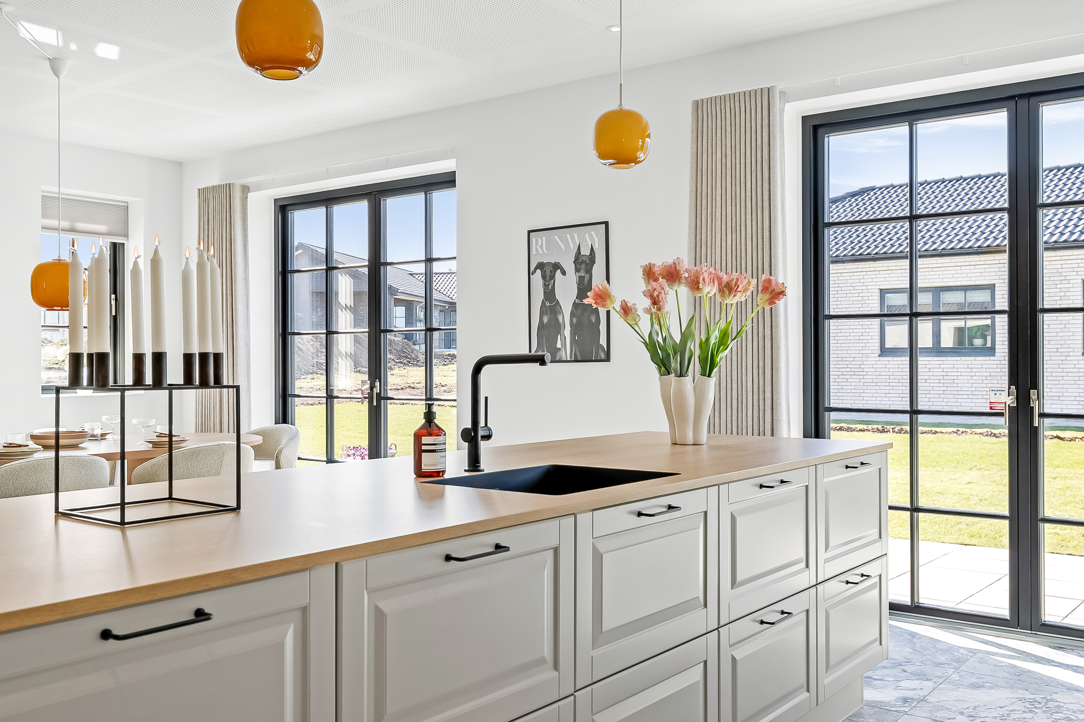 Materialevalget henter inspiration fra herskabsvillaer og fransk landstil: Sildebensgulve, formpressede døre, fyldningslåger, gerigter og lister i almuestil samt vinduer med sprosser giver boligen en gennemført og tidløs karakter. Det samme gælder de markante klinker i alrum, entré og badeværelser, der er både smukke og praktiske.