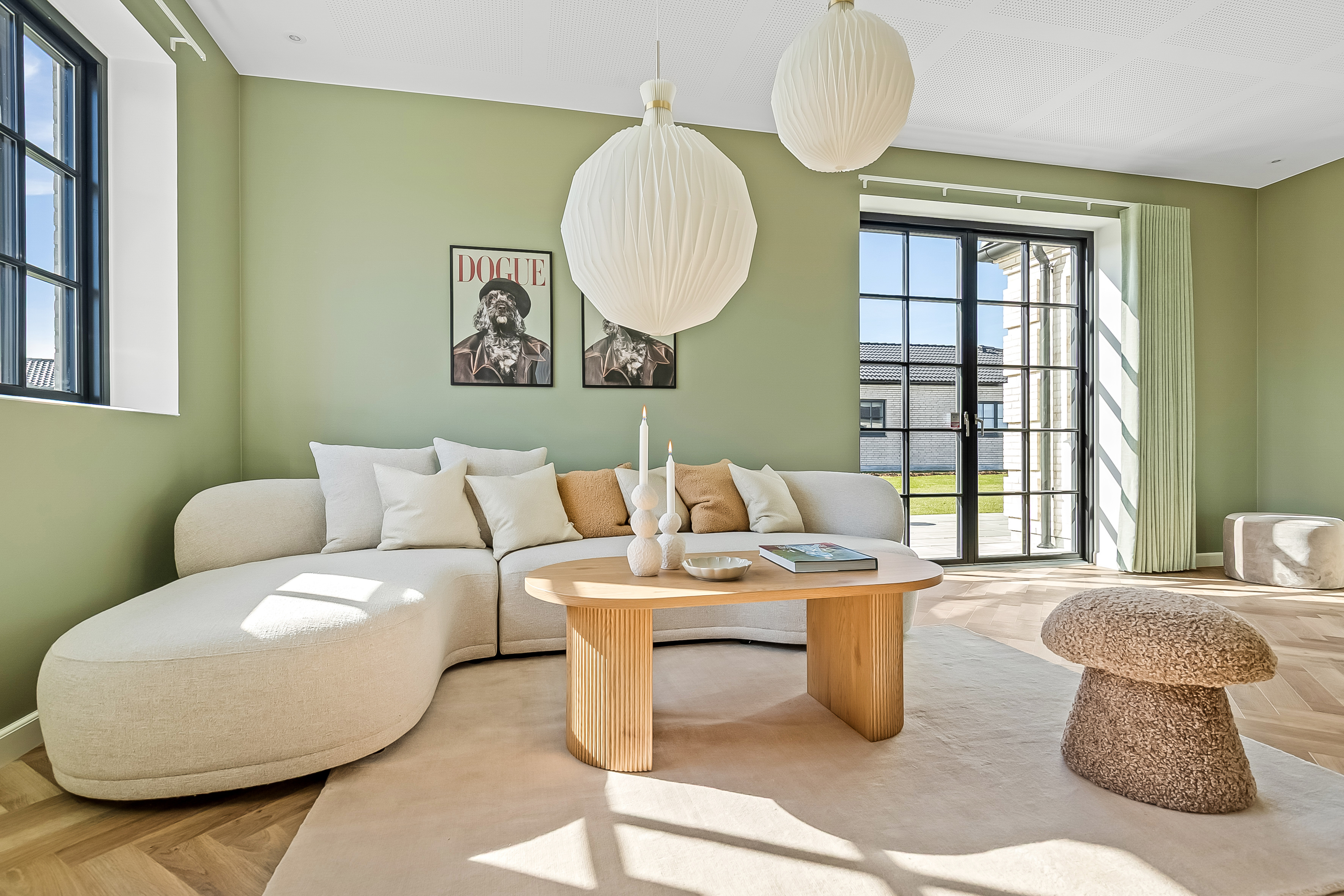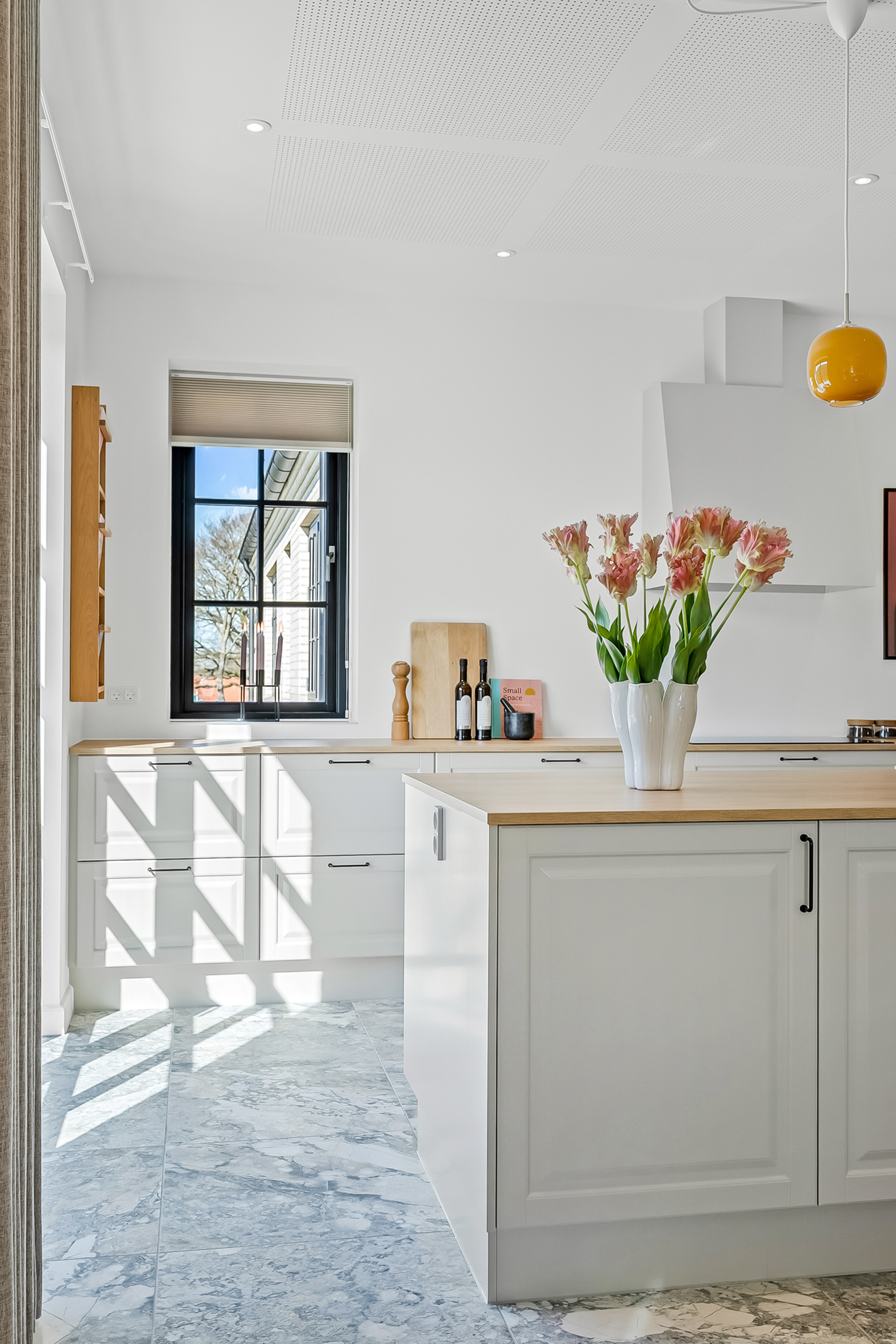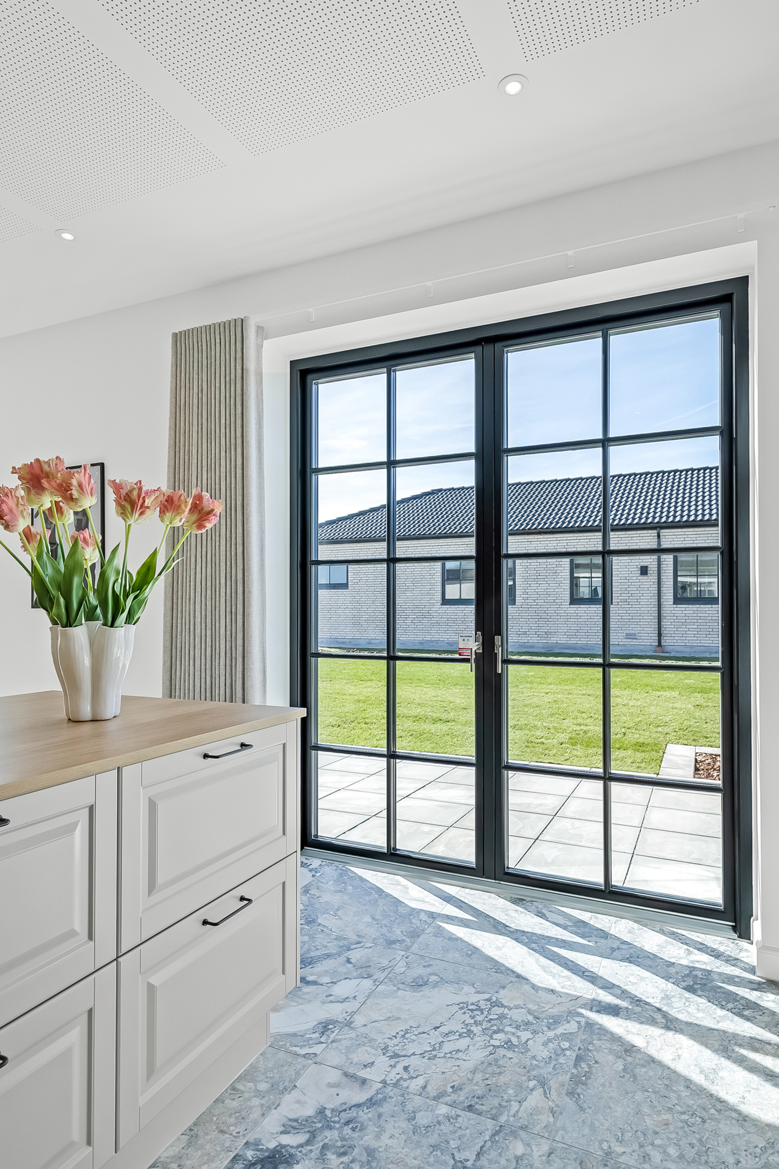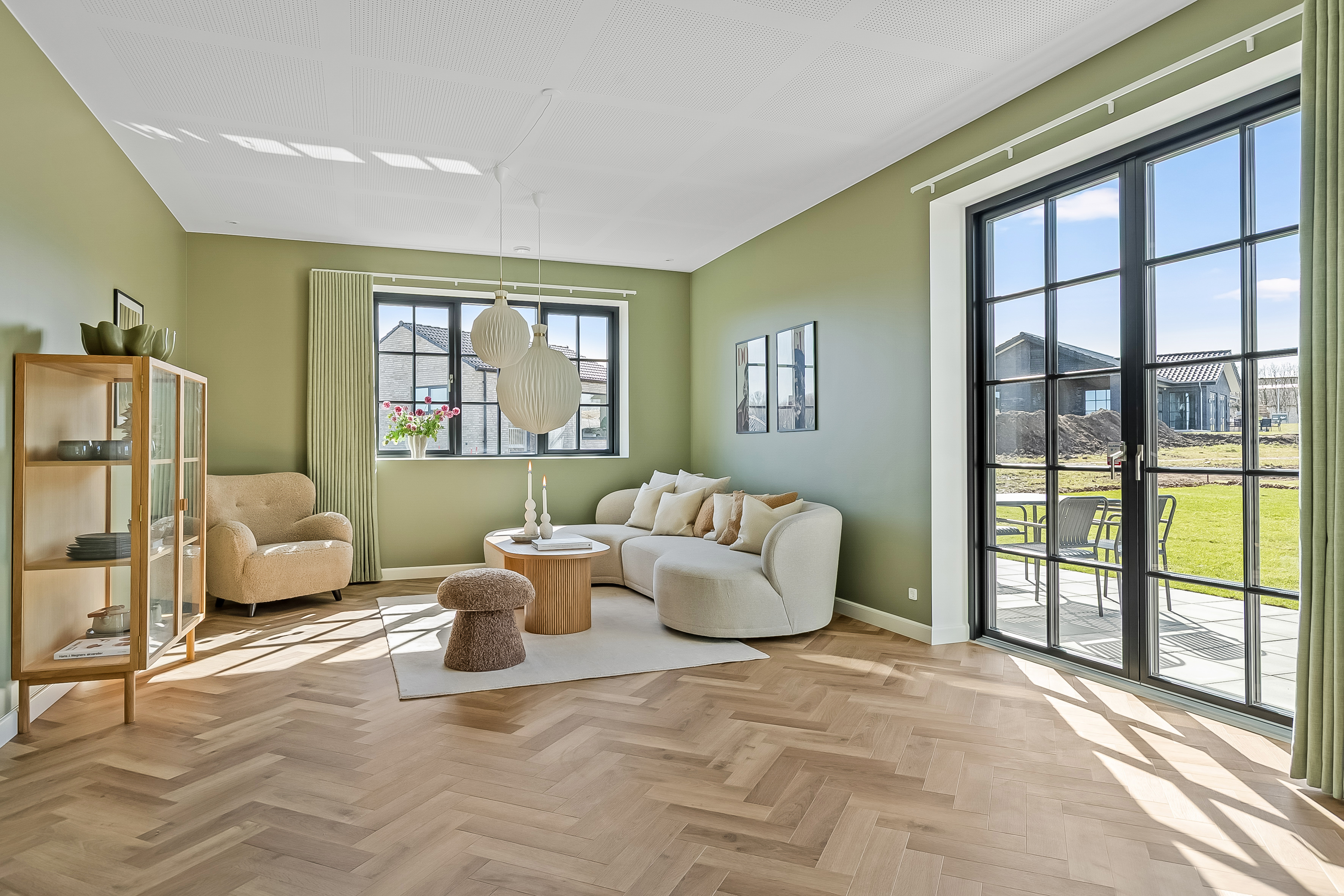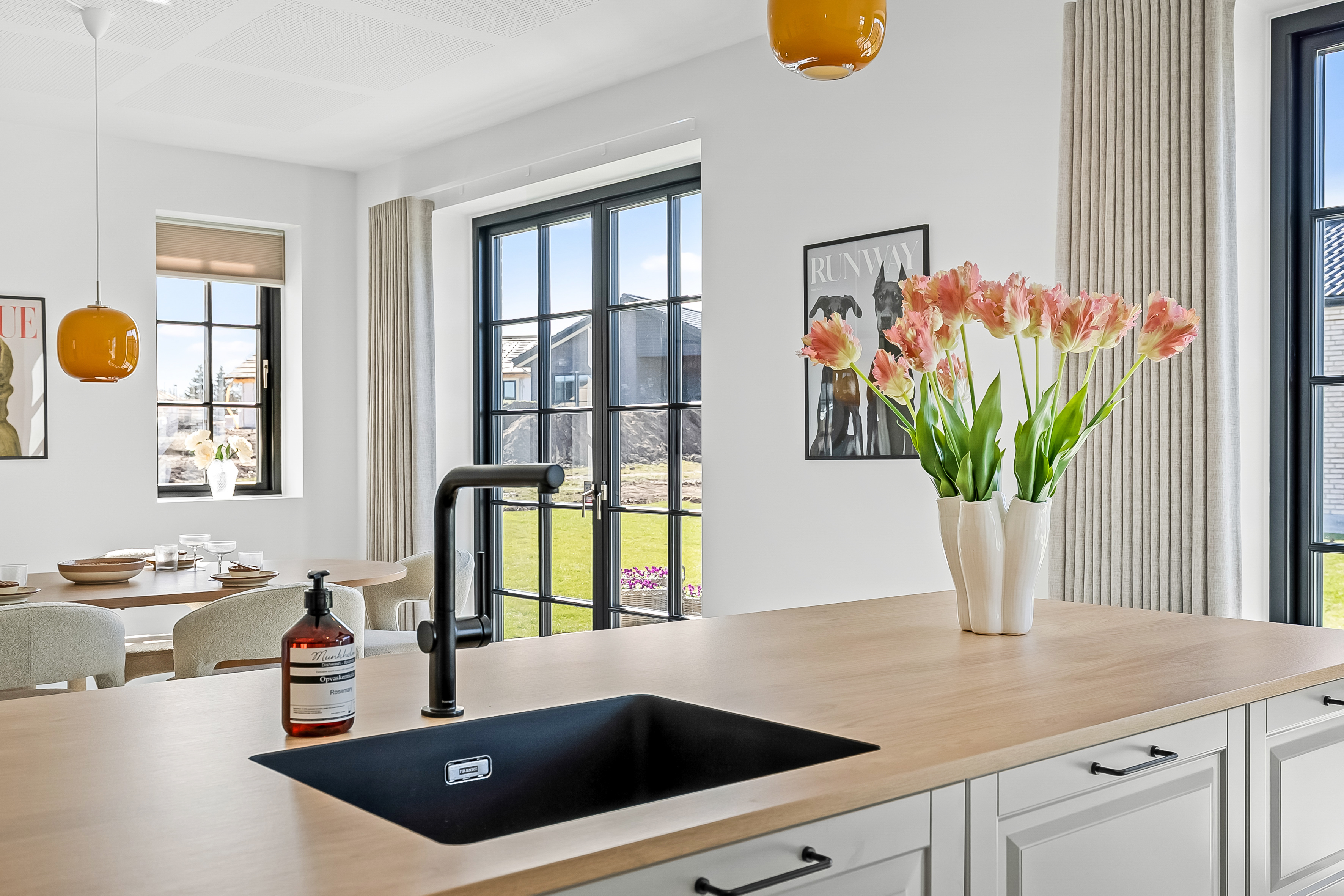 Materialevalget henter inspiration fra herskabsvillaer og fransk landstil: Sildebensgulve, formpressede døre, fyldningslåger, gerigter og lister i almuestil samt vinduer med sprosser giver boligen en gennemført og tidløs karakter. Det samme gælder de markante klinker i alrum, entré og badeværelser, der er både smukke og praktiske.