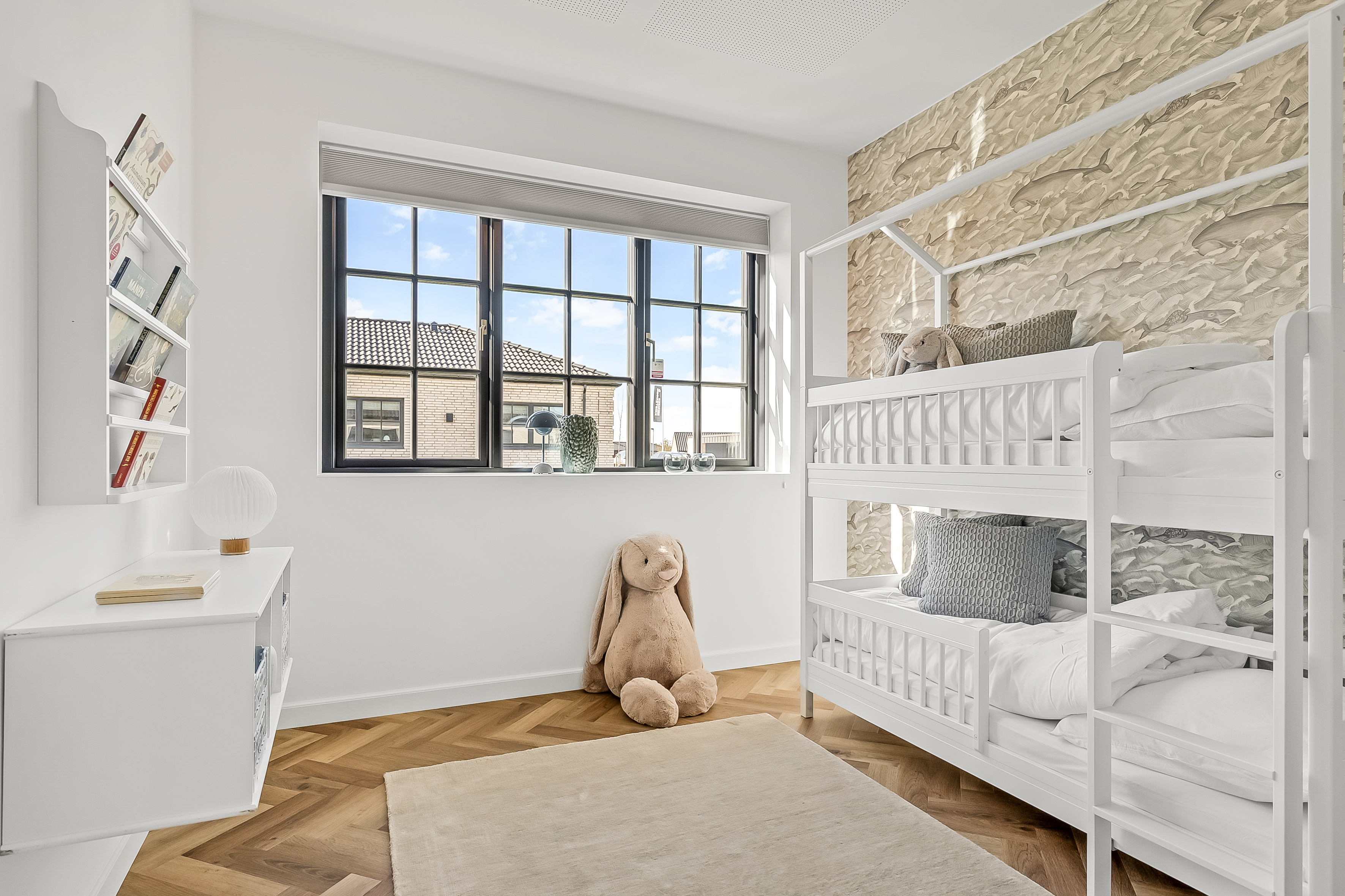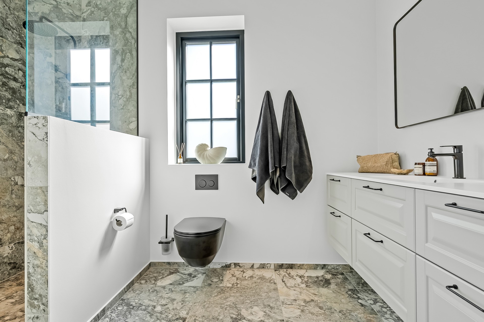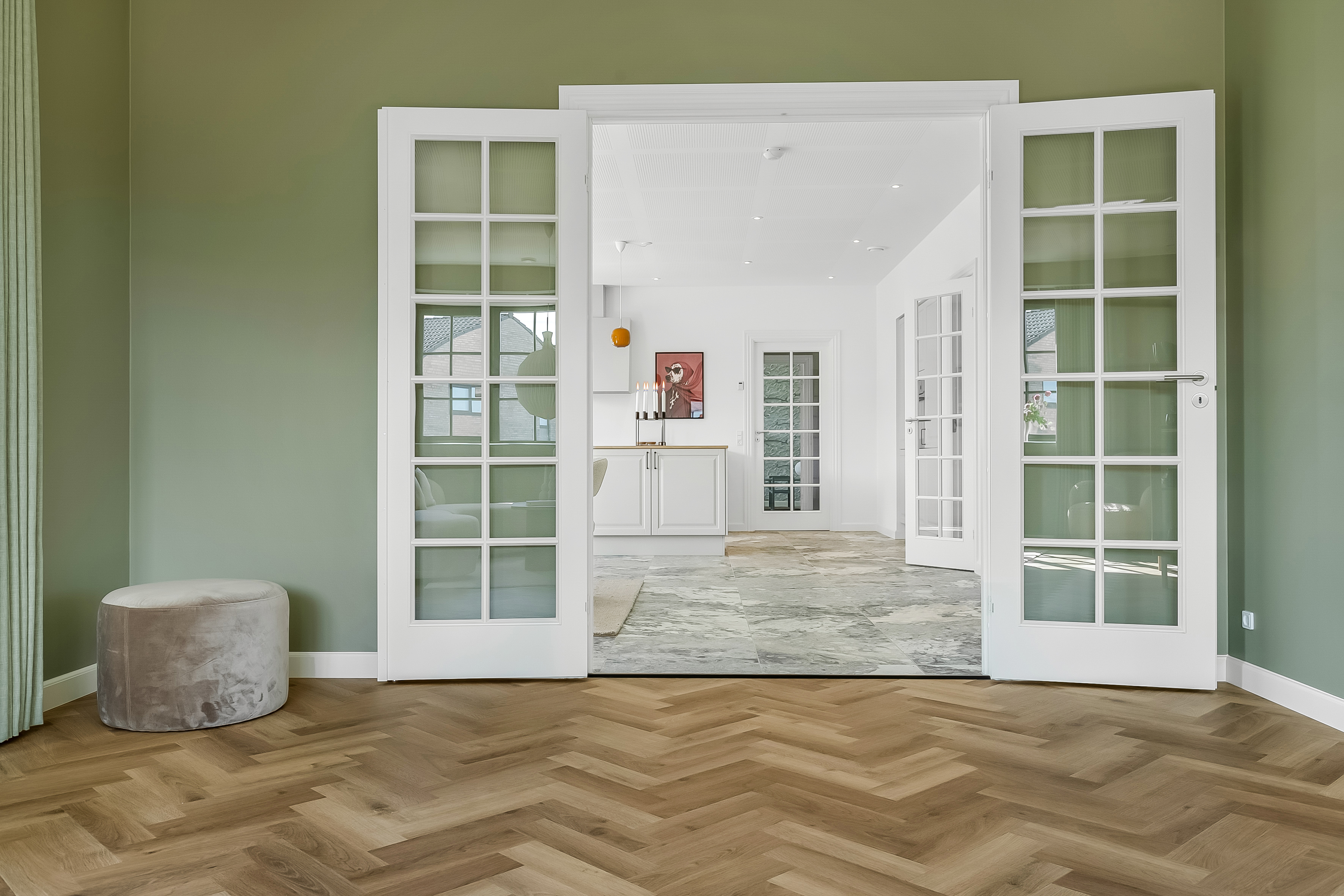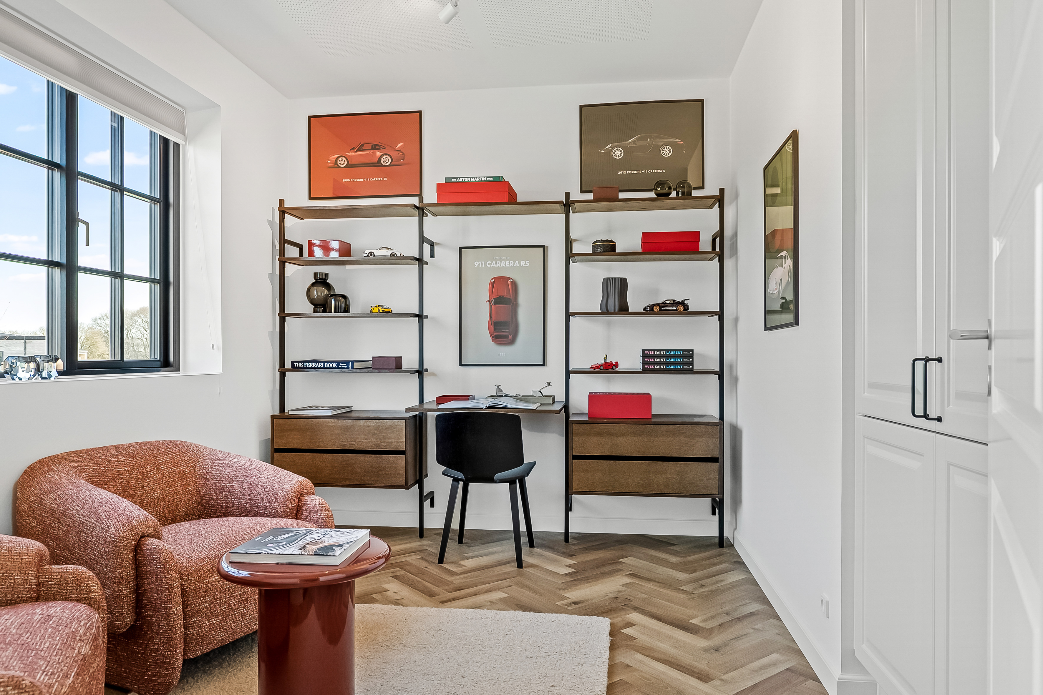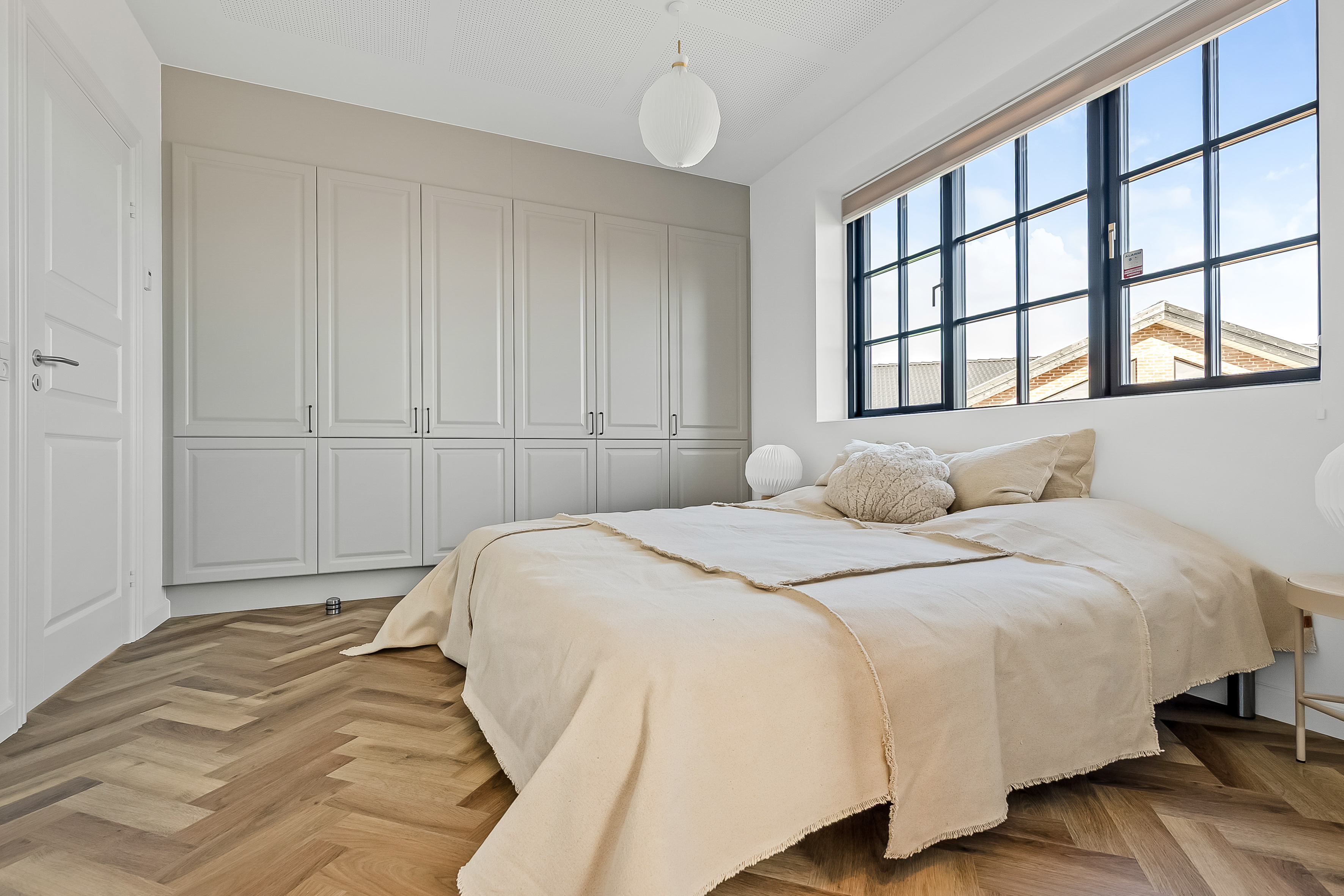 Materialevalget henter inspiration fra herskabsvillaer og fransk landstil: Sildebensgulve, formpressede døre, fyldningslåger, gerigter og lister i almuestil samt vinduer med sprosser giver boligen en gennemført og tidløs karakter. Det samme gælder de markante klinker i alrum, entré og badeværelser, der er både smukke og praktiske.