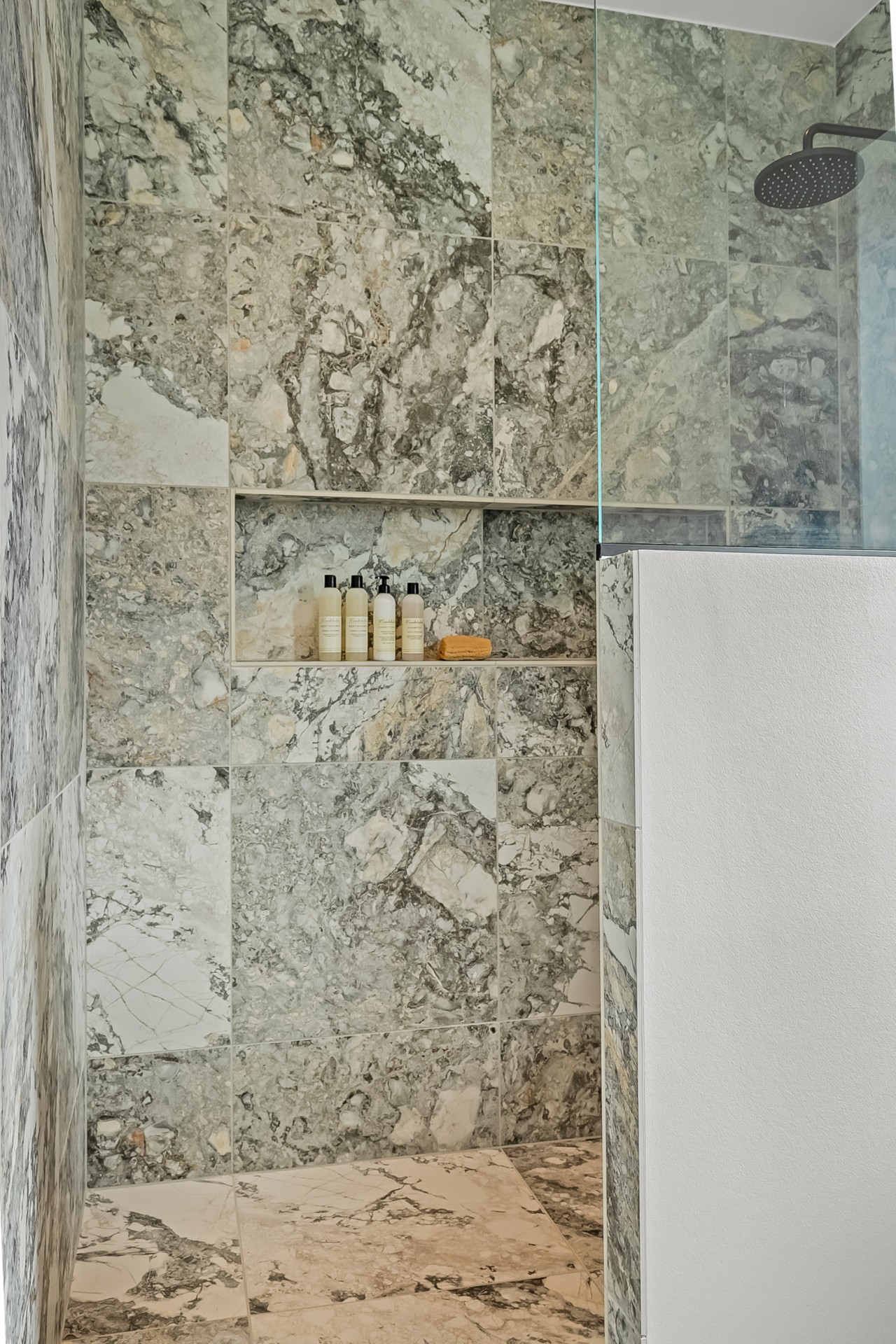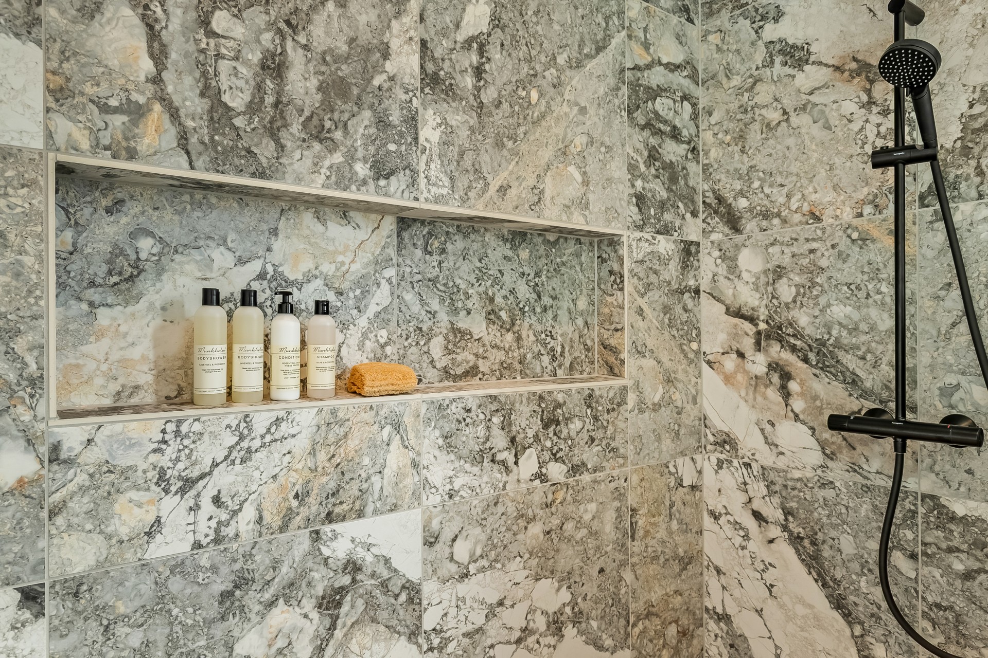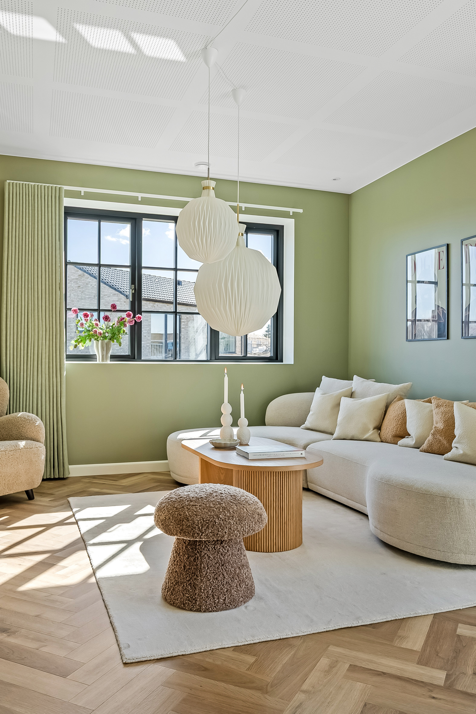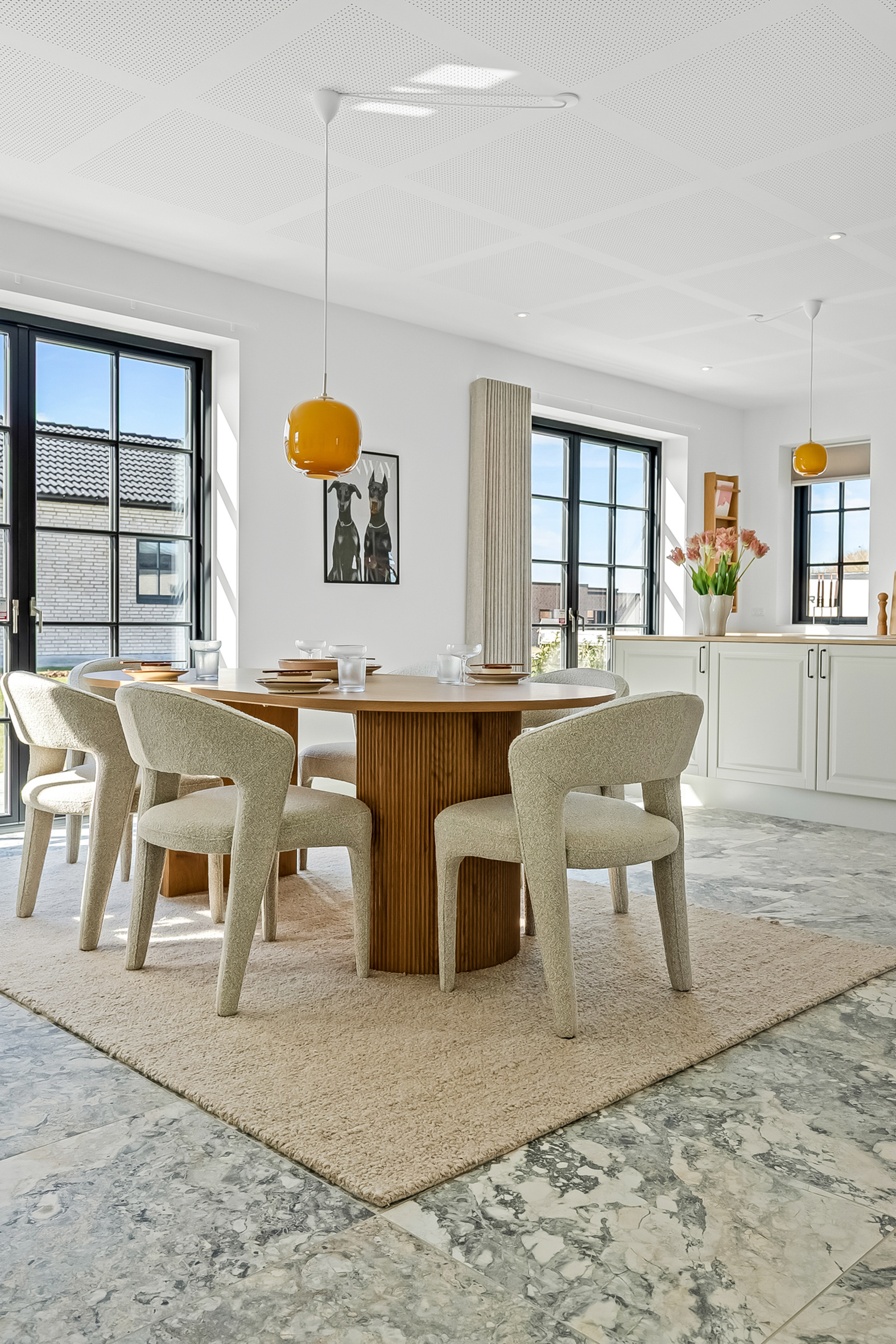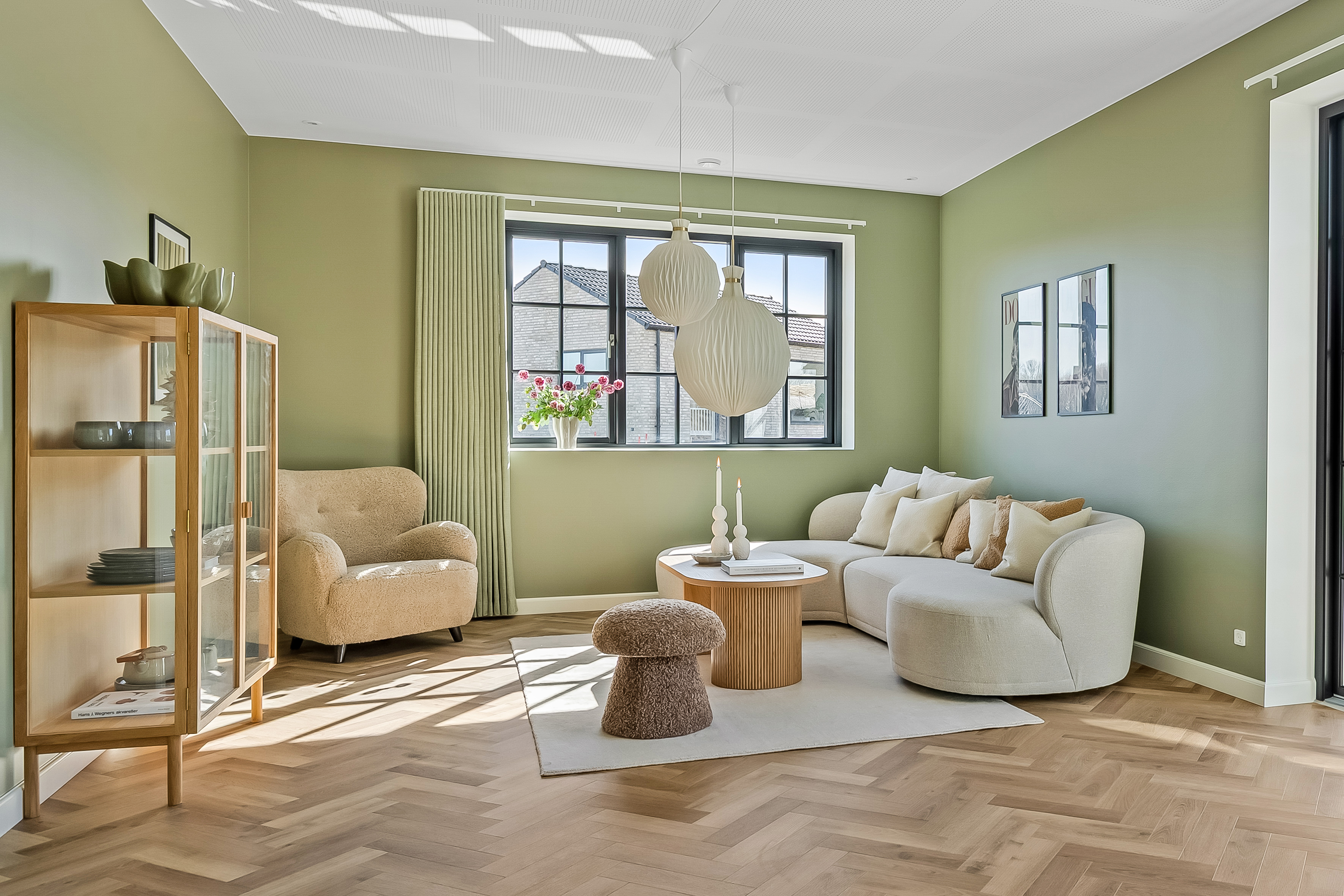 Materialevalget henter inspiration fra herskabsvillaer og fransk landstil: Sildebensgulve, formpressede døre, fyldningslåger, gerigter og lister i almuestil samt vinduer med sprosser giver boligen en gennemført og tidløs karakter. Det samme gælder de markante klinker i alrum, entré og badeværelser, der er både smukke og praktiske.