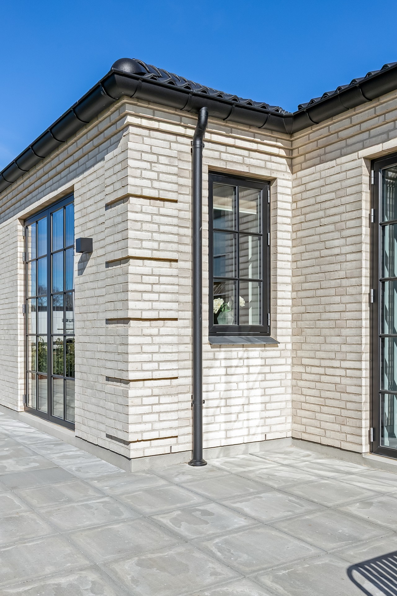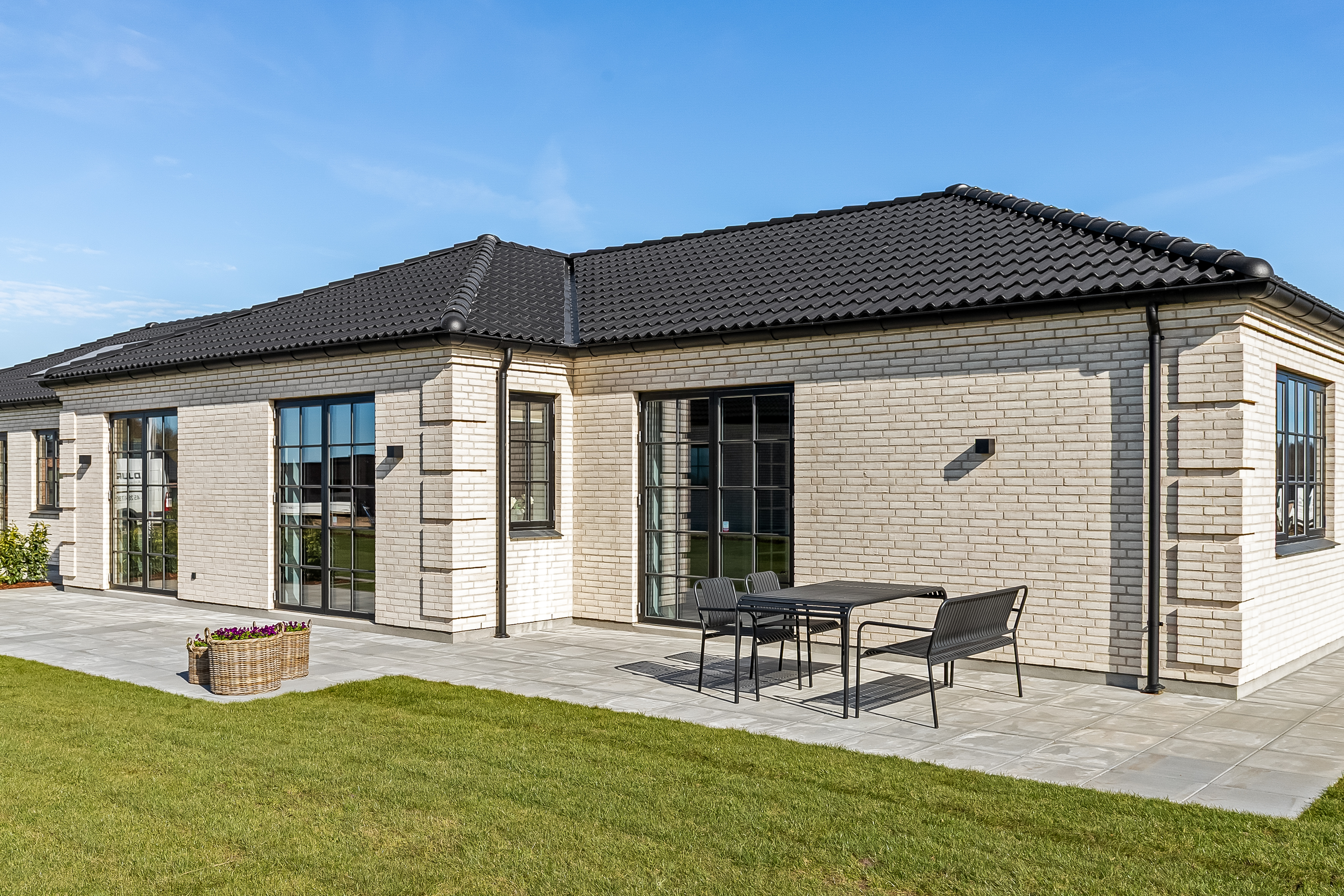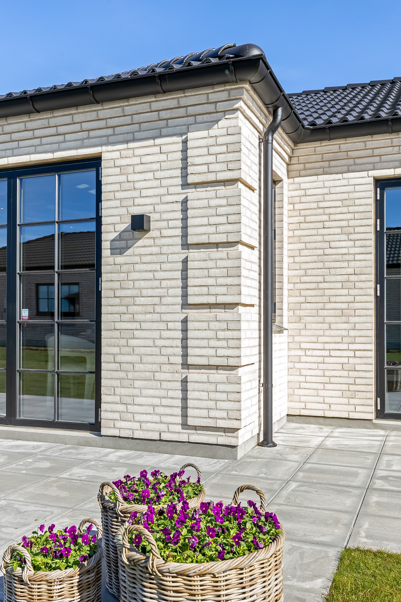 Det forskudte vinkelhus er opført i lyse mursten med matchende fuger, som giver facaden et harmonisk og roligt udtryk. Murede detaljer som gesims og kvader på hushjørnerne forfiner stilen, mens taget med afvalmede gavle er udført uden udhæng og elegant afsluttet med arkitekttagrender i sort aluminium.