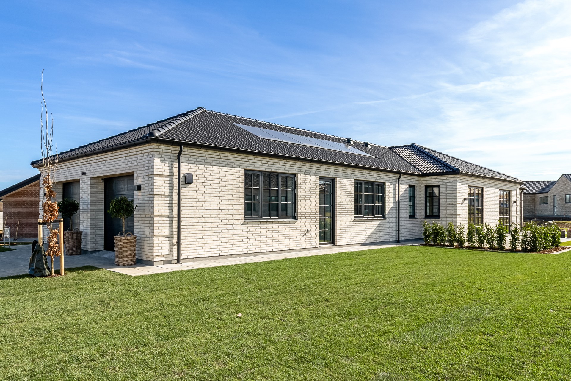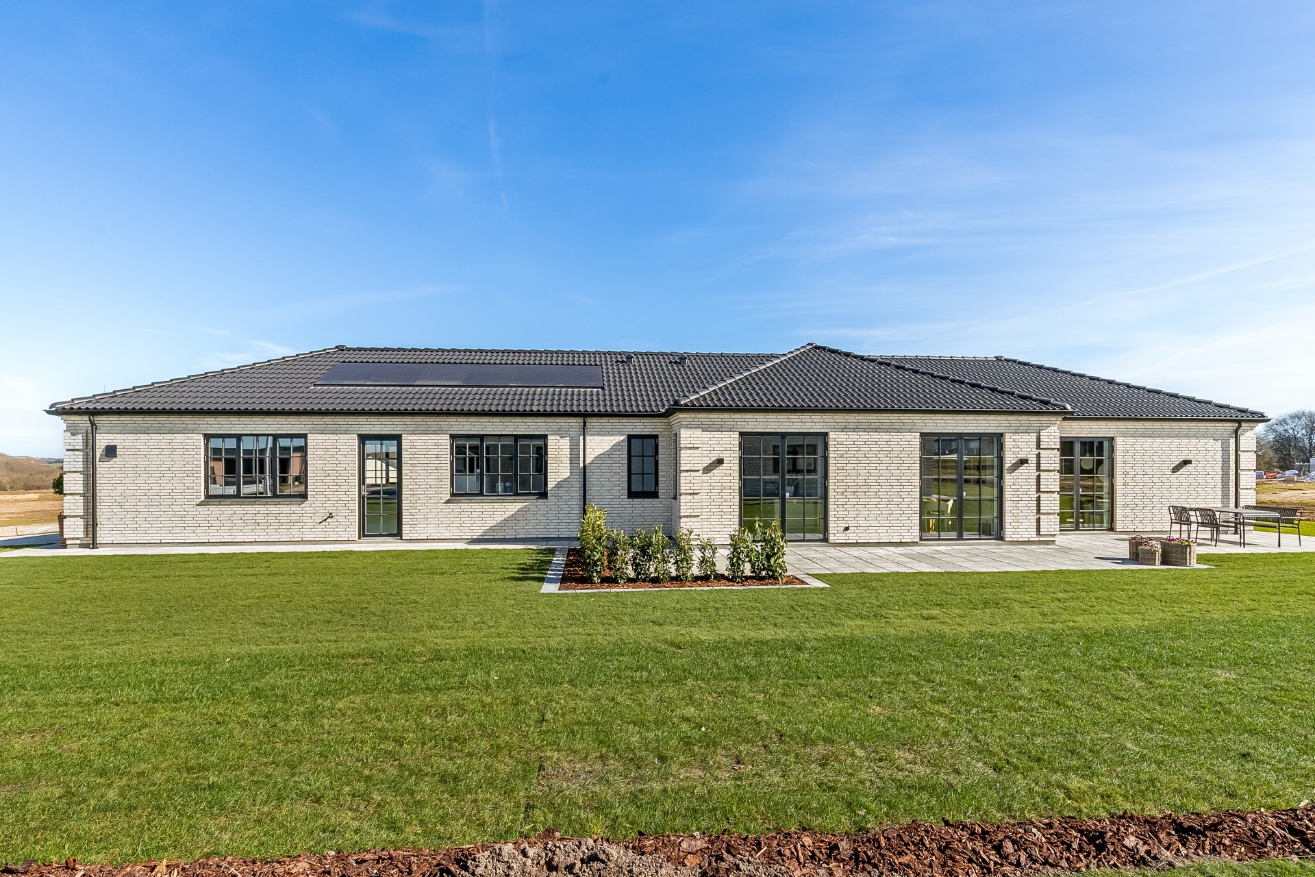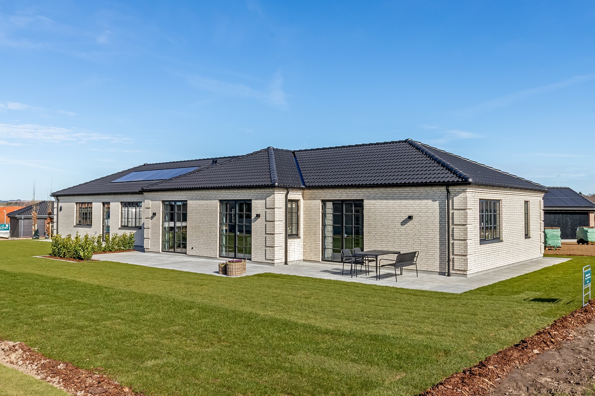 Det forskudte vinkelhus er opført i lyse mursten med matchende fuger, som giver facaden et harmonisk og roligt udtryk. Murede detaljer som gesims og kvader på hushjørnerne forfiner stilen, mens taget med afvalmede gavle er udført uden udhæng og elegant afsluttet med arkitekttagrender i sort aluminium.