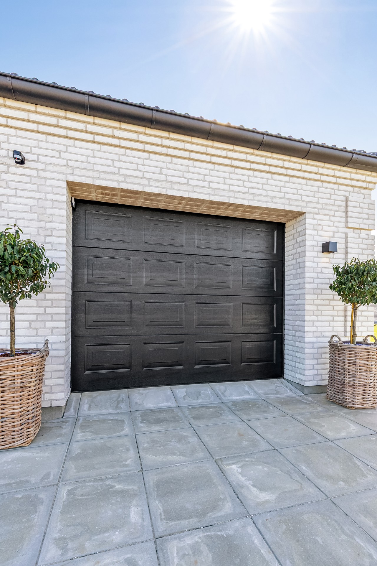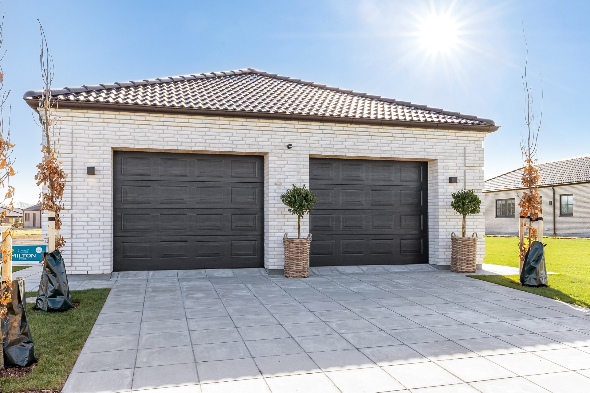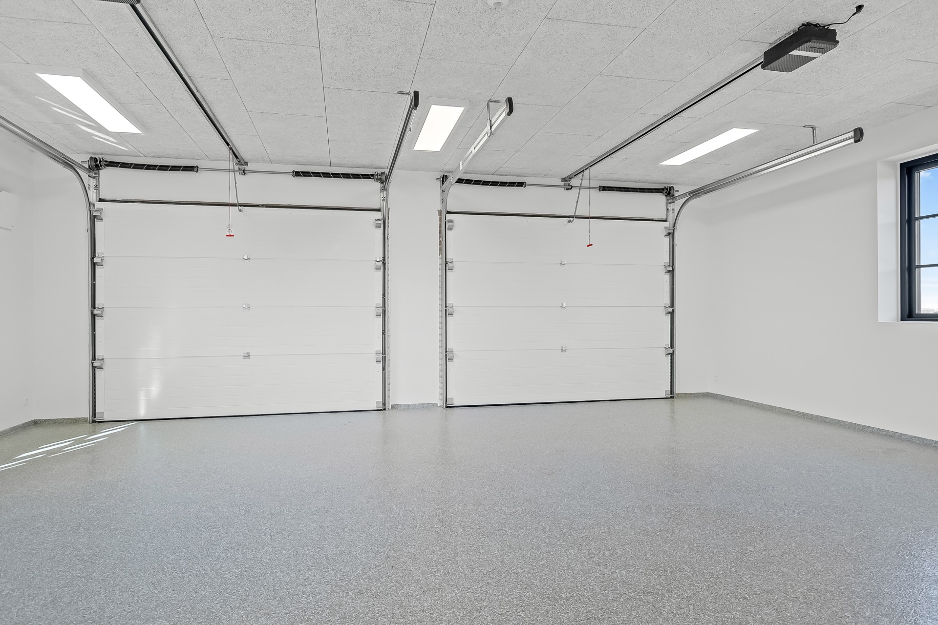 Den integrerede garage har automatiske porte og et epoxygulv i farven Dawn. Med sin størrelse er den oplagt som multirum til børnefødselsdage, hobbyer eller træning.