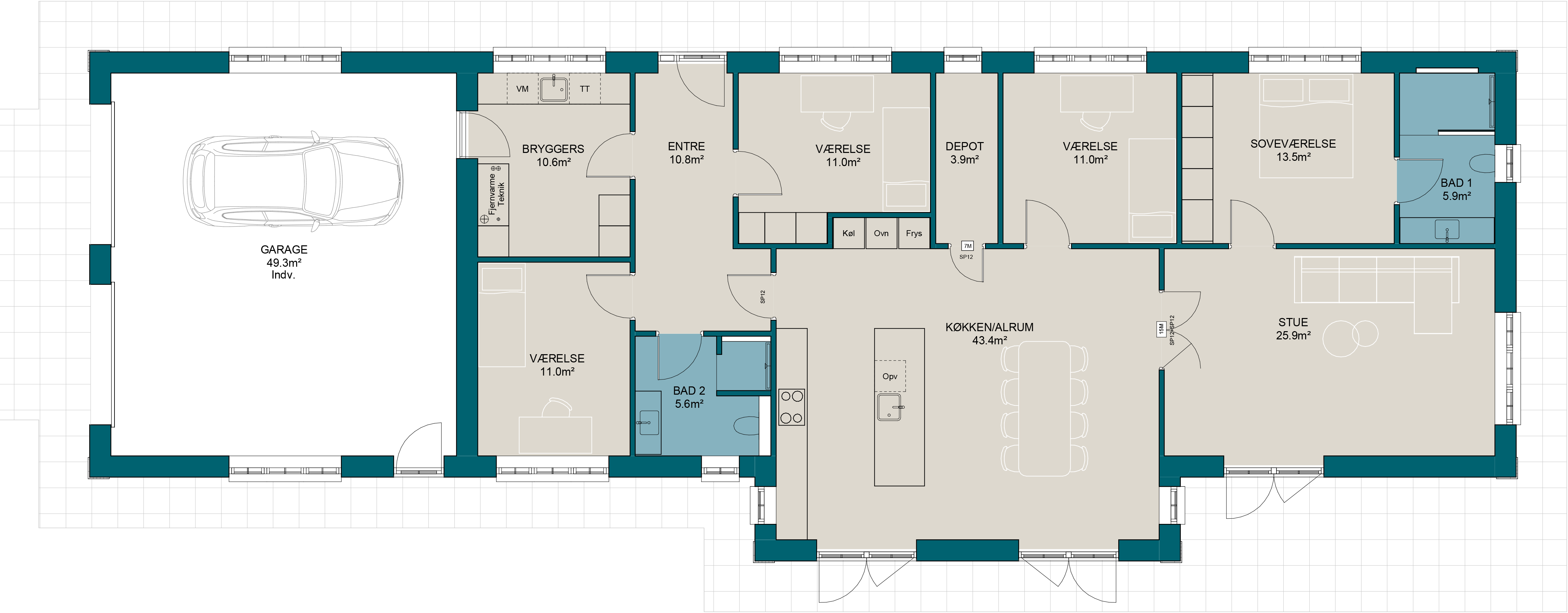 Det naturlige samlingspunkt er alrummet på 43 kvm med en tilstødende stue på 26 kvm. Her er god plads til både hverdagslivet og de store familiesammenkomster. Franske døre trækker dagslyset ind og forstærker den åbne rumfornemmelse.