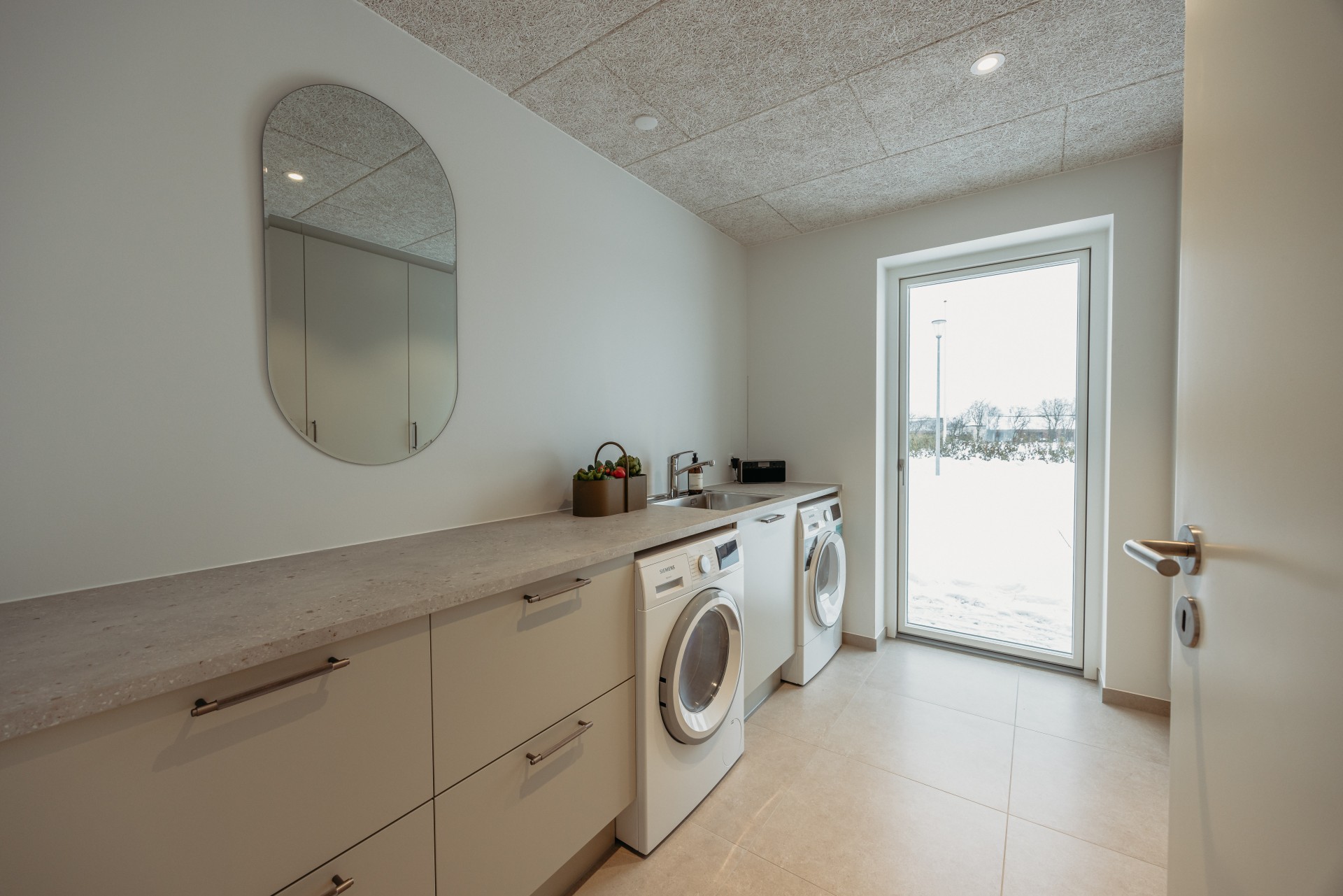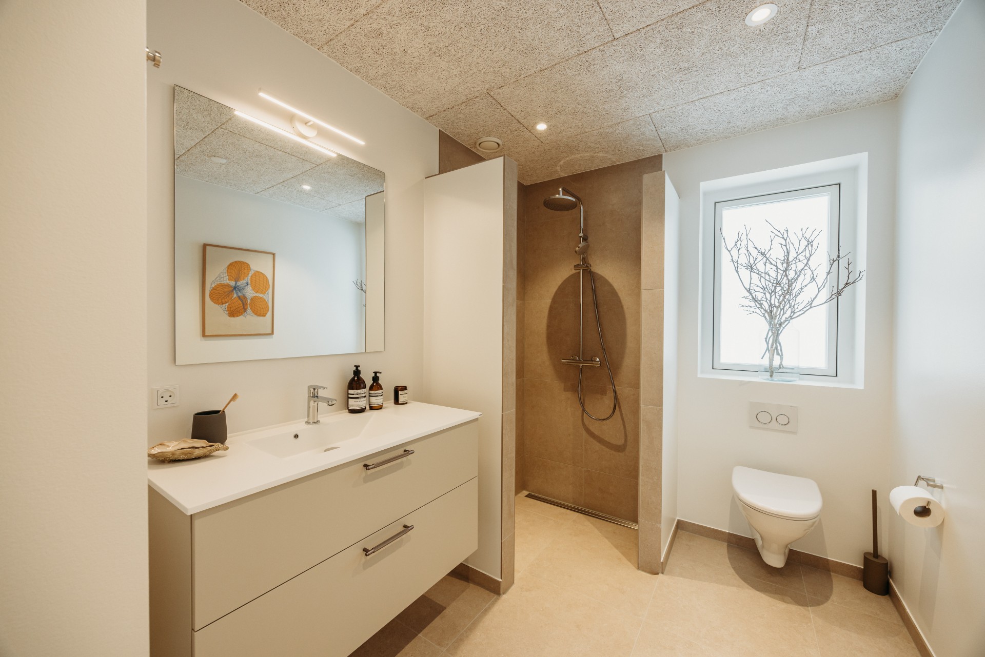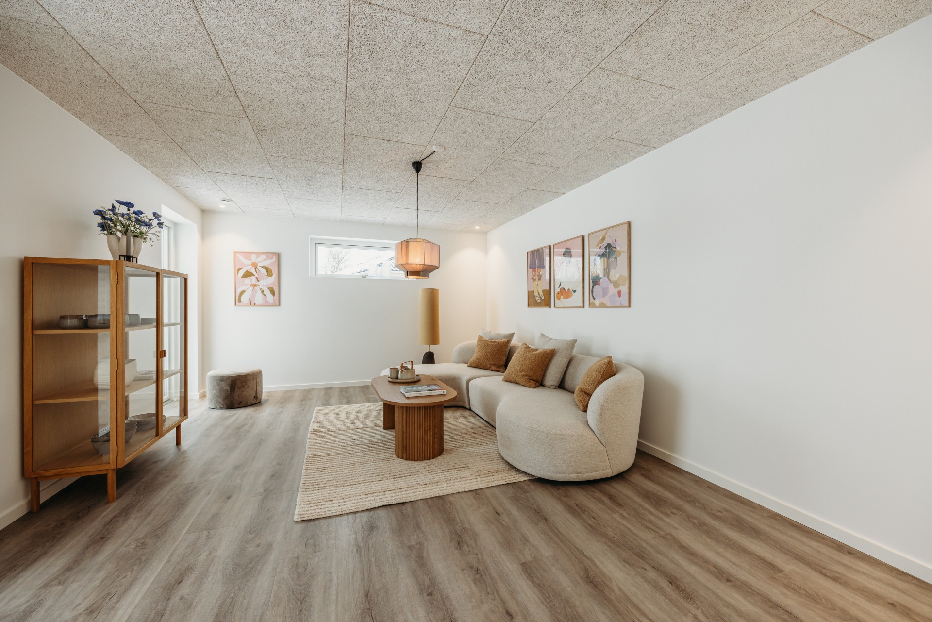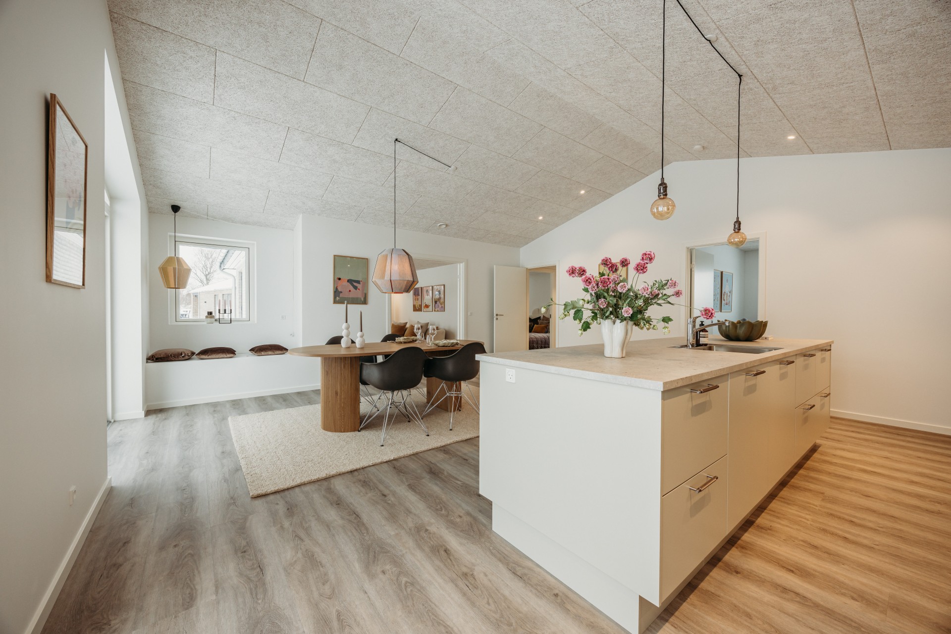 Boligen er indrettet med lyse og vedligeholdelseslette materialer hele vejen igennem, gode opbevaringsmuligheder og akustiklofter. Der er gulvvarme i hele huset samt ventilation med varmegenvinding, som bidrager til et sundt indeklima og en lav energiregning.