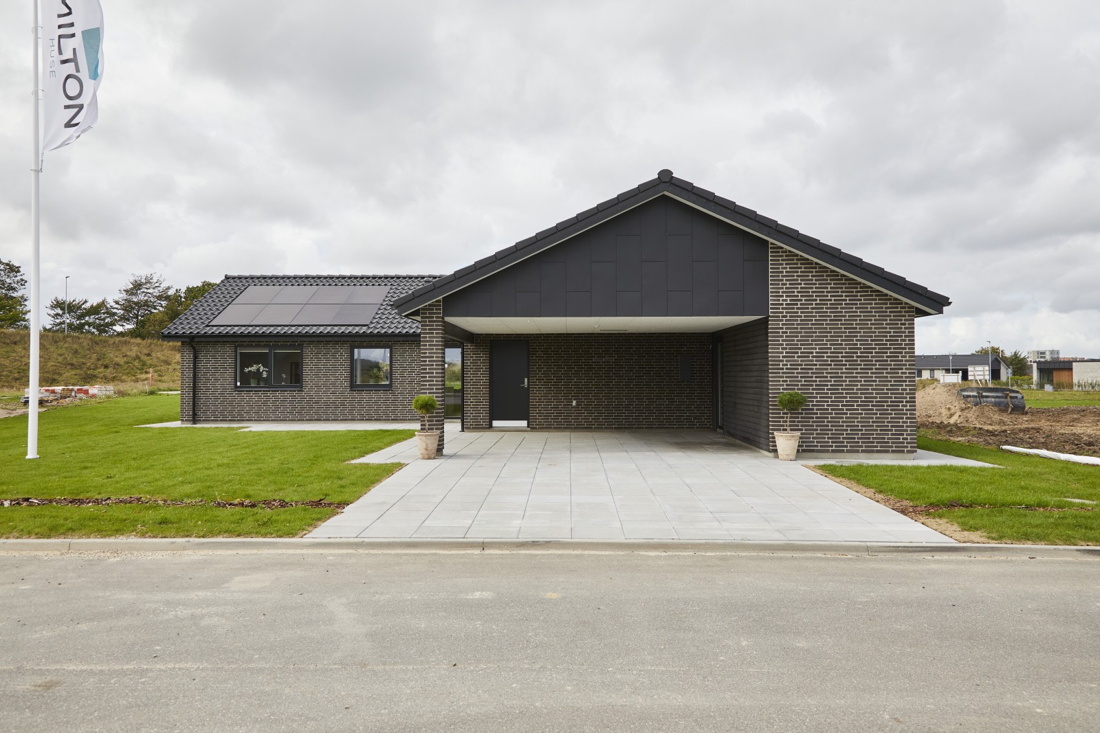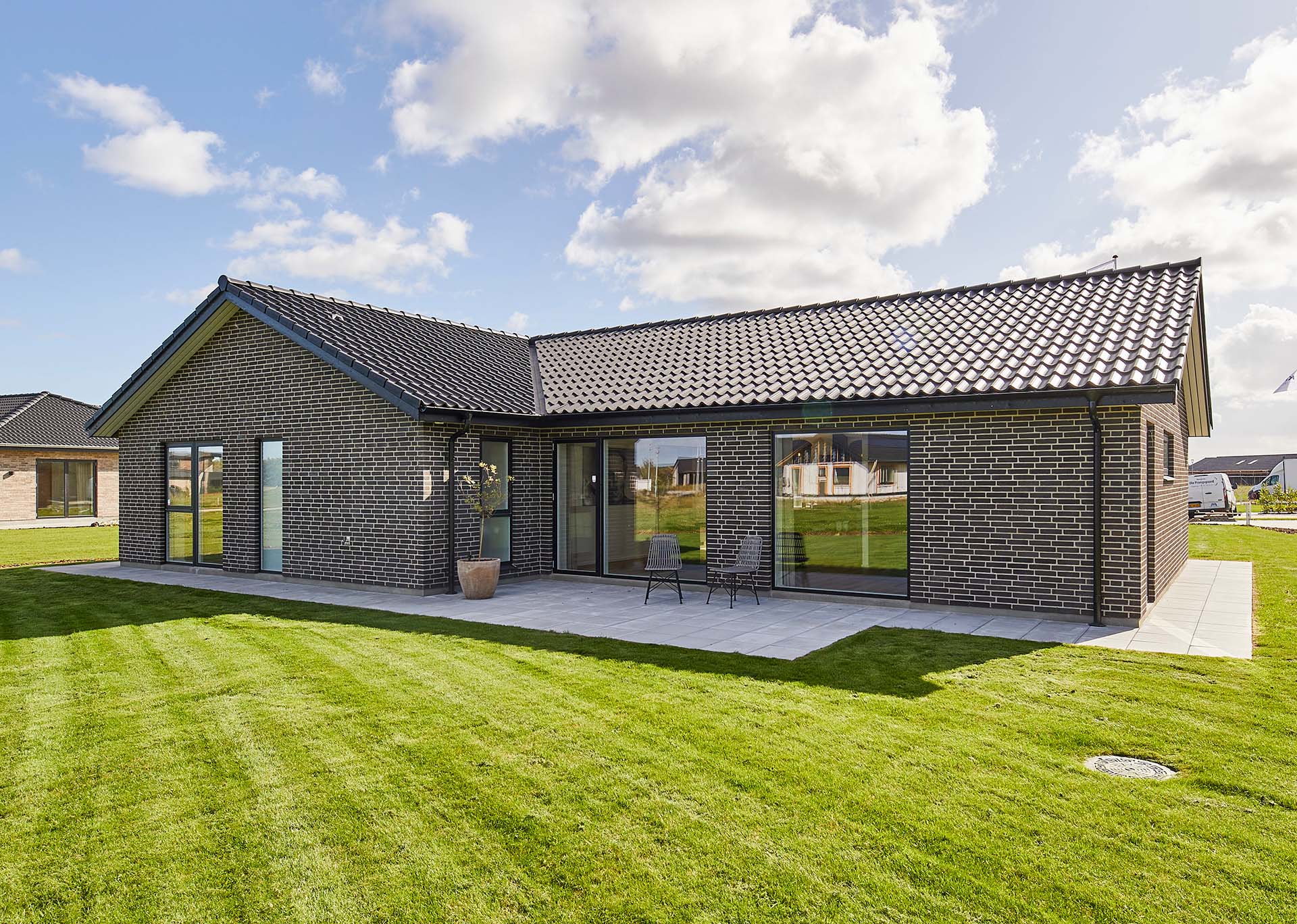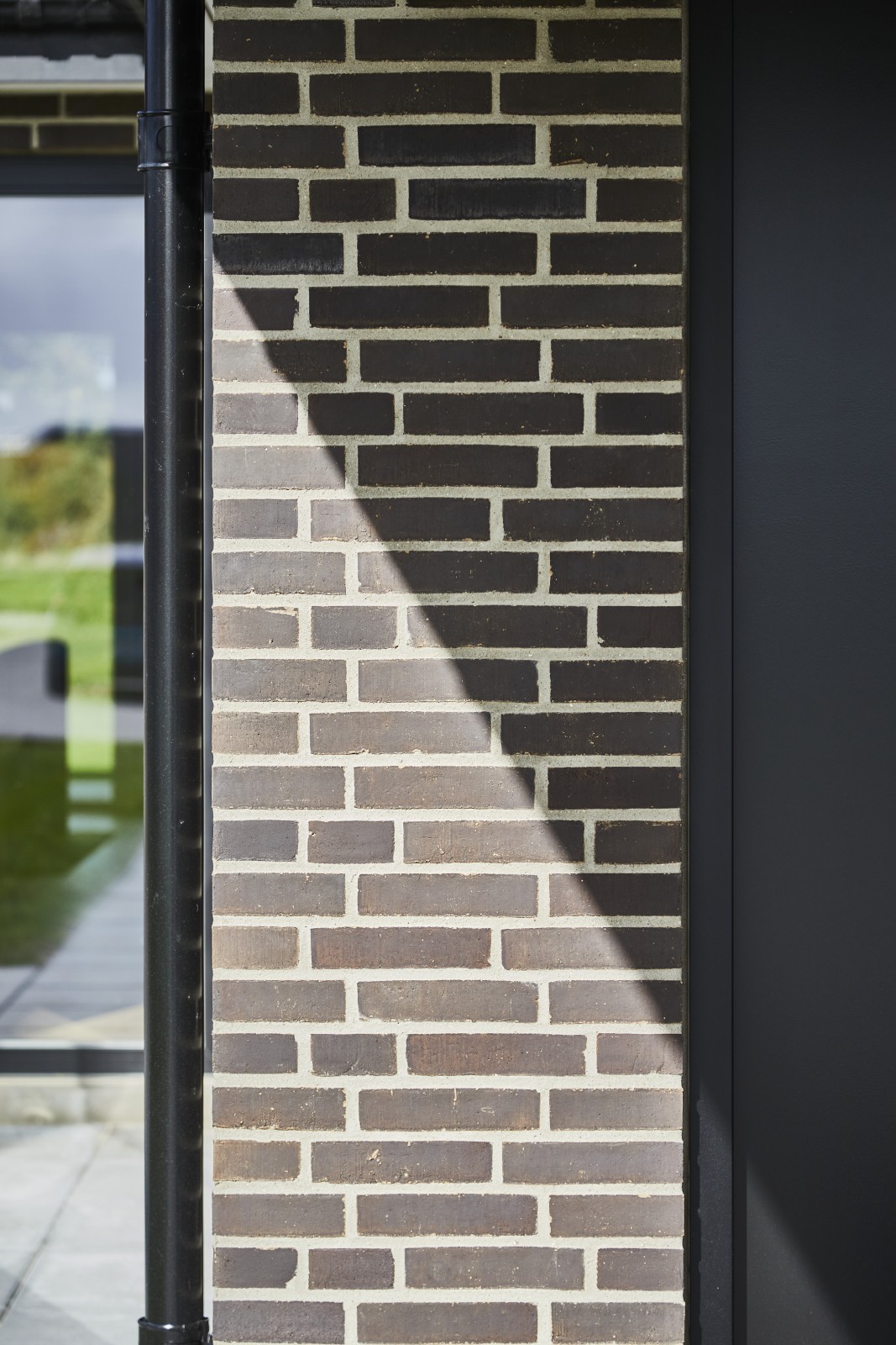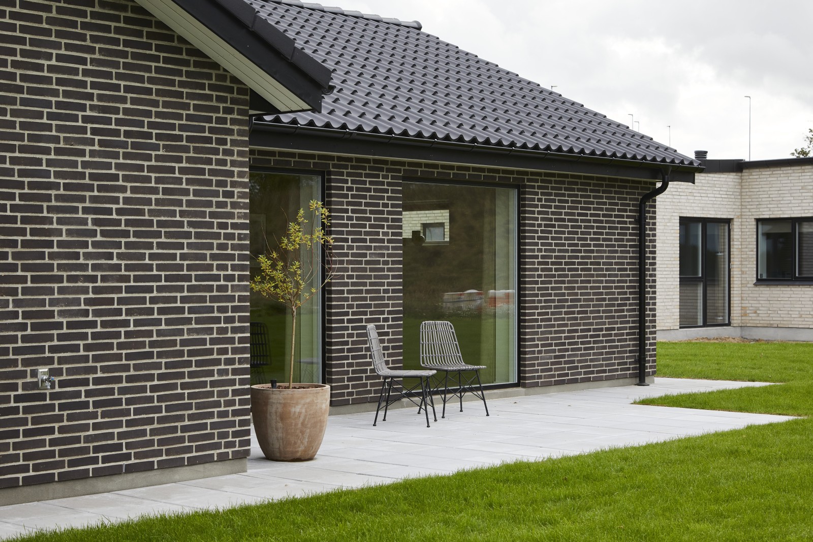 Det forskudte vinkelhus er en klassiker i det danske husbyggeri. Her er den udstyret med carport og et gedigent redskabsrum. Boligens forskudte vinkel opdeler grunden i en forhave og en mere privat baghave med to solrige terrasser mod syd og nordvest. Kombinationen af den sortbrune EW2543 Lyra mursten, de sorte vinduer og matchende tagrender giver villaen et harmonisk og nutidigt udtryk.