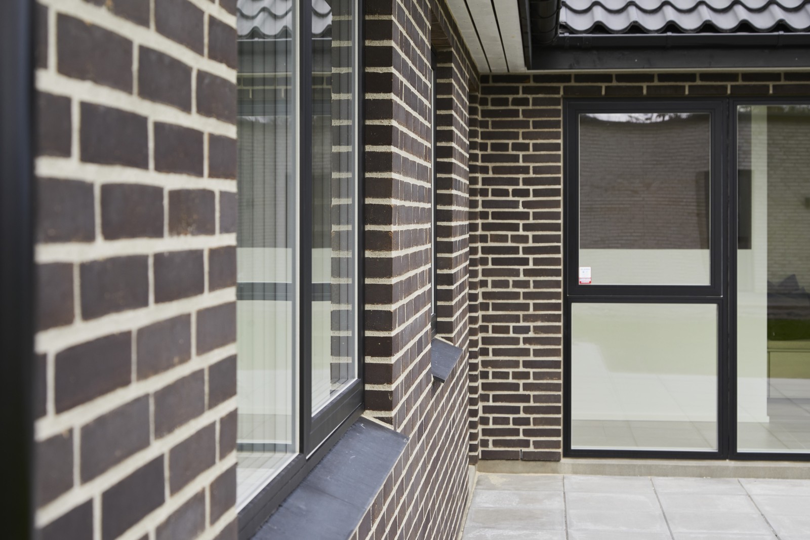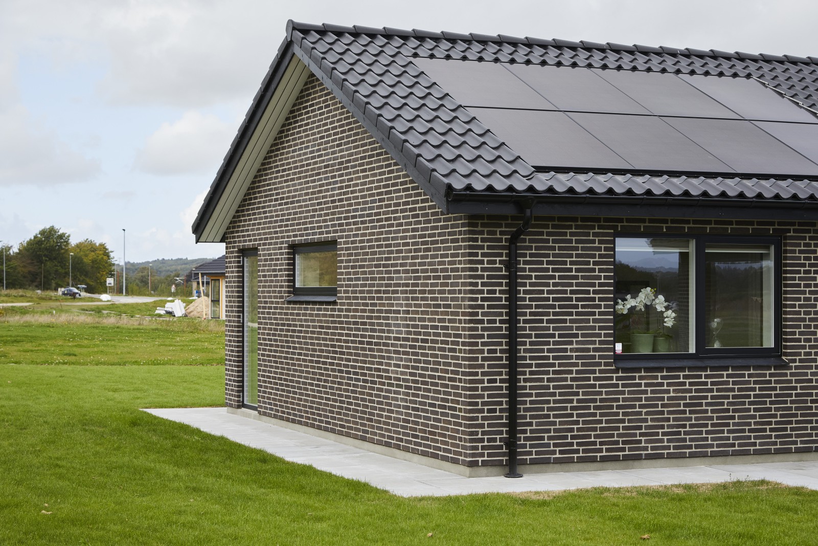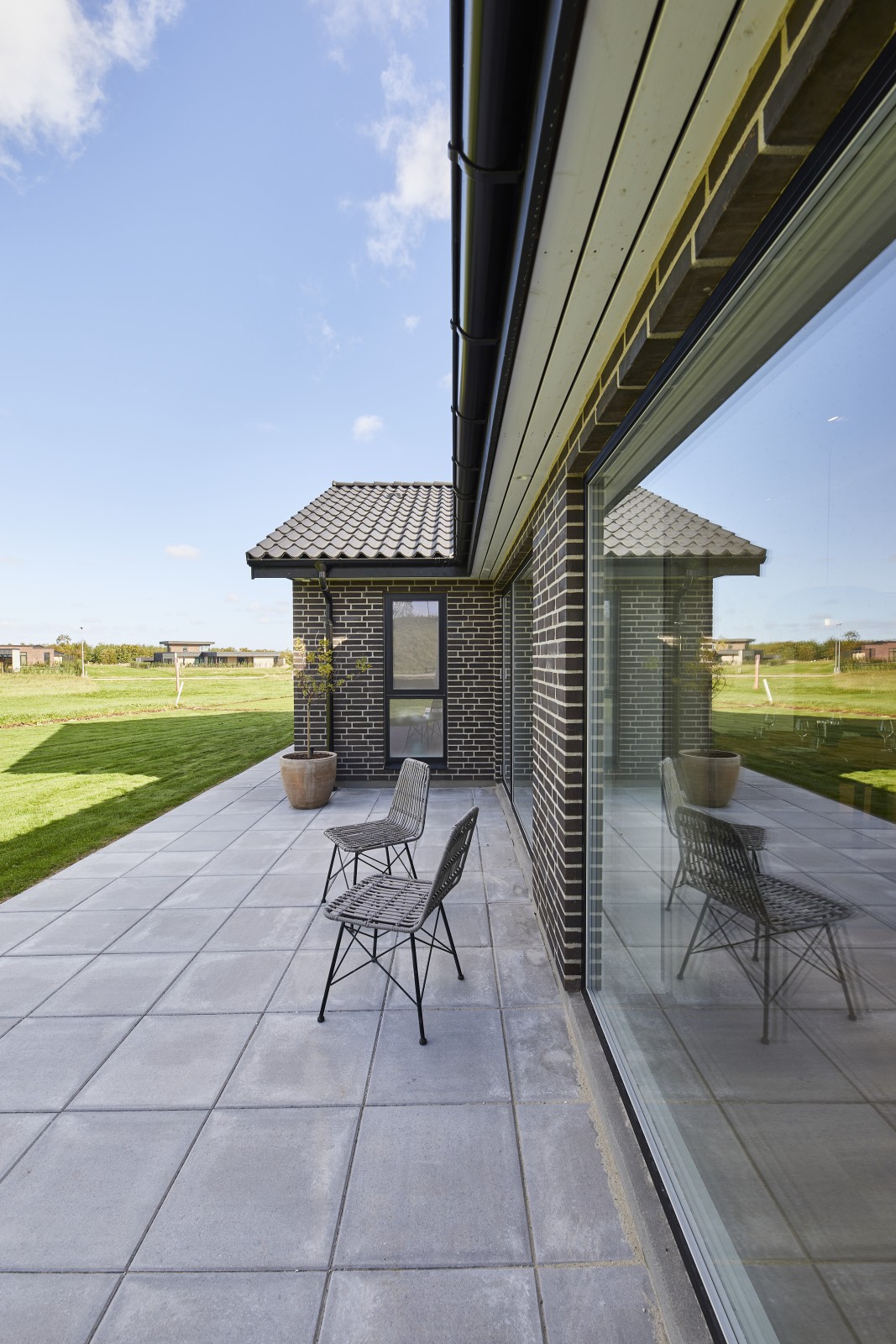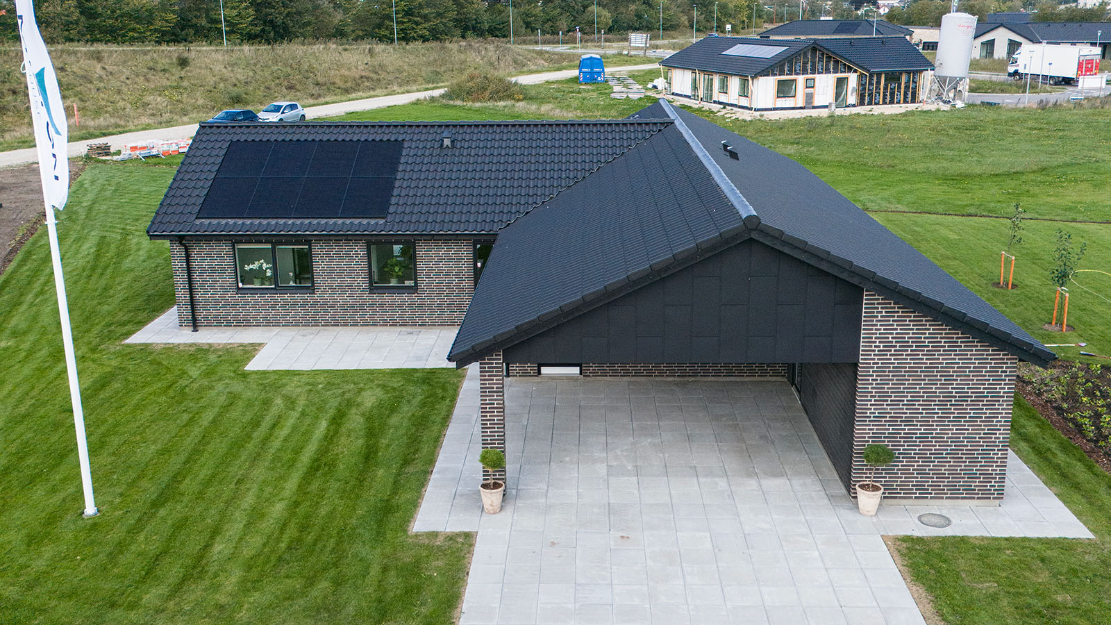 Det forskudte vinkelhus er en klassiker i det danske husbyggeri. Her er den udstyret med carport og et gedigent redskabsrum. Boligens forskudte vinkel opdeler grunden i en forhave og en mere privat baghave med to solrige terrasser mod syd og nordvest. Kombinationen af den sortbrune EW2543 Lyra mursten, de sorte vinduer og matchende tagrender giver villaen et harmonisk og nutidigt udtryk.