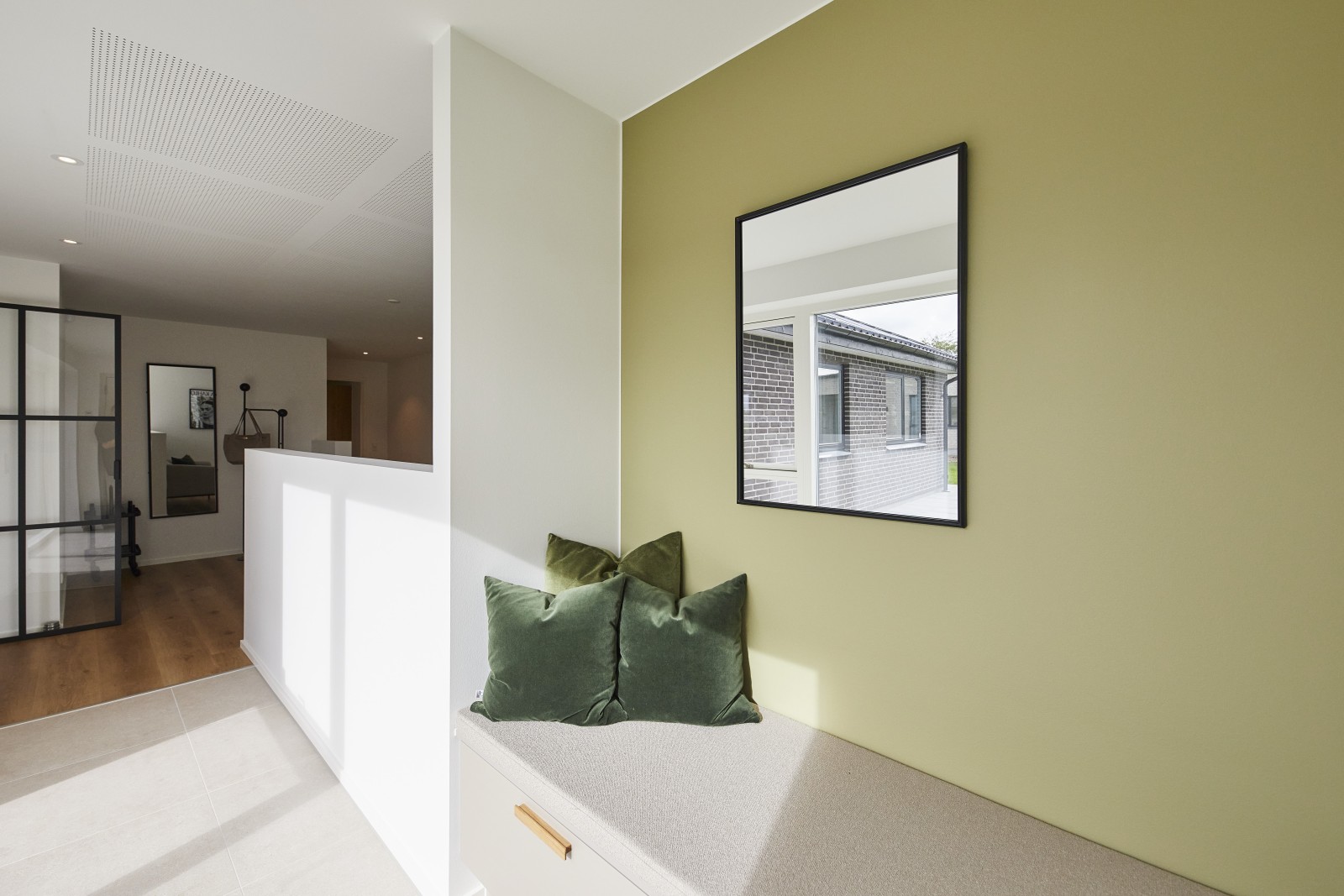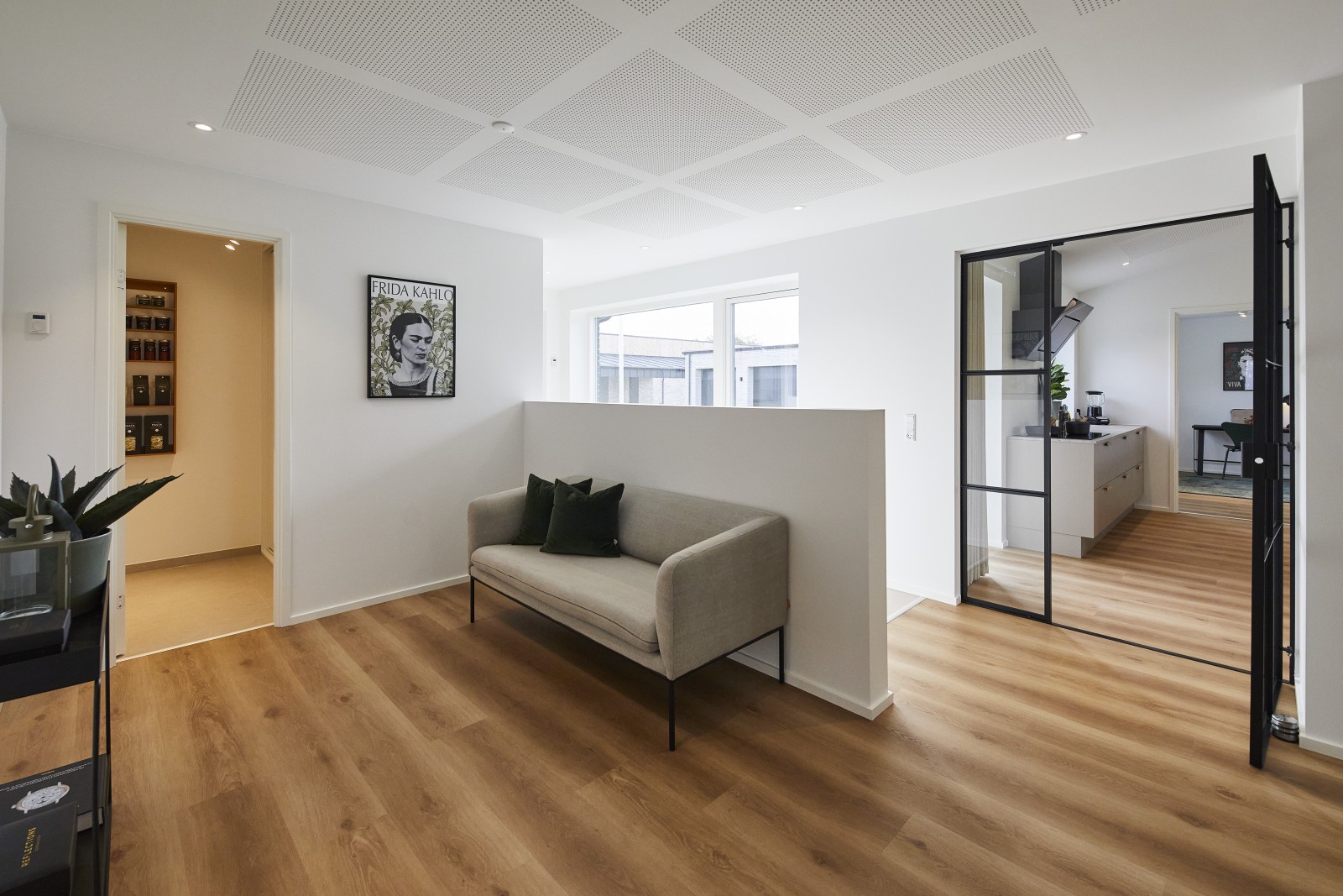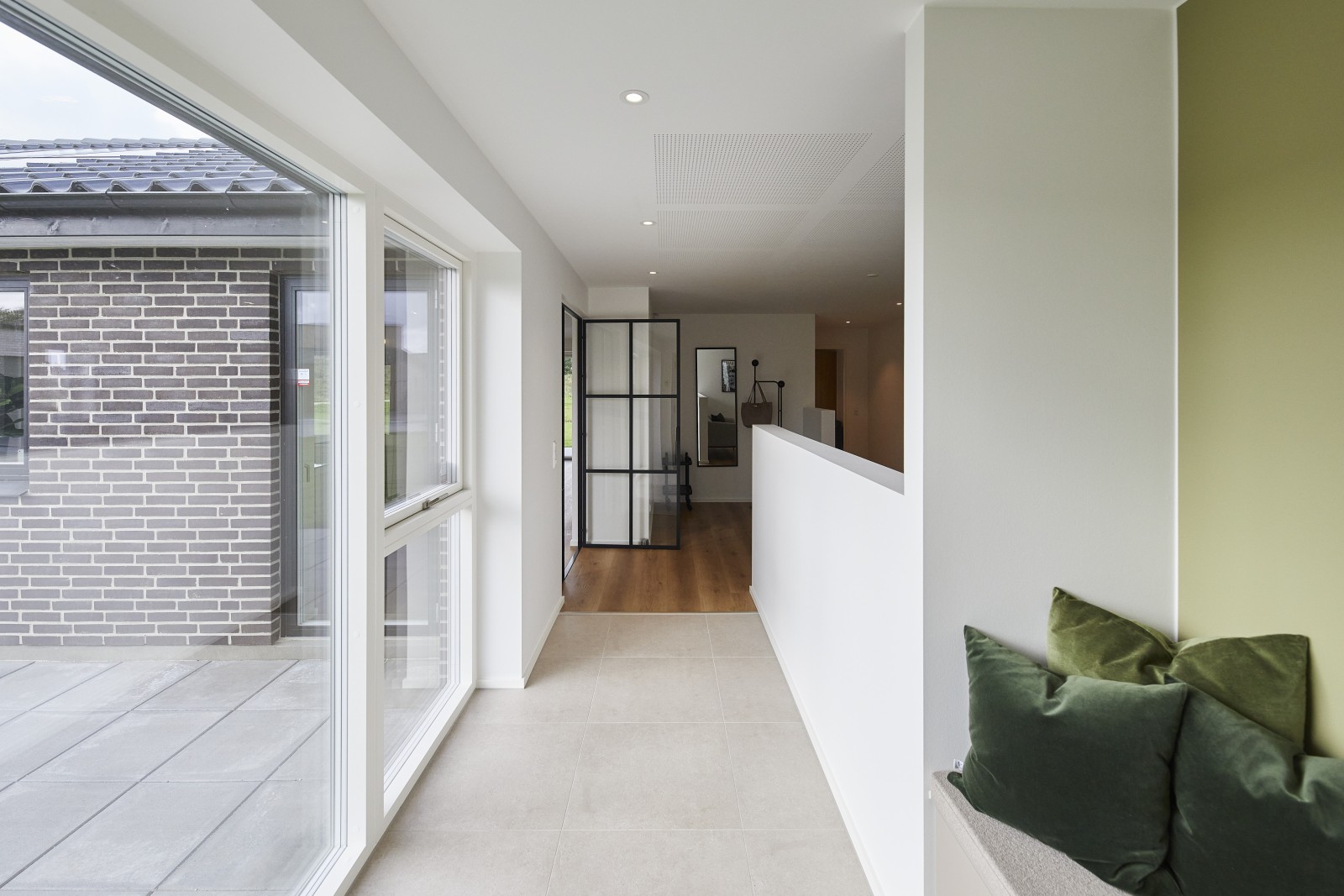 Lyset vælter ind i entréen, hvor du kan tage plads på den indbyggede bænk og kigge ud i haven. Herefter åbner huset sig op i et stort multirum, inddelt i zoner af to halvvægge. Her kan hjemmets teenagere spille PlayStation sammen, der kan indrettes legeområde til de yngste – eller måske et kombineret arbejds- og lektierum. Det er et fleksibelt rum, der kan ændre funktion i takt med familiens behov.