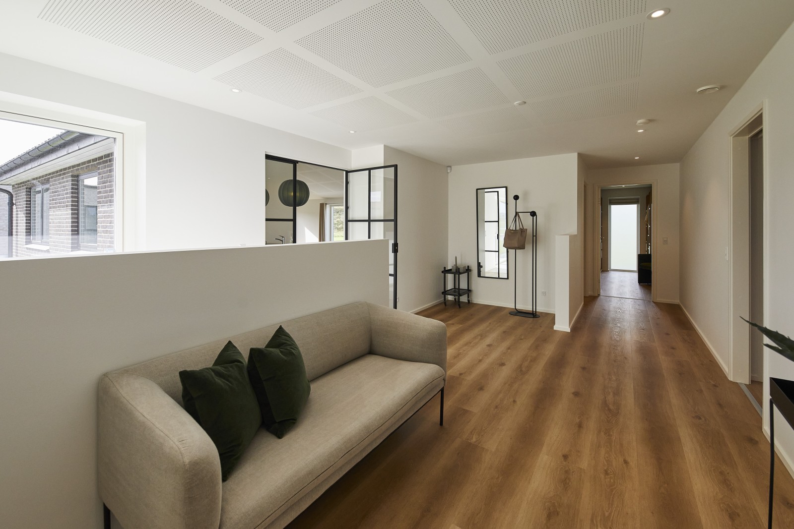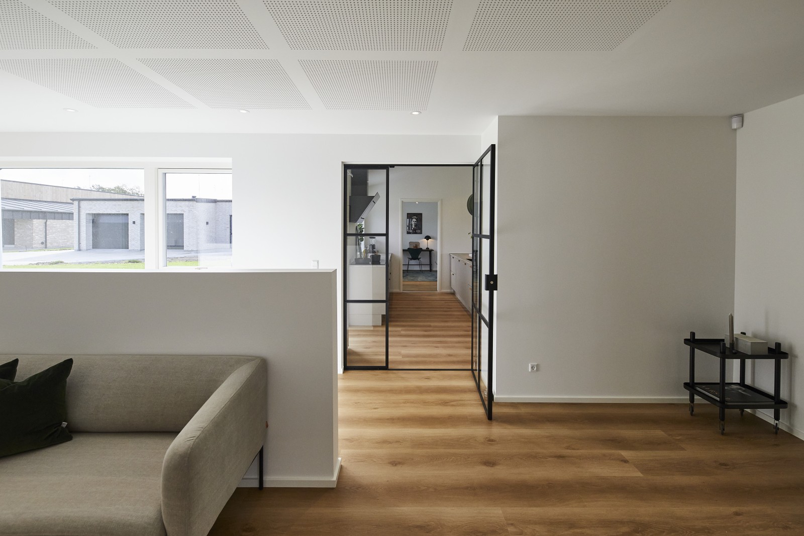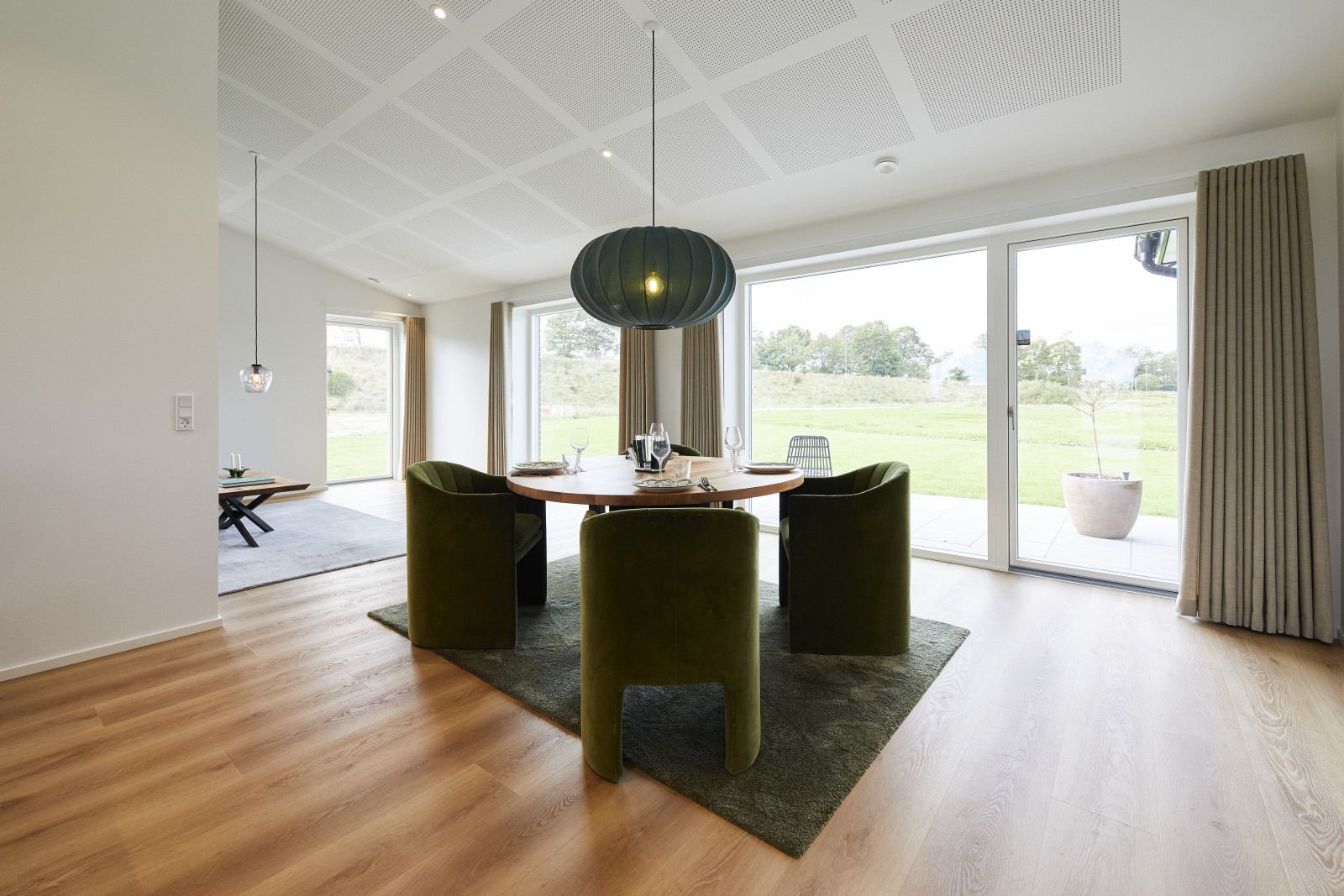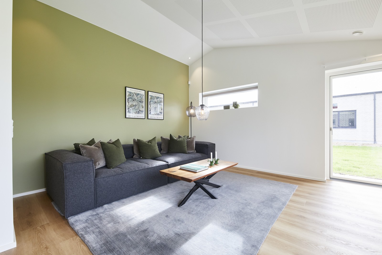 Lyset vælter ind i entréen, hvor du kan tage plads på den indbyggede bænk og kigge ud i haven. Herefter åbner huset sig op i et stort multirum, inddelt i zoner af to halvvægge. Her kan hjemmets teenagere spille PlayStation sammen, der kan indrettes legeområde til de yngste – eller måske et kombineret arbejds- og lektierum. Det er et fleksibelt rum, der kan ændre funktion i takt med familiens behov.
