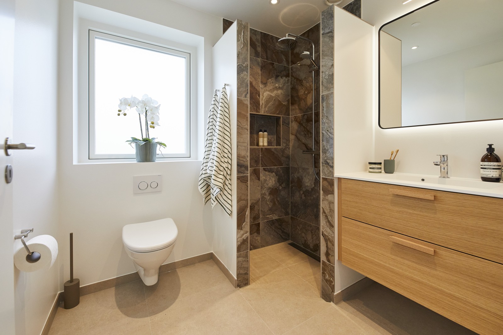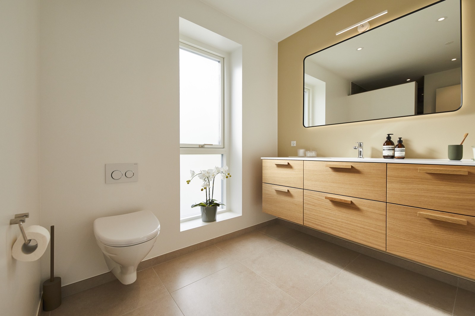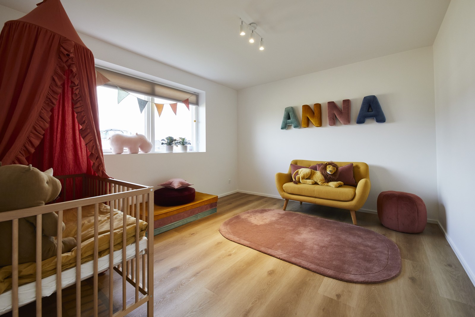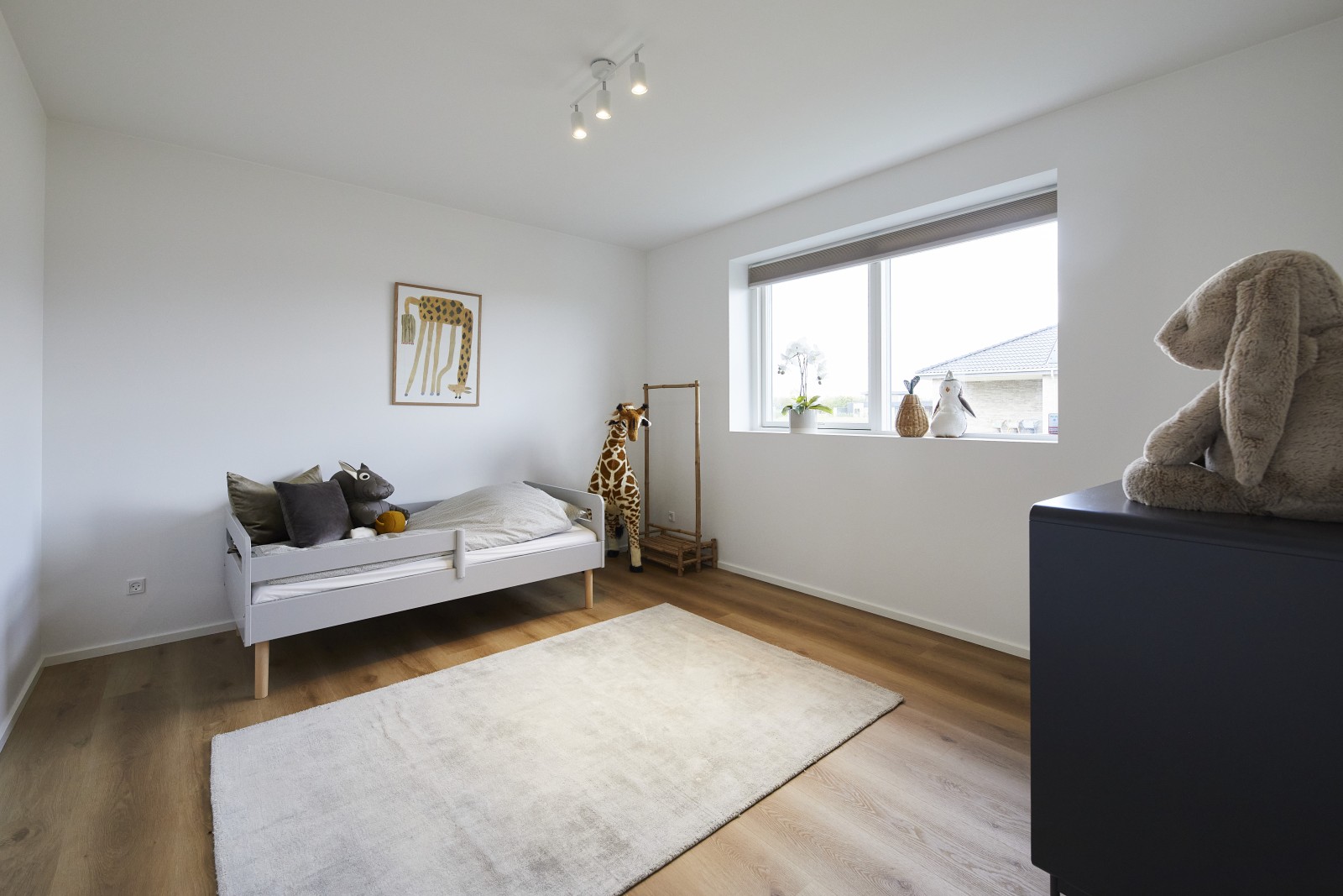 Multirummet fungerer samtidig som fordelingscentral og samlingspunkt i husets værelsesfløj. Et vaskerum er praktisk placeret, så det er nemt at smide tøj til vask uden at skulle krydse hele huset. Forældreafdelingen har eget bad, et stort walk-in og er placeret, så der altid kan lukkes to døre til fællesområdet og dermed skærmes for støj. I brusenichen er der desuden indbygget en bænk – en lille detalje, som giver ekstra funktionalitet i hverdagen.