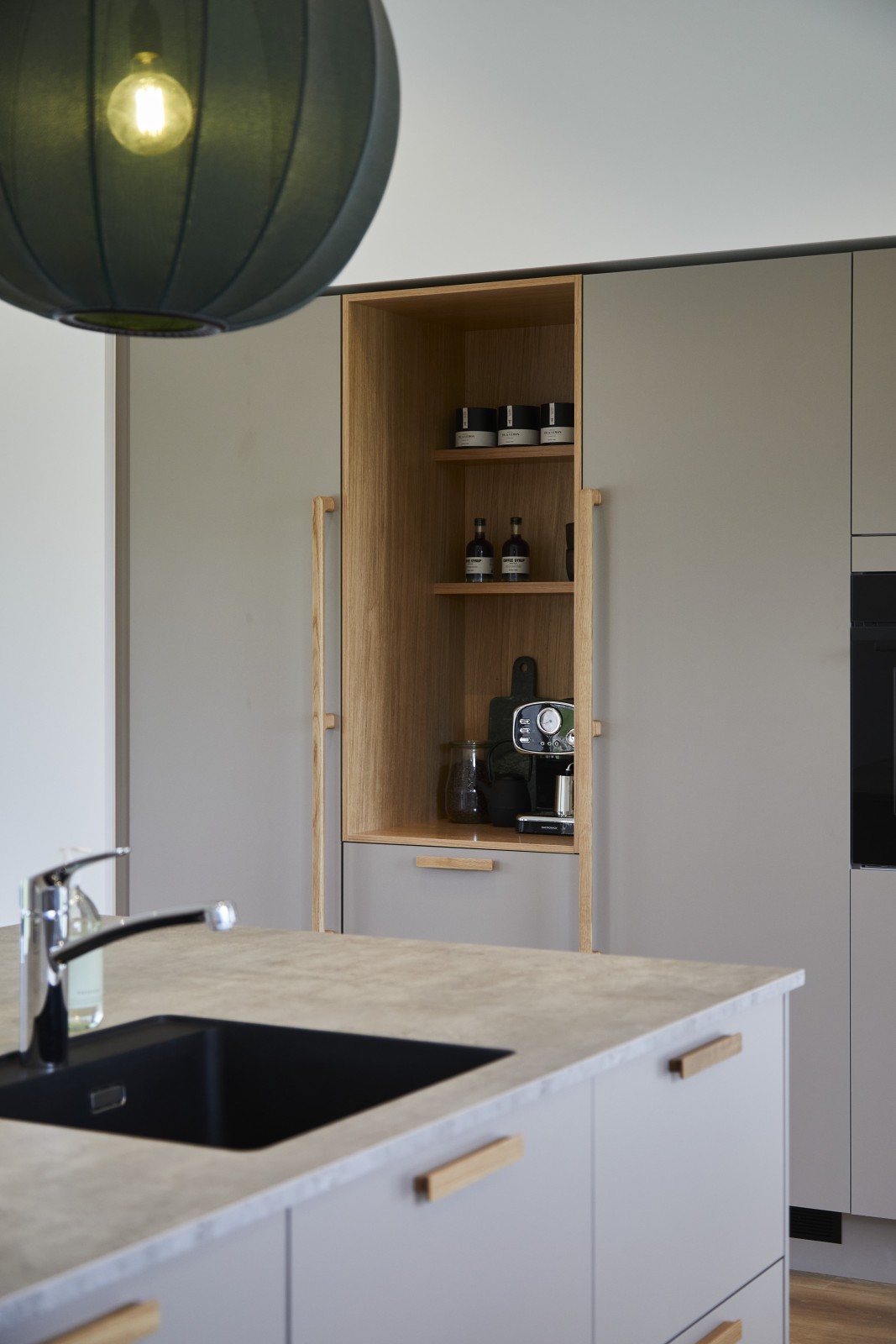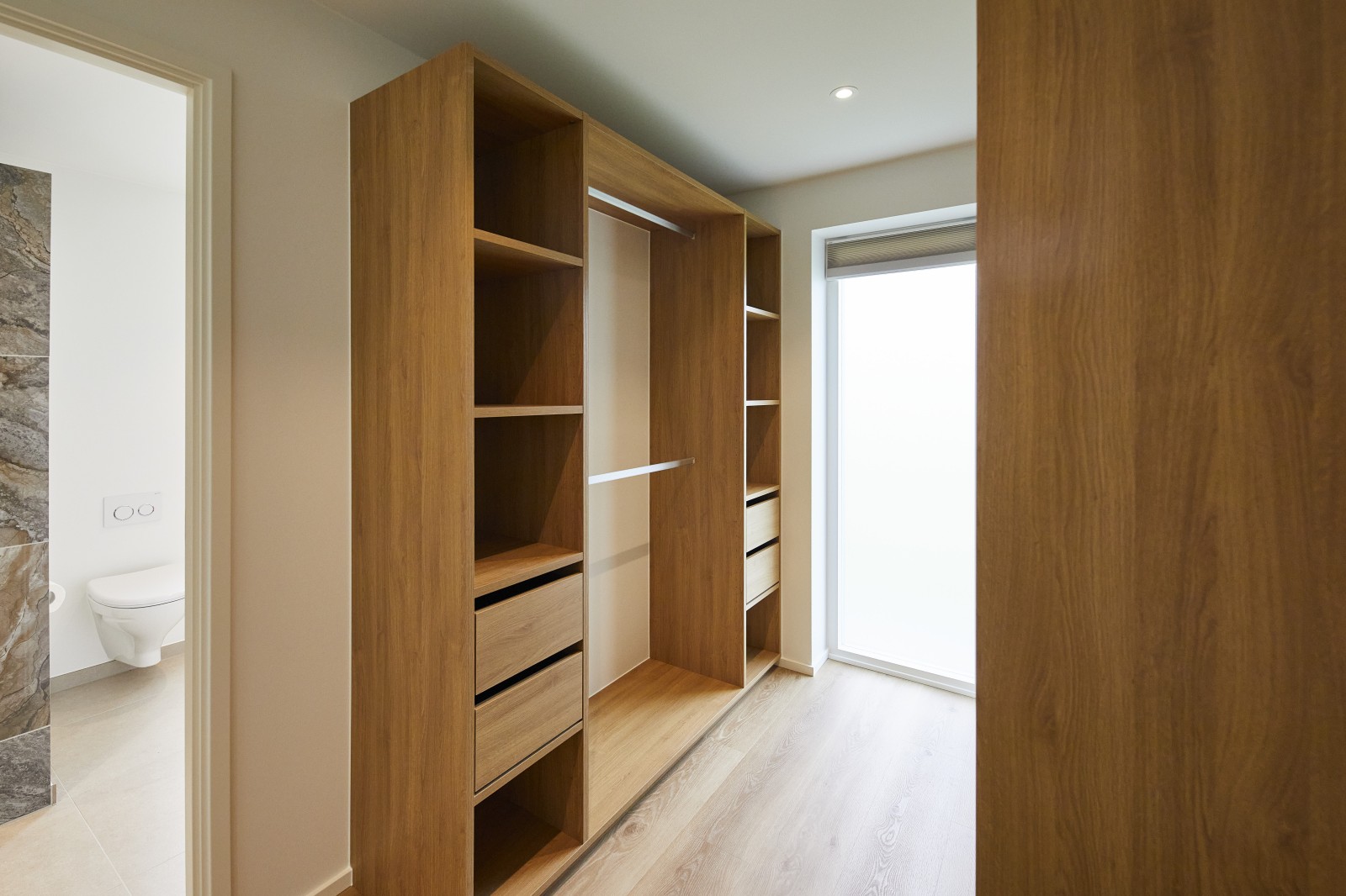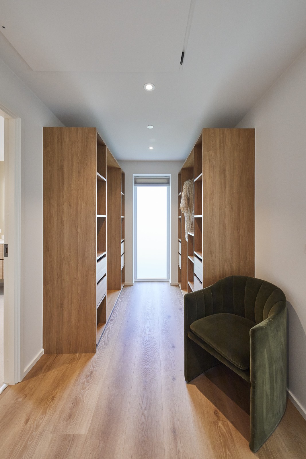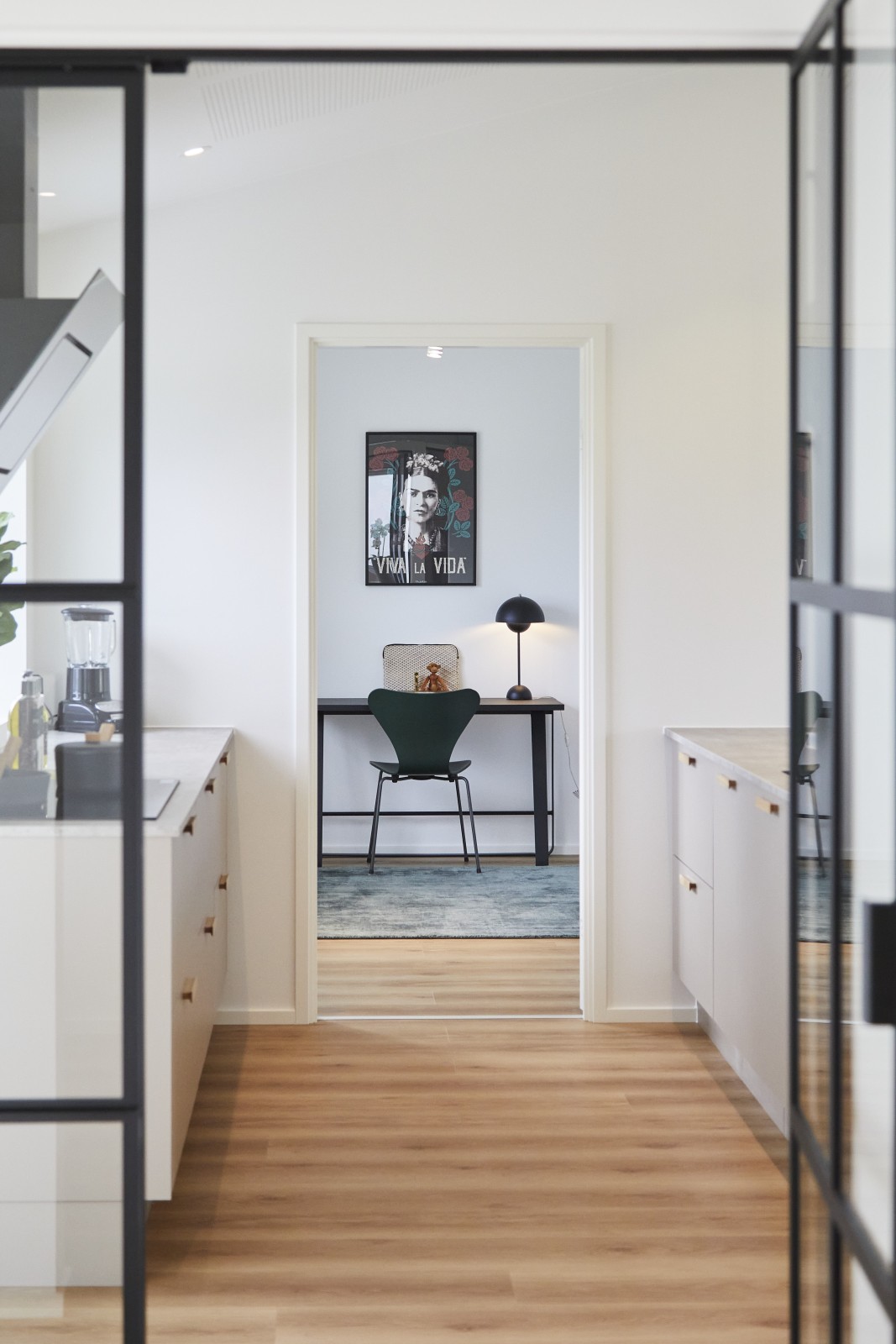 Multirummet fungerer samtidig som fordelingscentral og samlingspunkt i husets værelsesfløj. Et vaskerum er praktisk placeret, så det er nemt at smide tøj til vask uden at skulle krydse hele huset. Forældreafdelingen har eget bad, et stort walk-in og er placeret, så der altid kan lukkes to døre til fællesområdet og dermed skærmes for støj. I brusenichen er der desuden indbygget en bænk – en lille detalje, som giver ekstra funktionalitet i hverdagen.