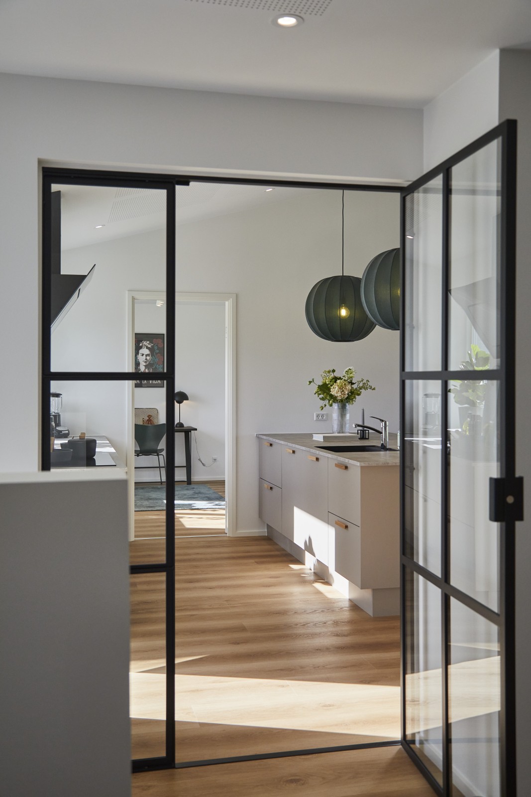 Køkken-alrumm, stue og kontor adskilles fra værelsesfløjen af en sort New Yorker-dør. Alrummet er åbent og lyst med skrålofter, store vinduespartier og udgang til begge sider. Rummet fortsætter i åben forbindelse til en hyggelig stue med udsigt til haven.