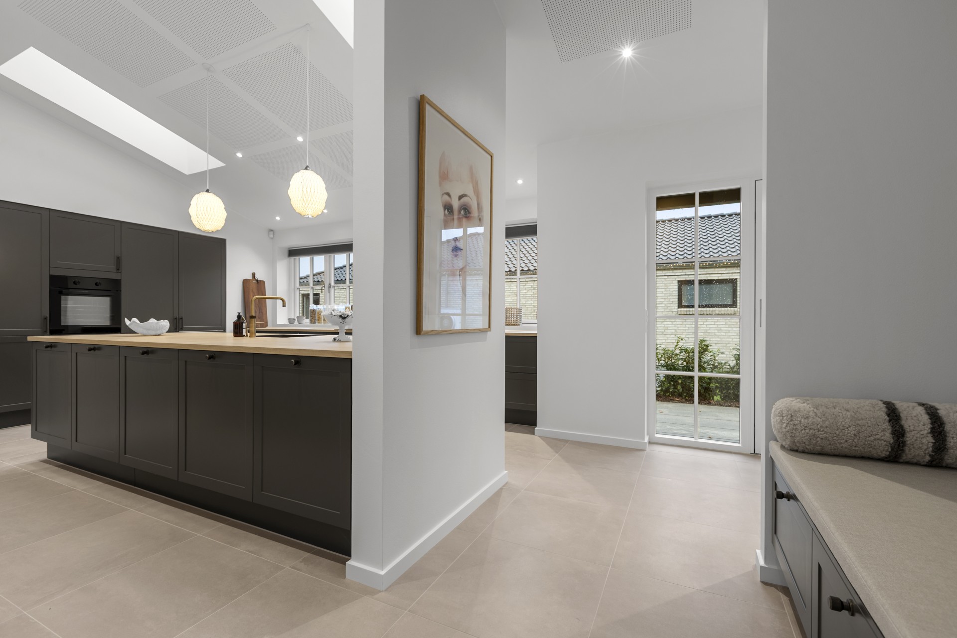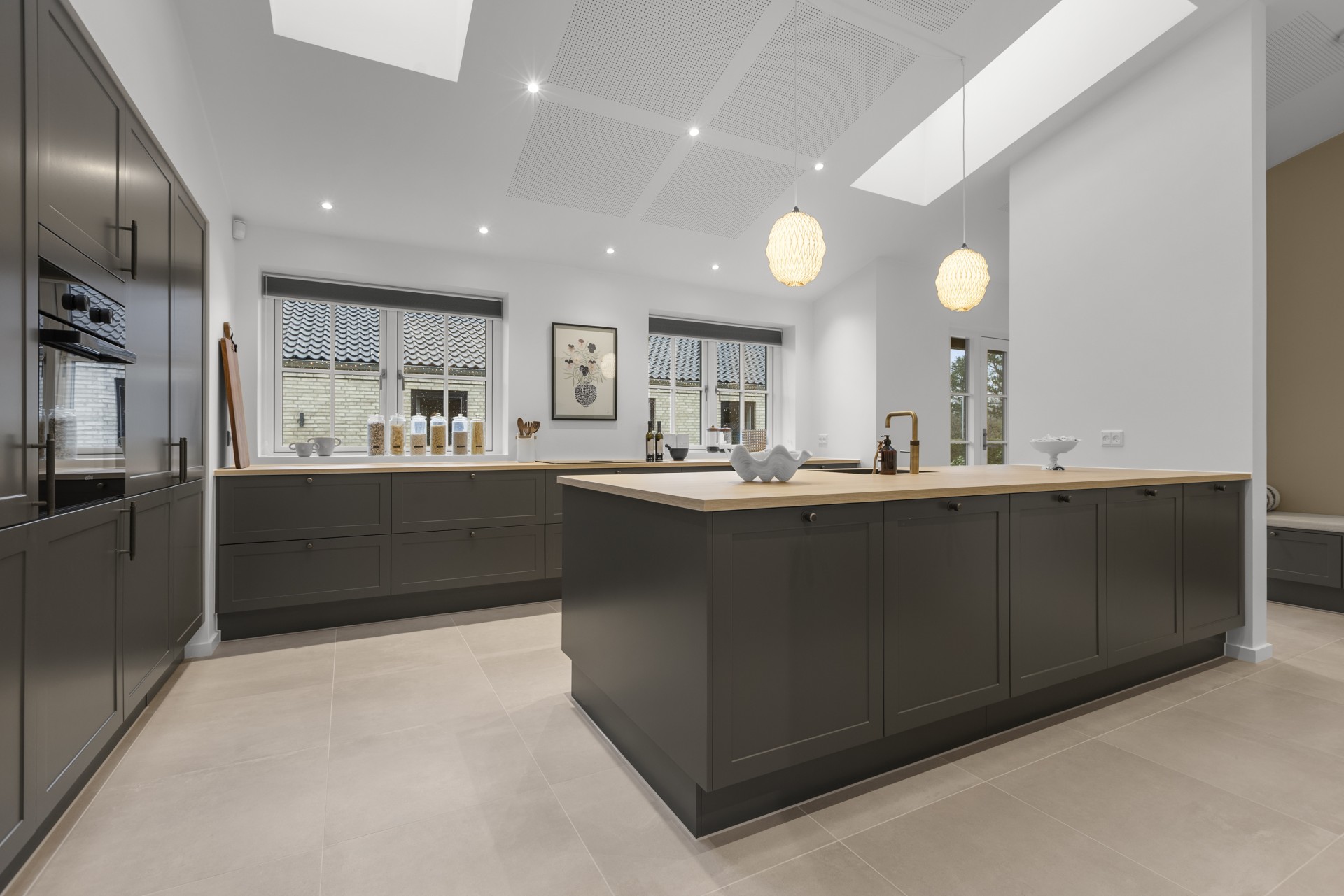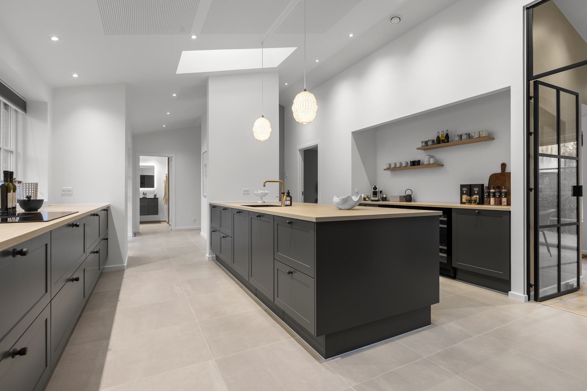 Køkkenet ligger for sig selv, hvilket er en sjælden egenskab i dag. Her er der kræset for detaljerne med skrålofter, ovenlys, god bordplads, vinkøleskab, stor køkkenø og bordemhætte. Et stort og praktisk depot med skjult indgang fuldender køkkenet, som er skabt til madglæde og fællesskab.