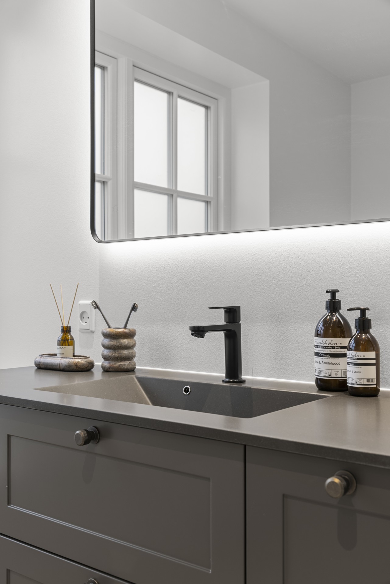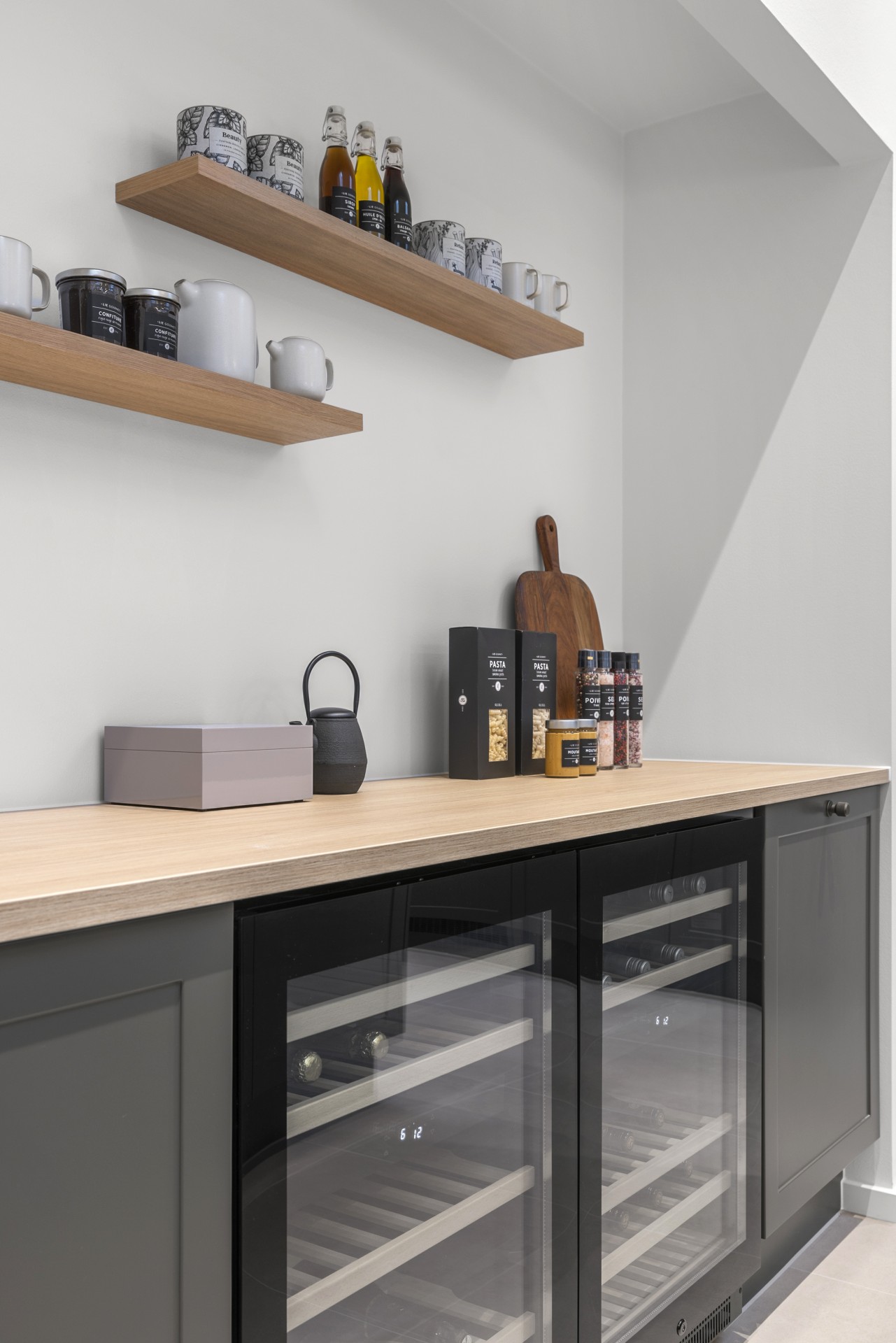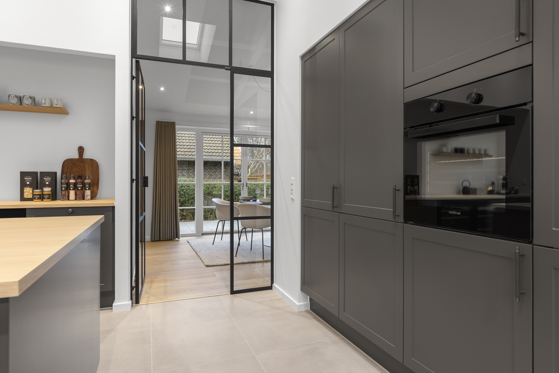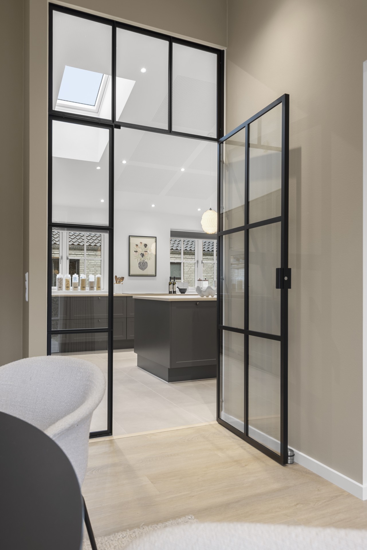 Køkkenet ligger for sig selv, hvilket er en sjælden egenskab i dag. Her er der kræset for detaljerne med skrålofter, ovenlys, god bordplads, vinkøleskab, stor køkkenø og bordemhætte. Et stort og praktisk depot med skjult indgang fuldender køkkenet, som er skabt til madglæde og fællesskab.