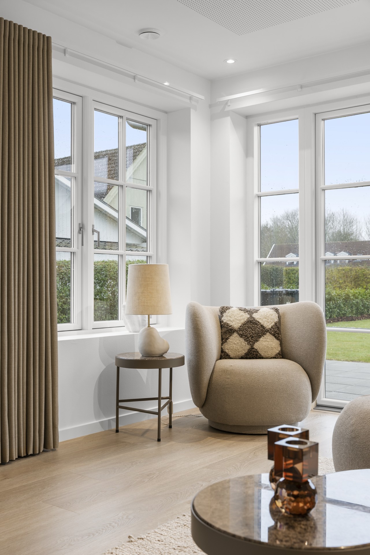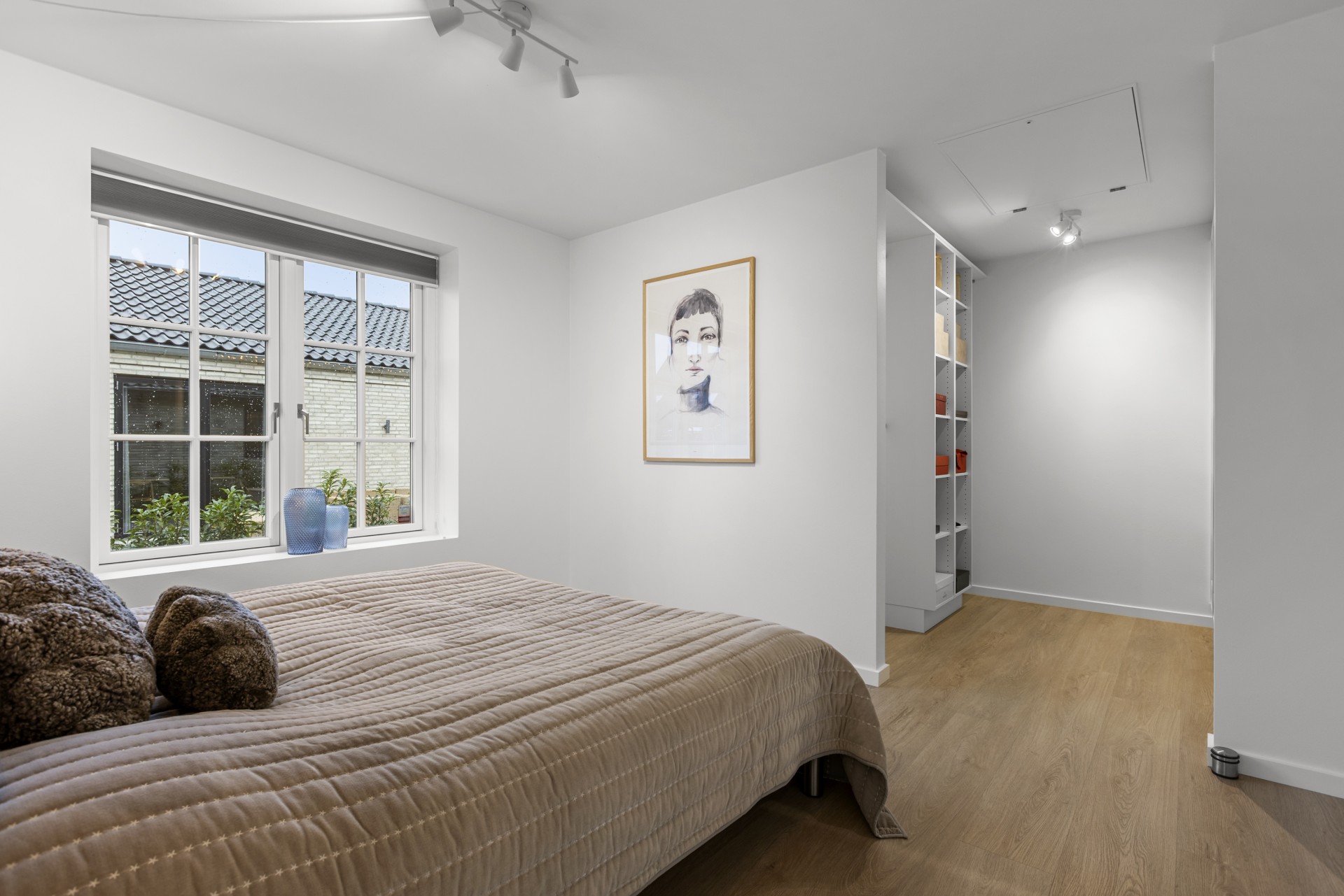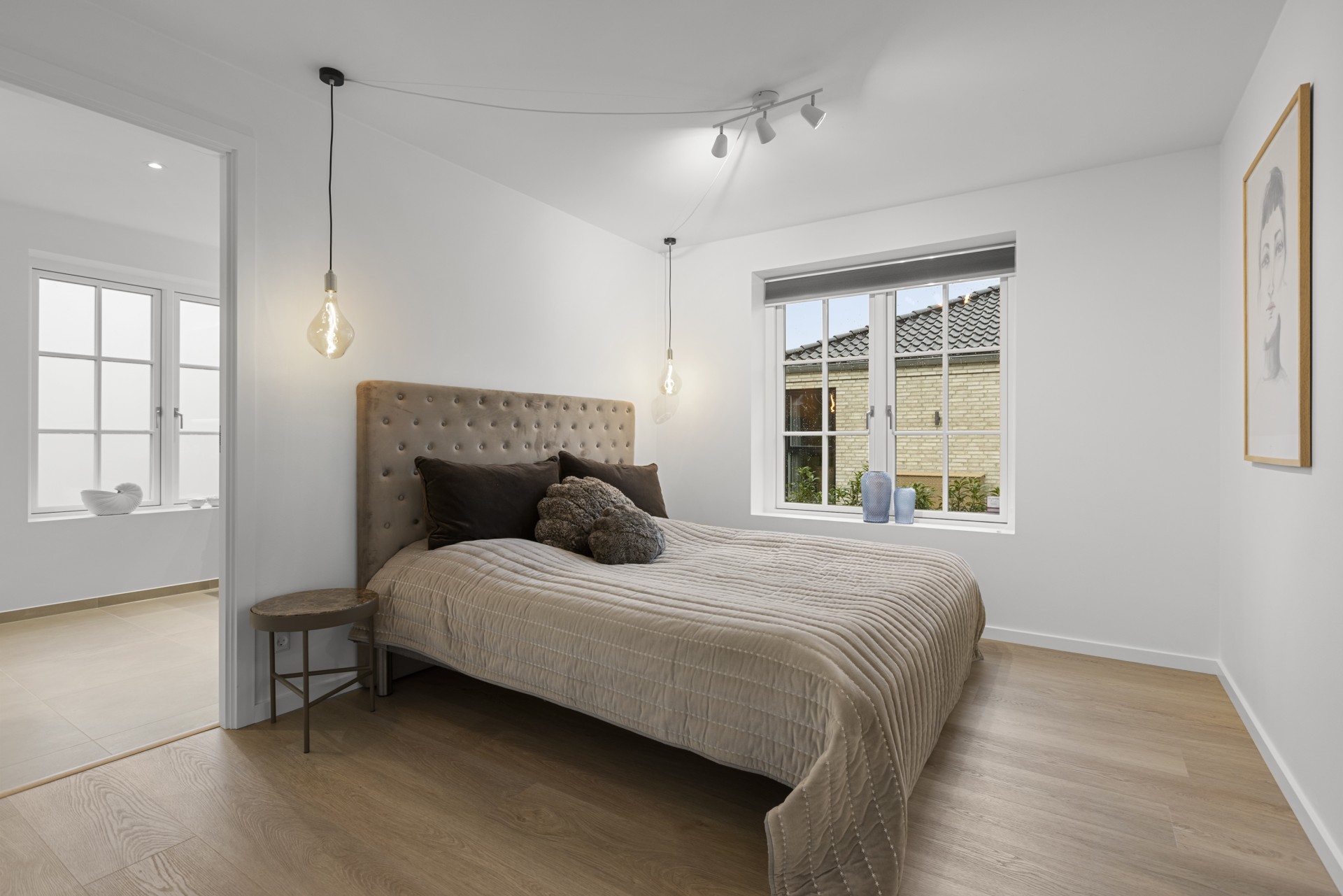 Indenfor finder man blandt andet gennemgående skrålofter, ovenlys og elegante newyorker-døre med sprossede glaspartier. Sammen med formpressede inventarlåger skaber det et både hyggeligt og nutidigt udtryk. Lysindfaldet er generøst, og rummene føles åbne og imødekommende. Vinduer med lav brystning giver masser af udsyn og lys.