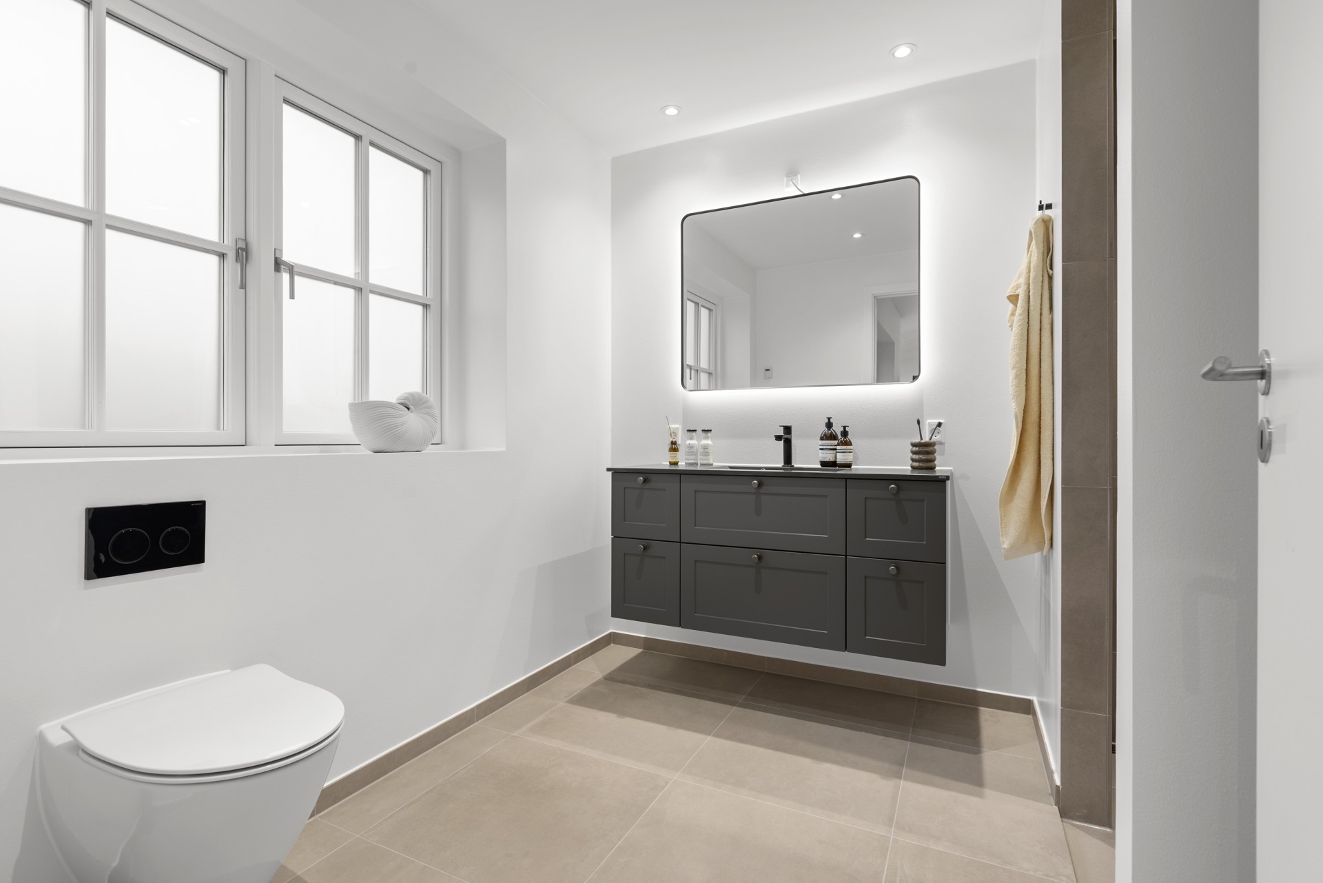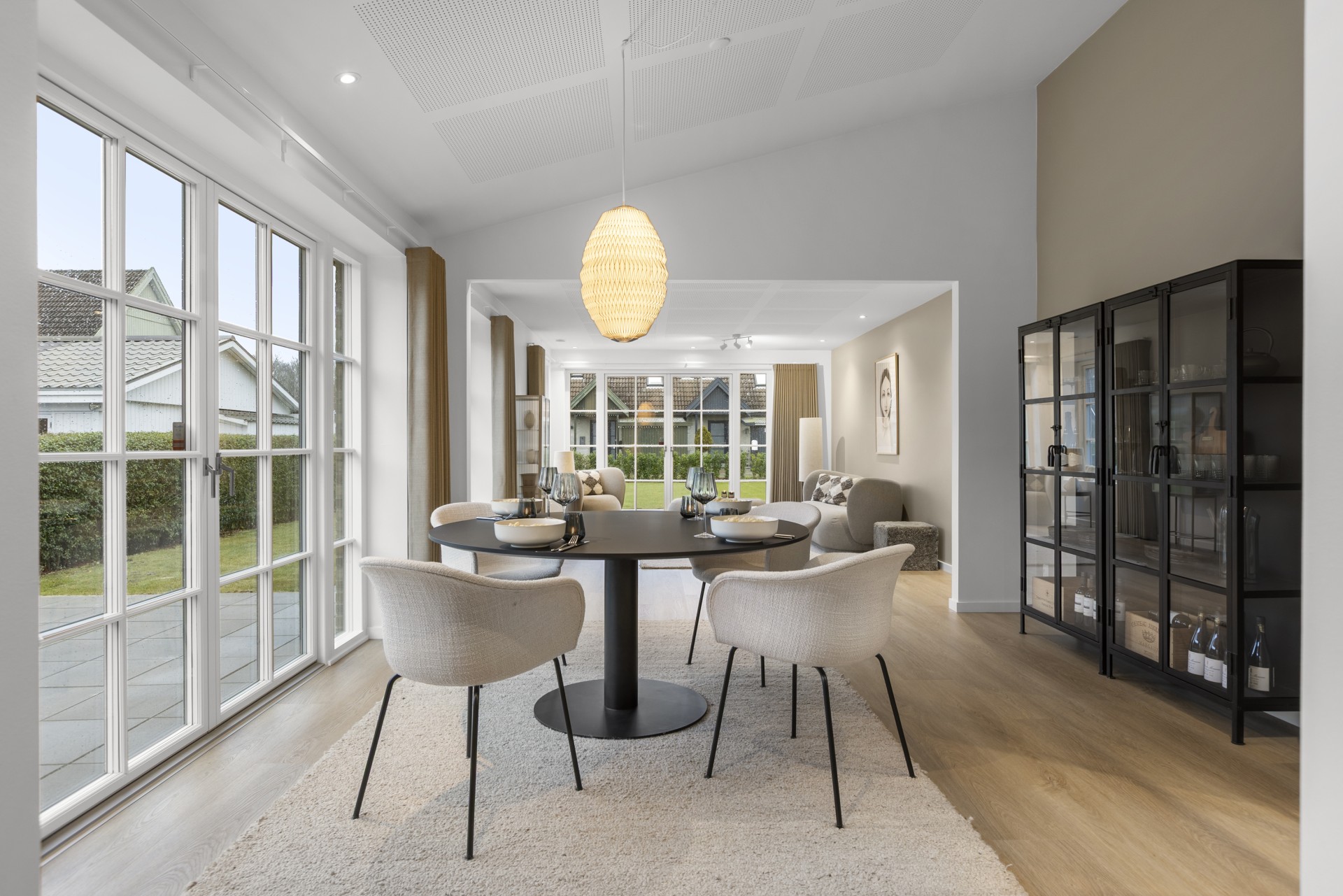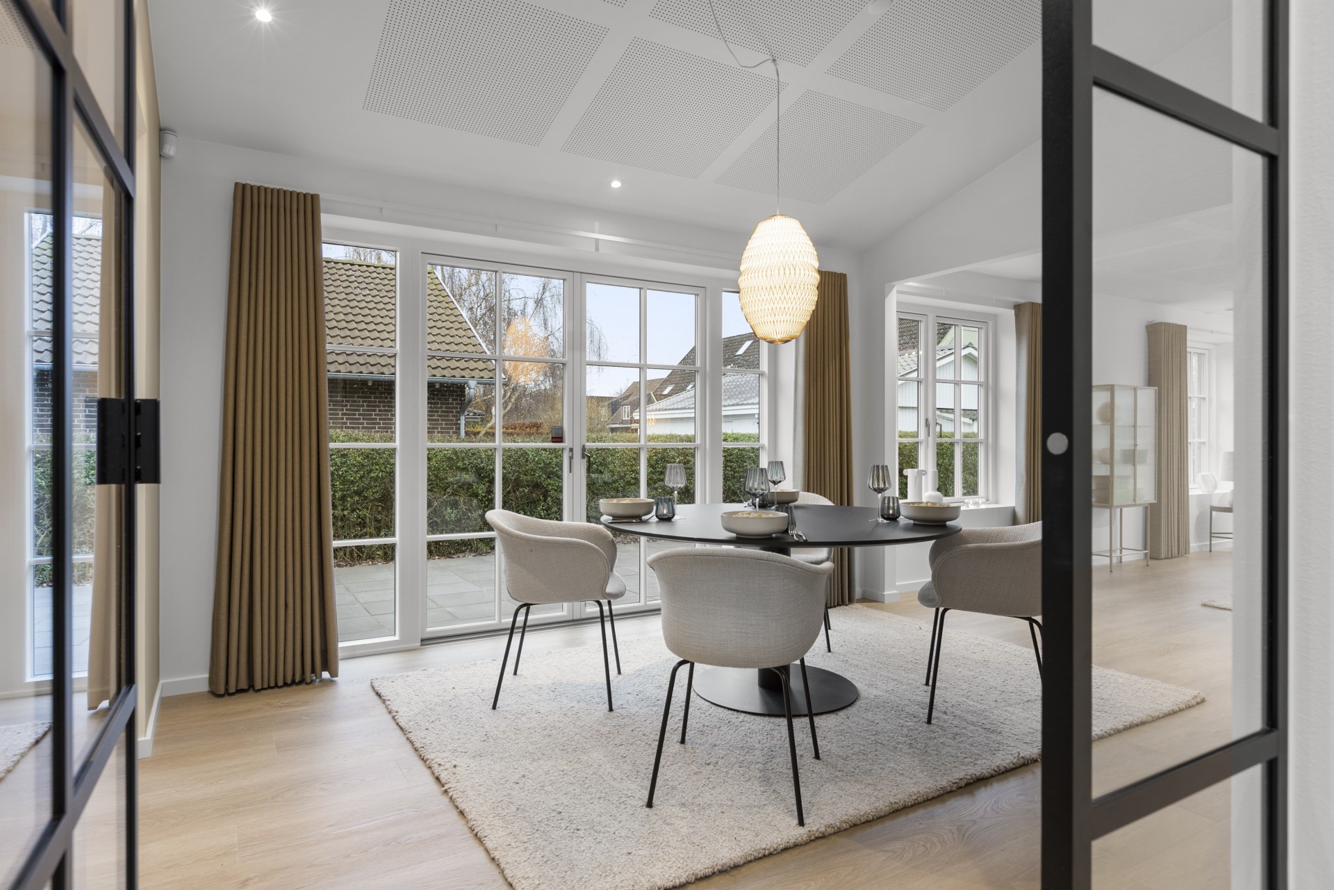 Indenfor finder man blandt andet gennemgående skrålofter, ovenlys og elegante newyorker-døre med sprossede glaspartier. Sammen med formpressede inventarlåger skaber det et både hyggeligt og nutidigt udtryk. Lysindfaldet er generøst, og rummene føles åbne og imødekommende. Vinduer med lav brystning giver masser af udsyn og lys.