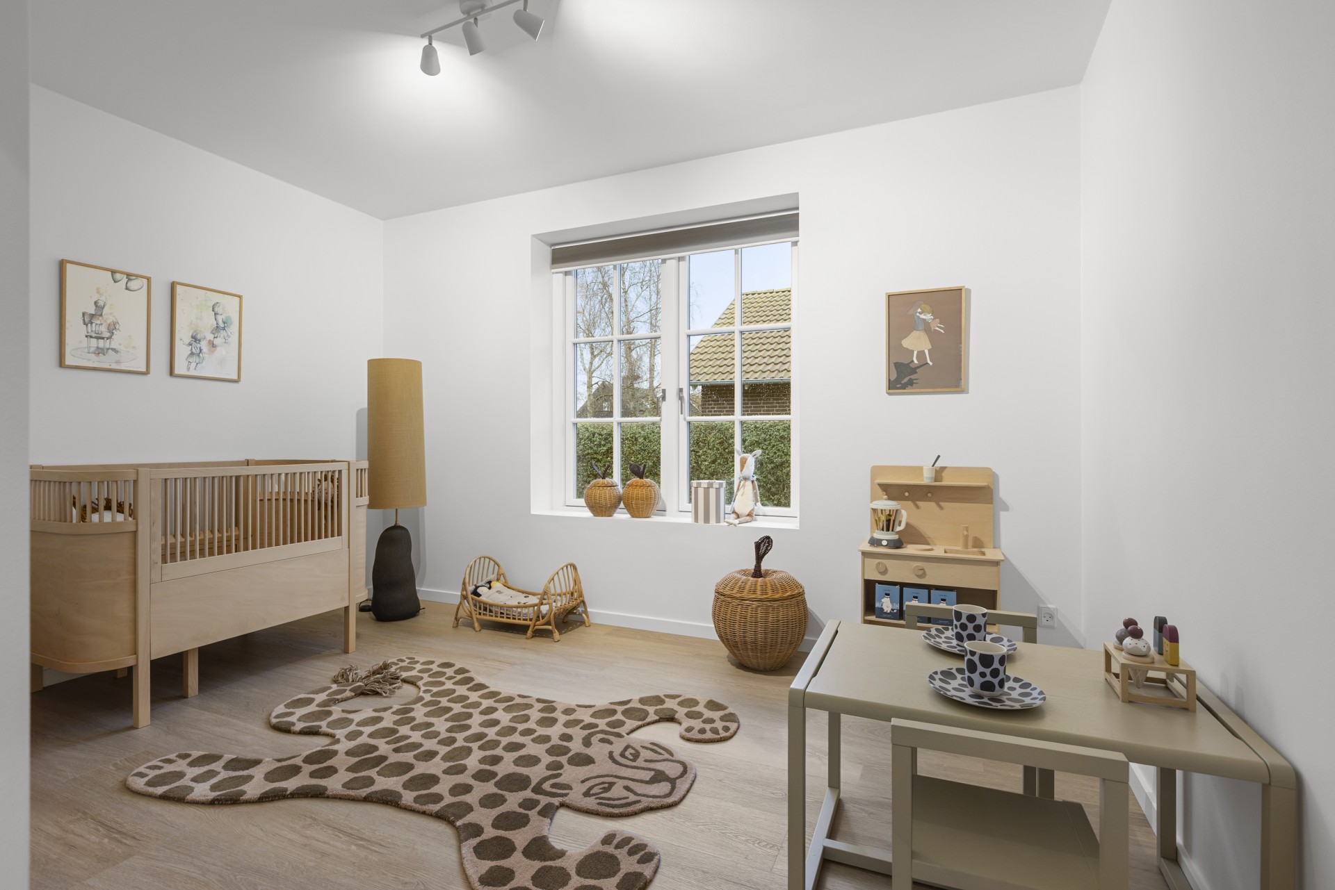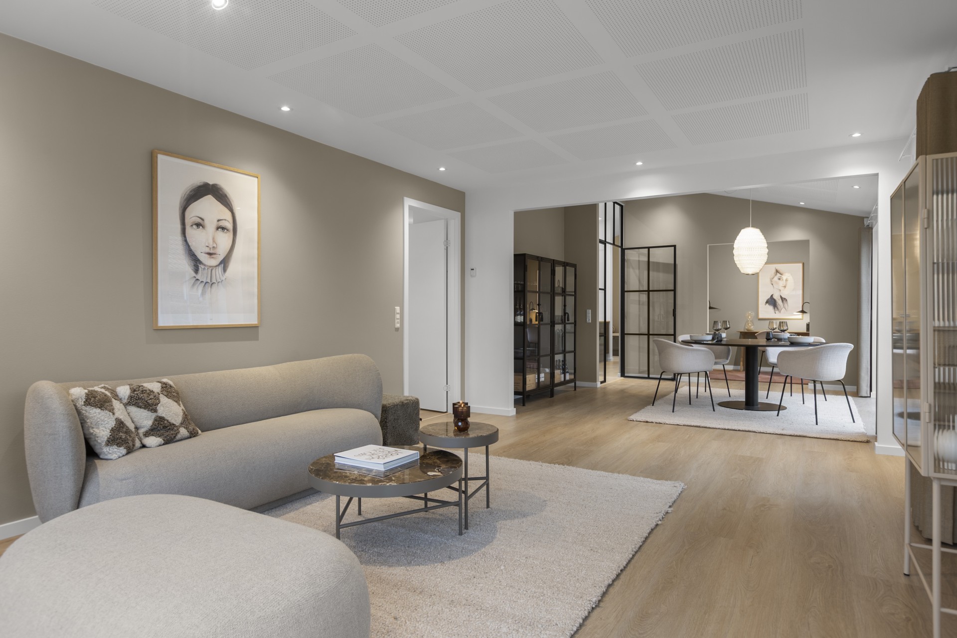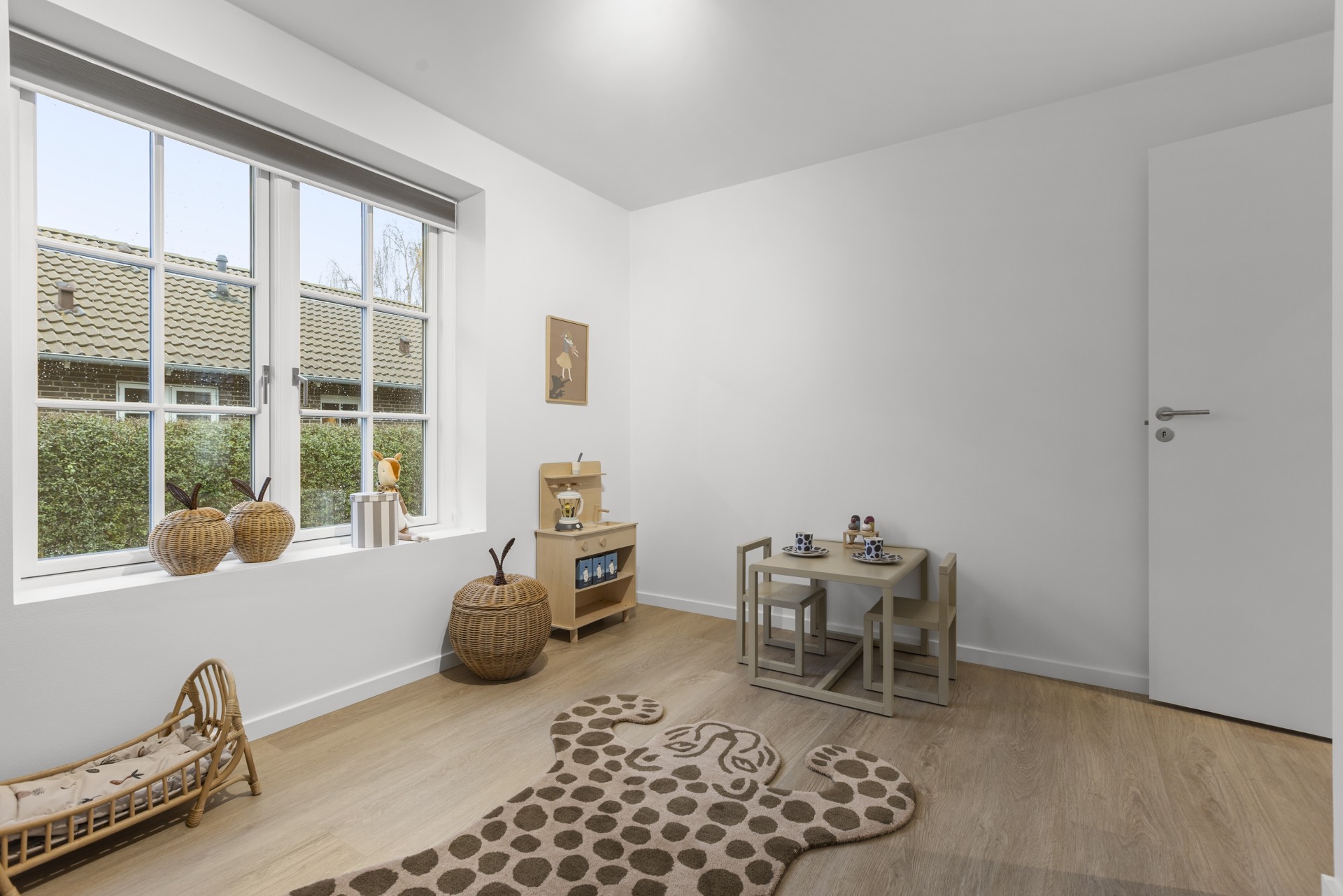 Spisestue og opholdsstue ligger i naturlig forlængelse af hinanden og har åben forbindelse til et mindre kontor, der også vil være ideelt som legerum, hvis du har små børn. Fra stuen er der adgang til en rolig og privat forældreafdeling med walk-in-closet og et stort badeværelse med dobbeltbruser.