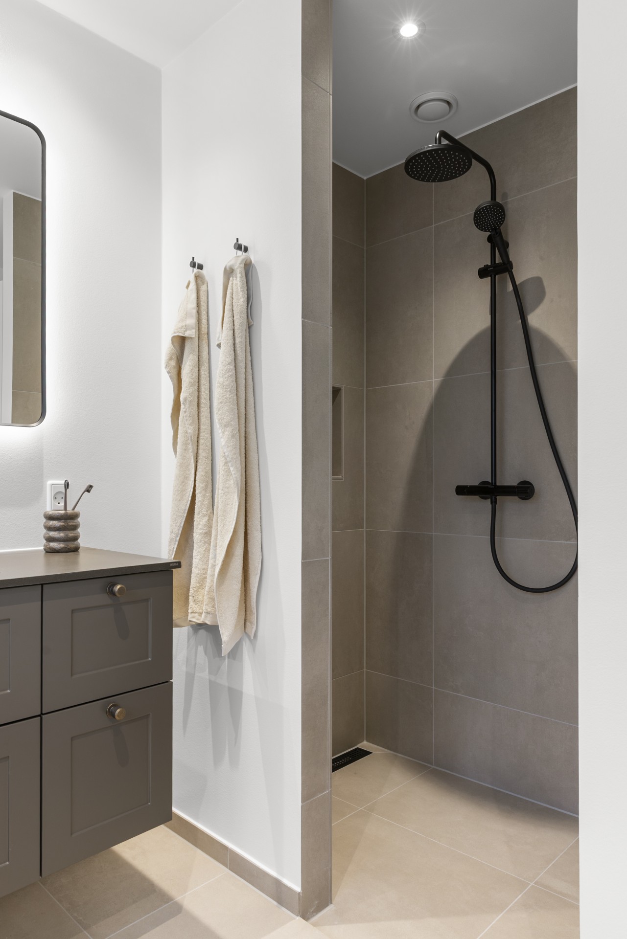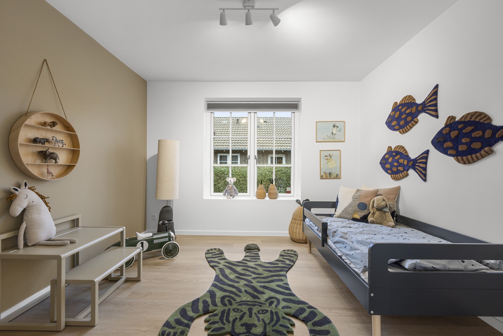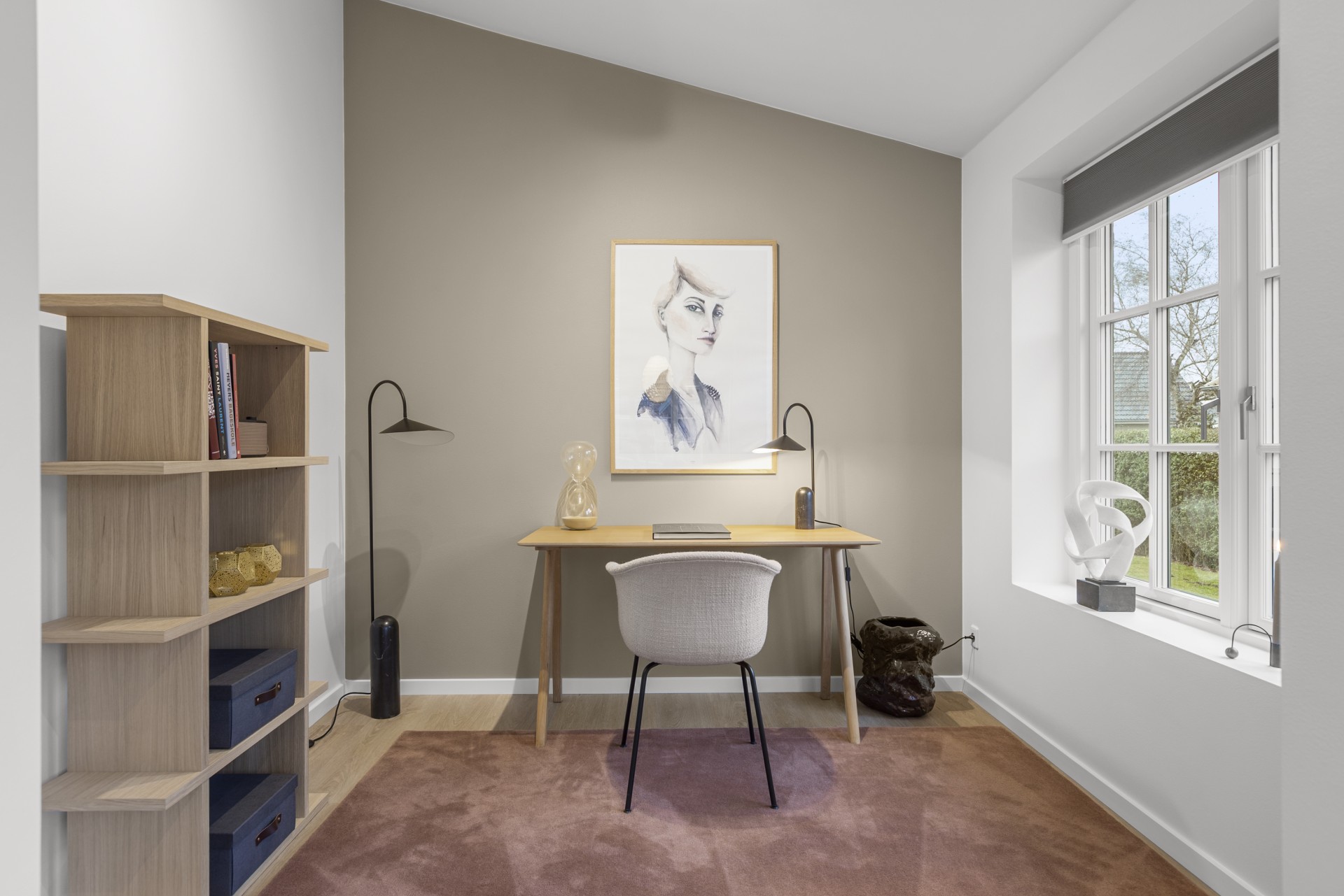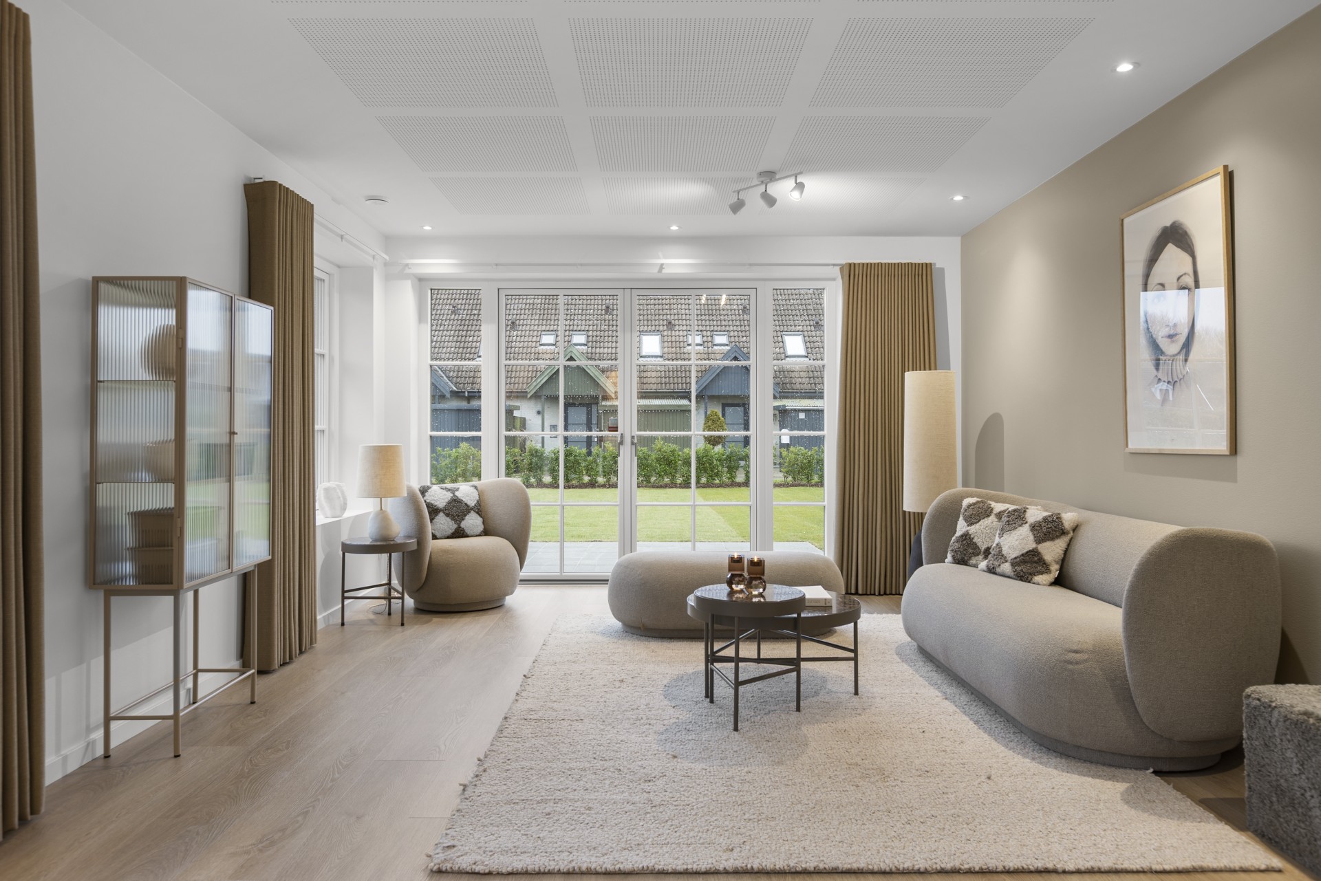 Spisestue og opholdsstue ligger i naturlig forlængelse af hinanden og har åben forbindelse til et mindre kontor, der også vil være ideelt som legerum, hvis du har små børn. Fra stuen er der adgang til en rolig og privat forældreafdeling med walk-in-closet og et stort badeværelse med dobbeltbruser.