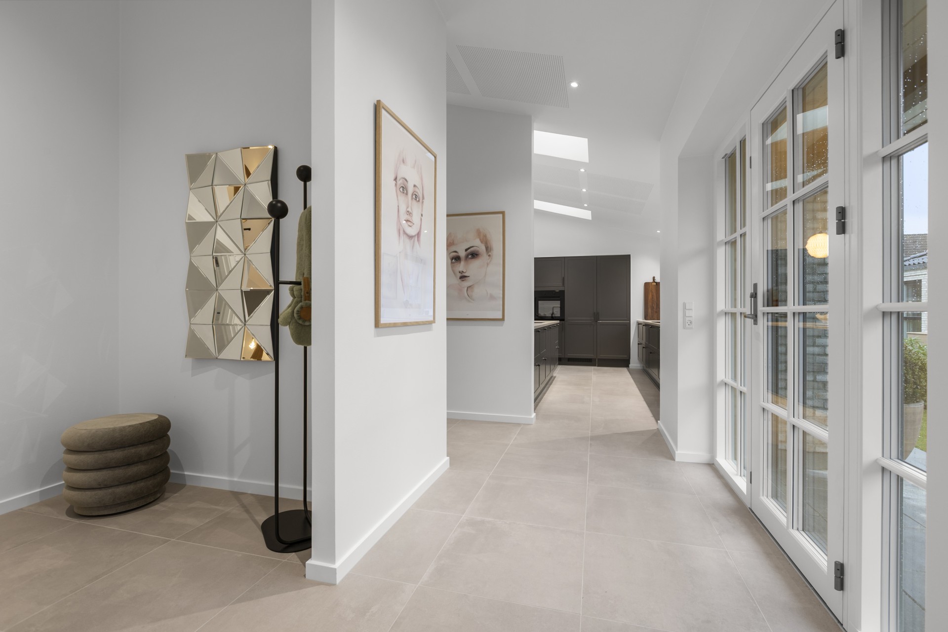 Et overdækket indgangsparti fører ind i en rummelig entré, der er opdelt af en skillevæg med integreret siddebænk på den ene side og en praktisk niche til sko/overtøj på den anden.
