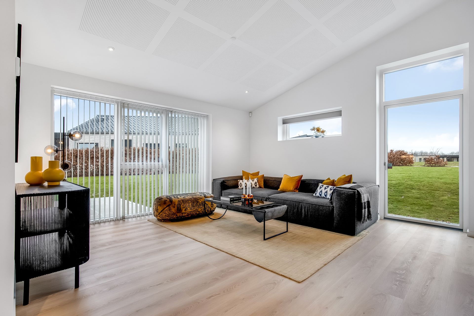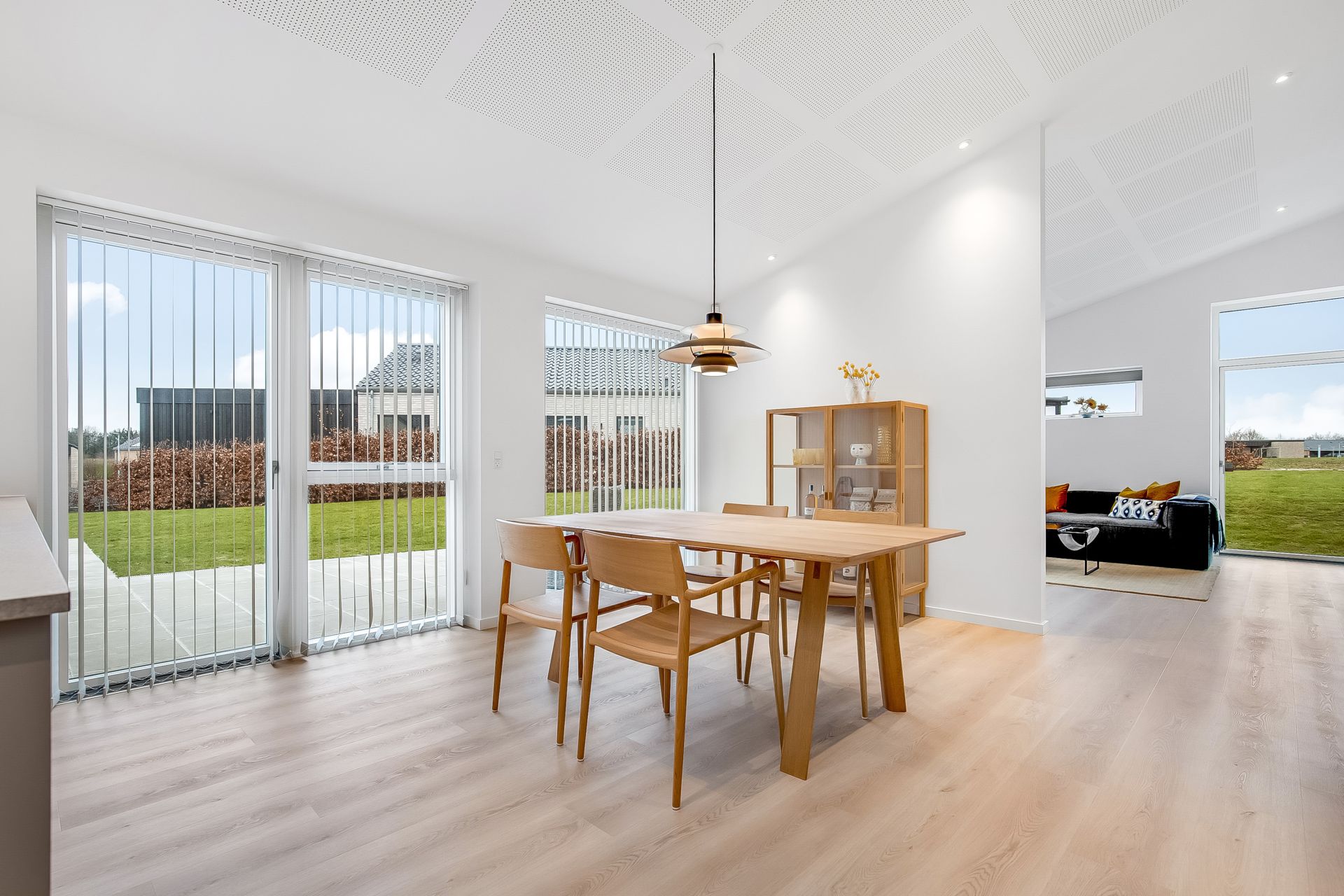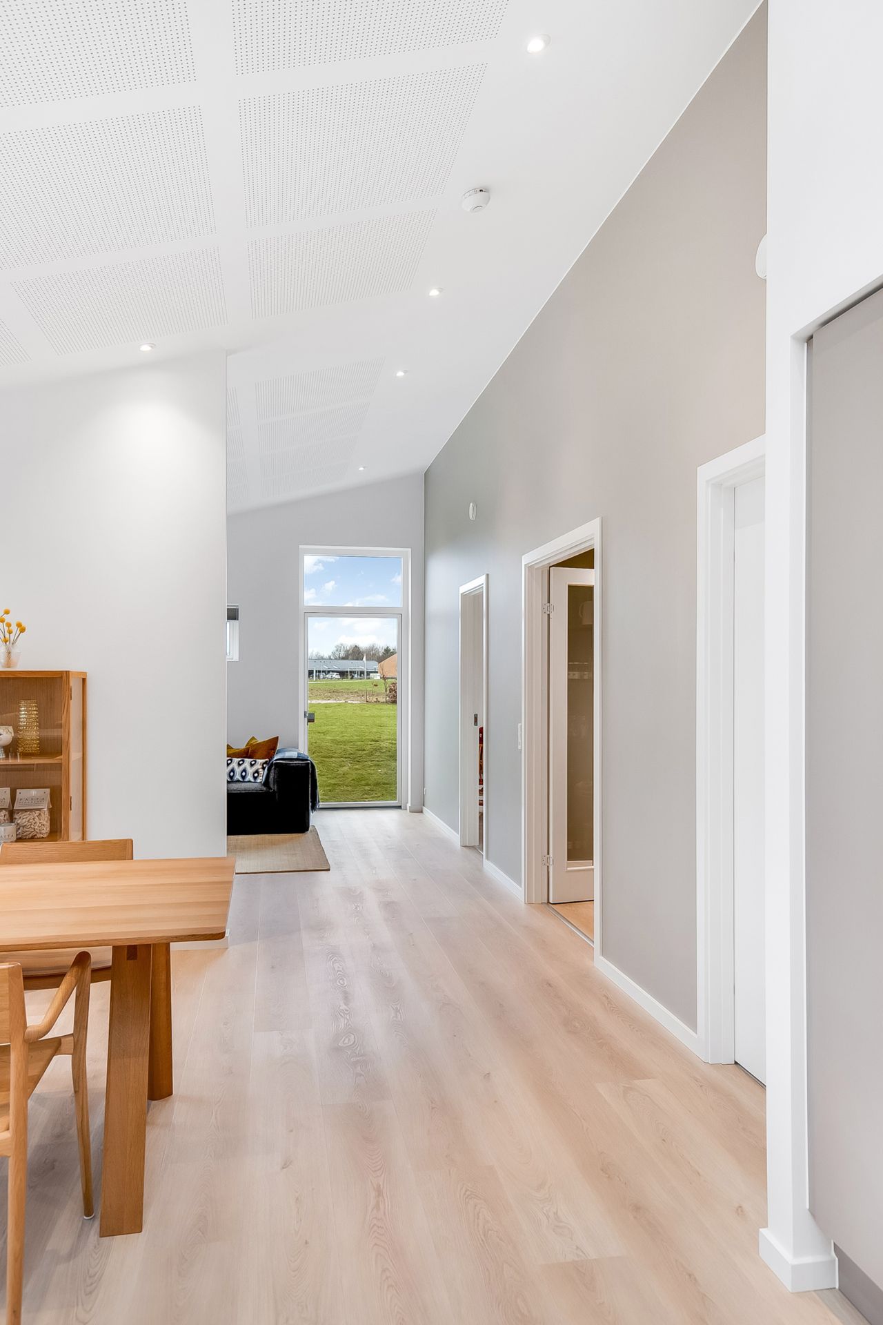 En væsentlig detalje er den nordvendte glasdør med overparti for enden af stuen. Den sender masser af blødt dagslys ind i stue og alrum og forstærker med sin højde følelsen af rumlighed og åbenhed, så snart du træder ind. En anden detalje er det store opbevaringsrum med glasdøre, som kan bruges fleksibelt – eksempelvis til vinrum, opbevaring eller udstilling af din keramiksamling.