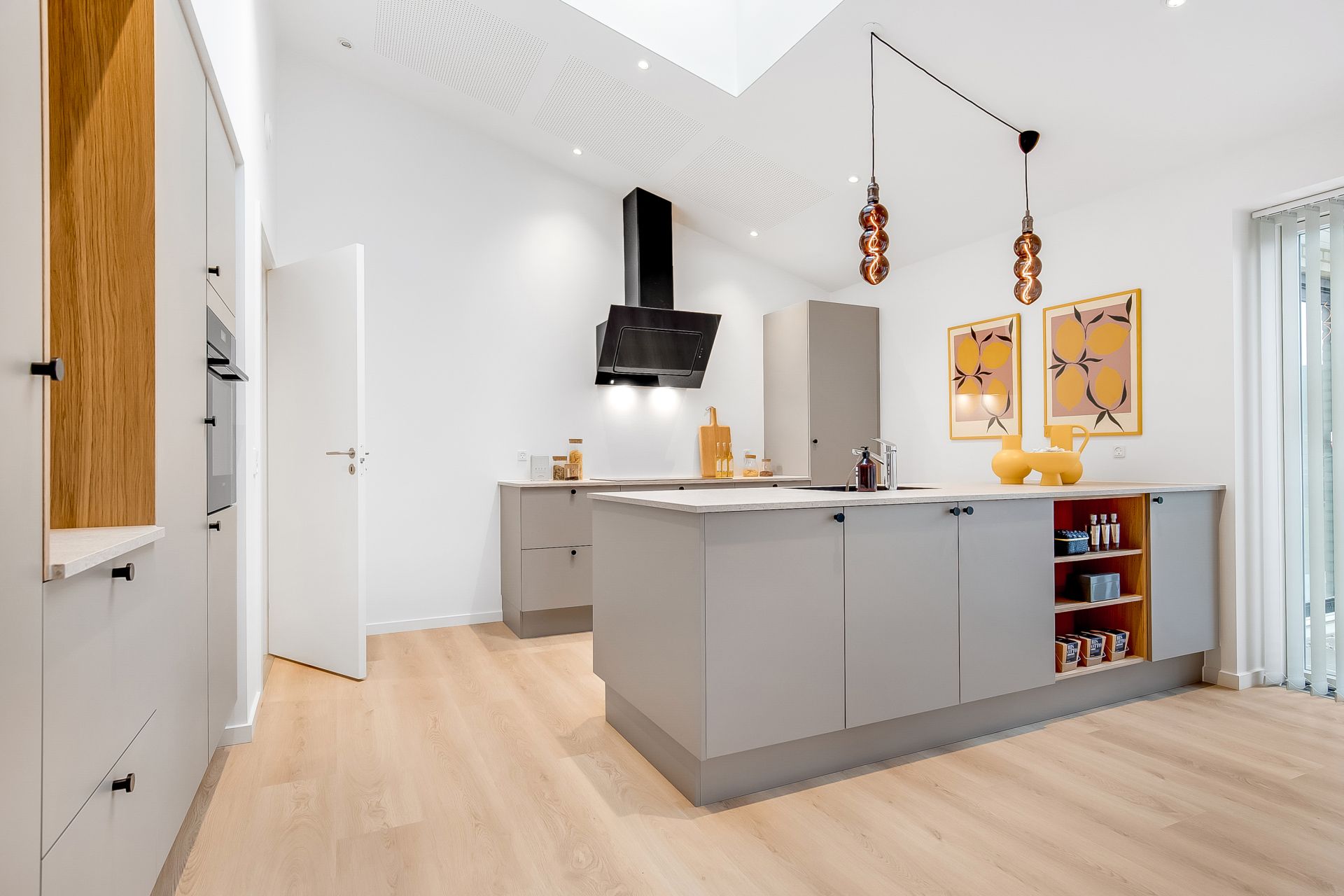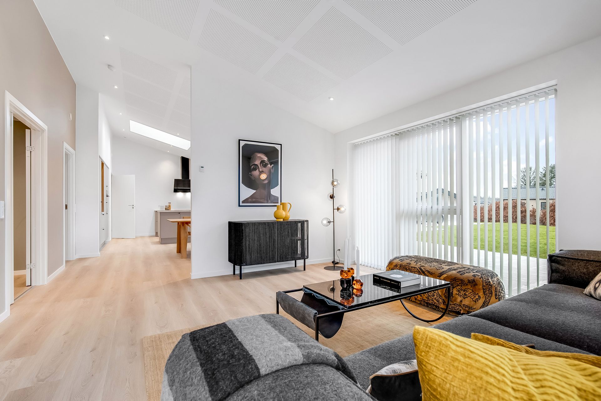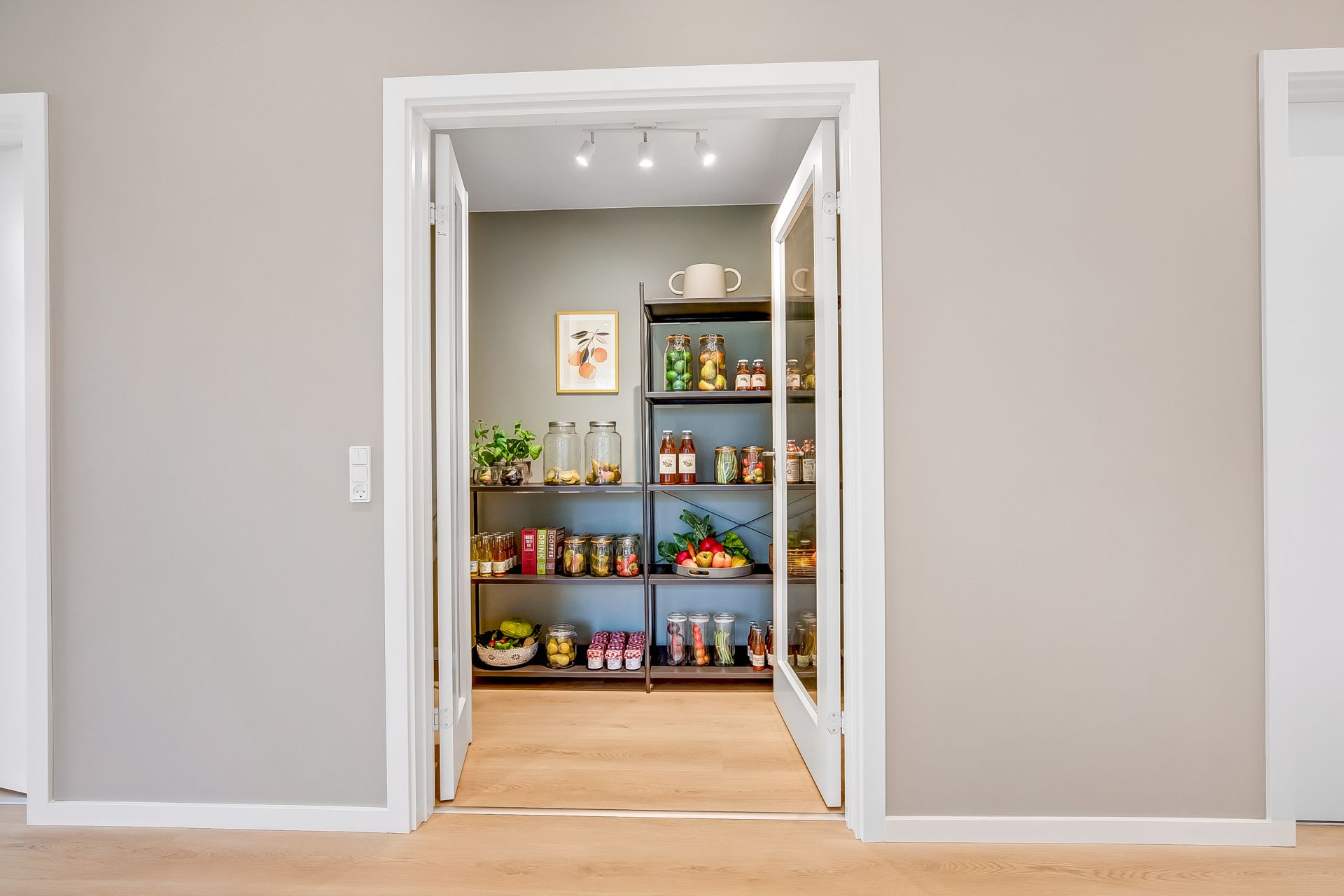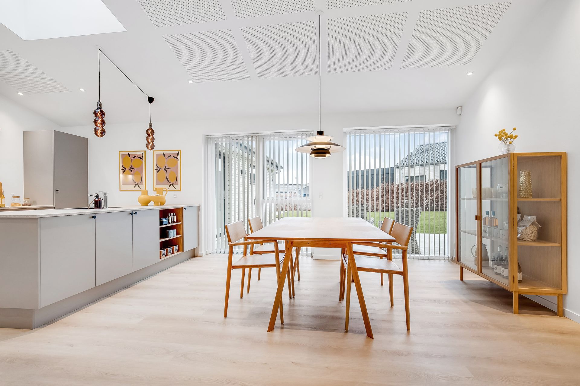 En væsentlig detalje er den nordvendte glasdør med overparti for enden af stuen. Den sender masser af blødt dagslys ind i stue og alrum og forstærker med sin højde følelsen af rumlighed og åbenhed, så snart du træder ind. En anden detalje er det store opbevaringsrum med glasdøre, som kan bruges fleksibelt – eksempelvis til vinrum, opbevaring eller udstilling af din keramiksamling.