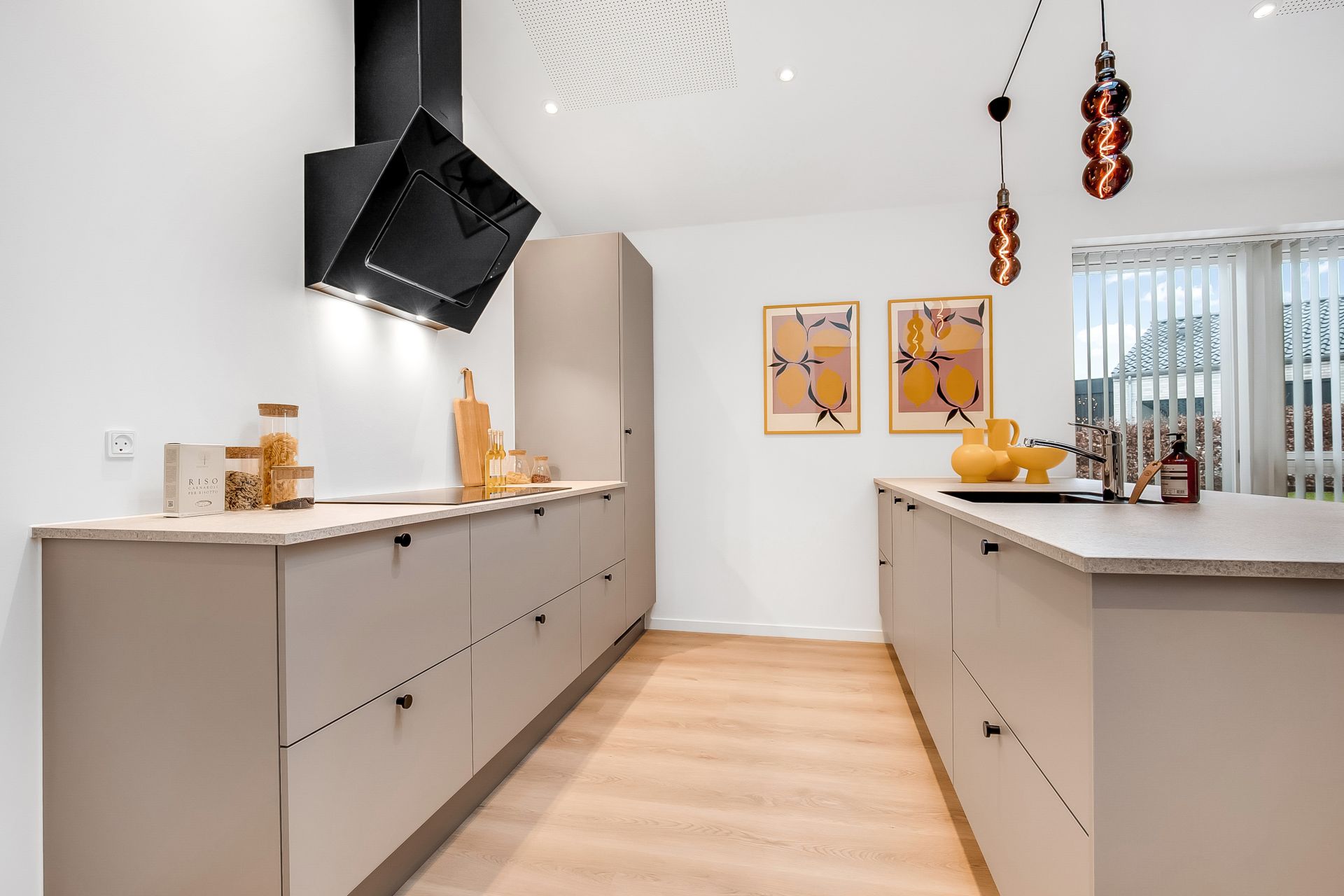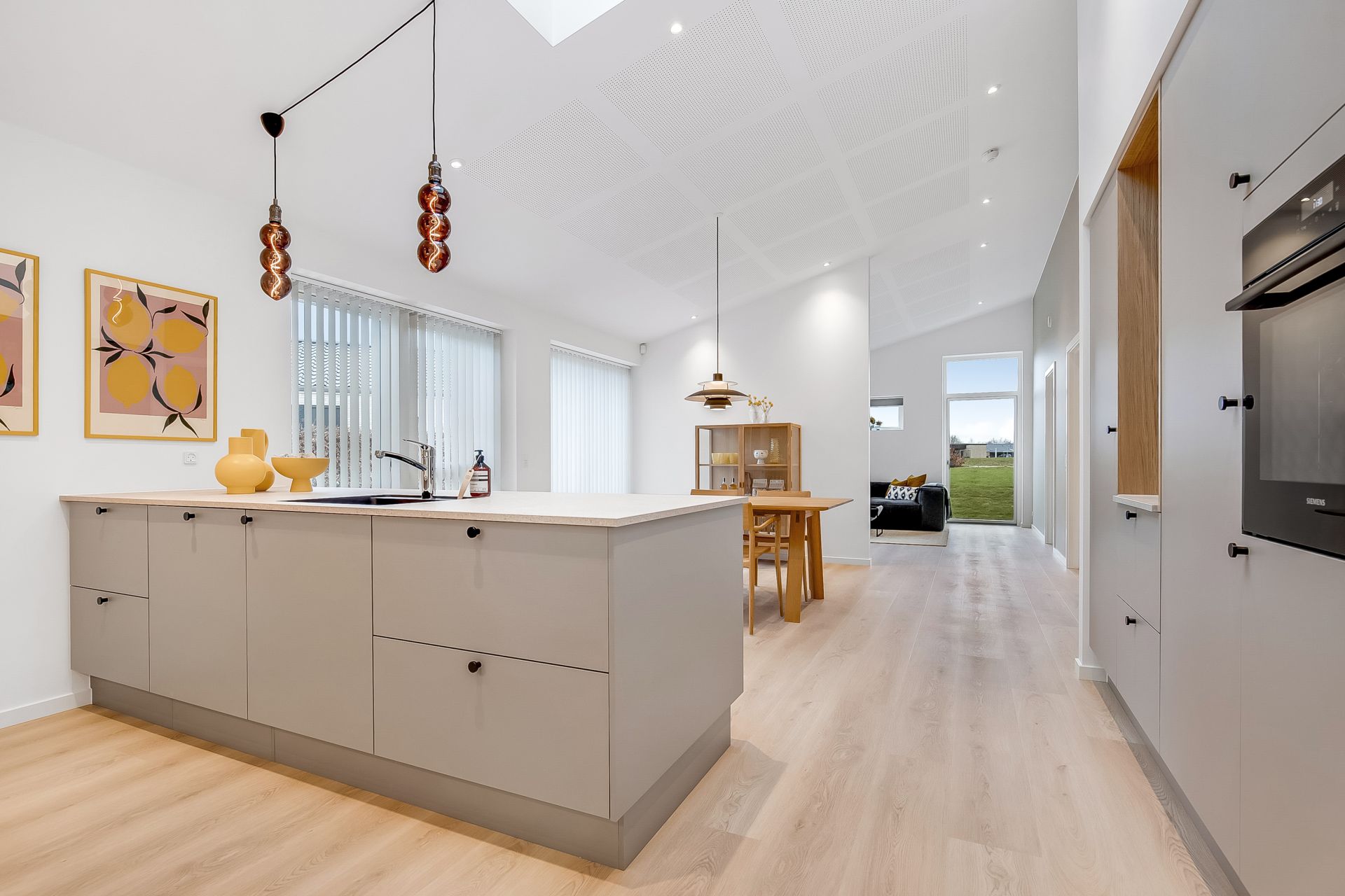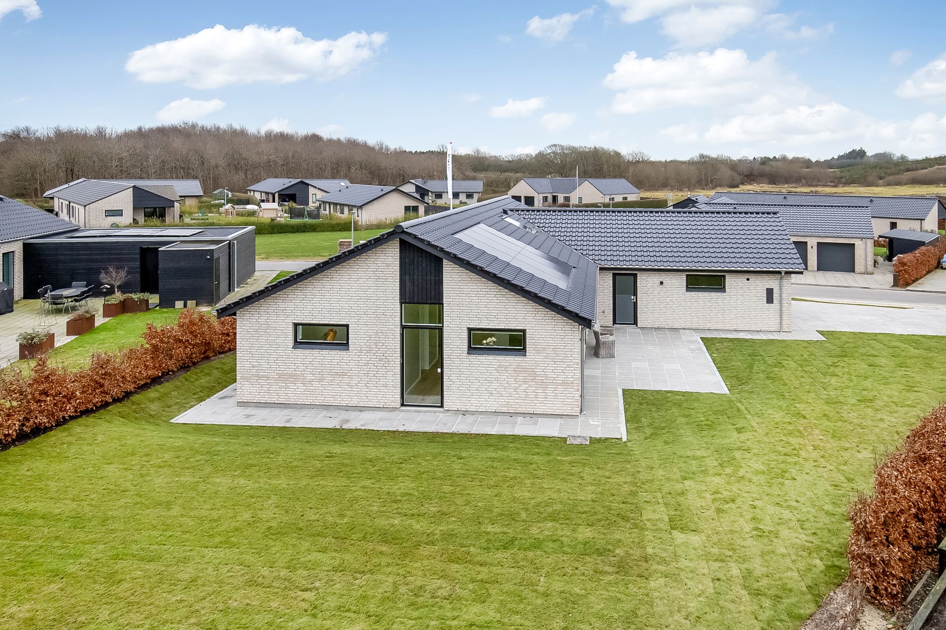 Dette vinkelhus på 160 kvm er designet til at favne et komfortabelt og aktivt hverdagsliv. Det naturlige omdrejningspunkt er det store køkken-alrum, hvor skråloft, ovenlys og store vinduespartier skaber en åben og imødekommende stemning.