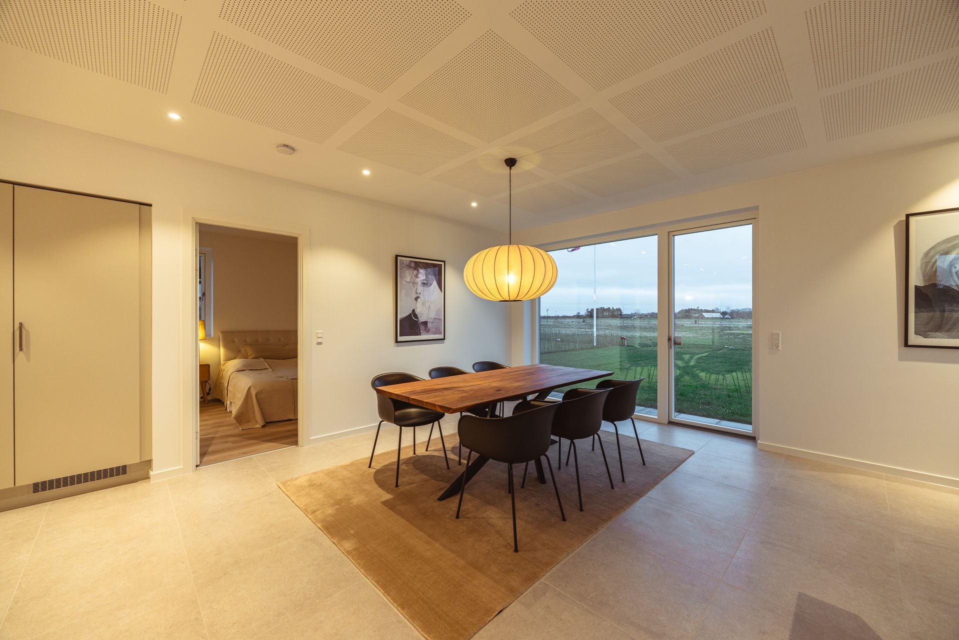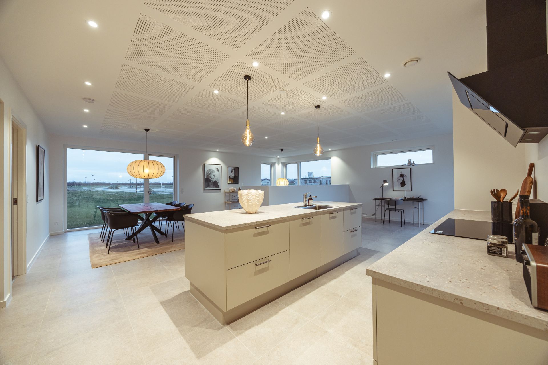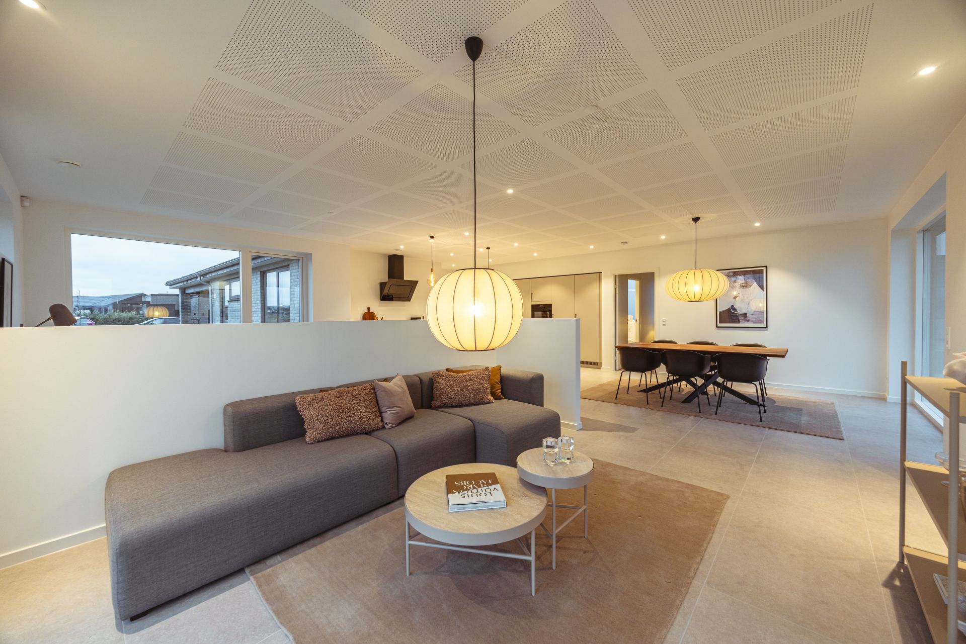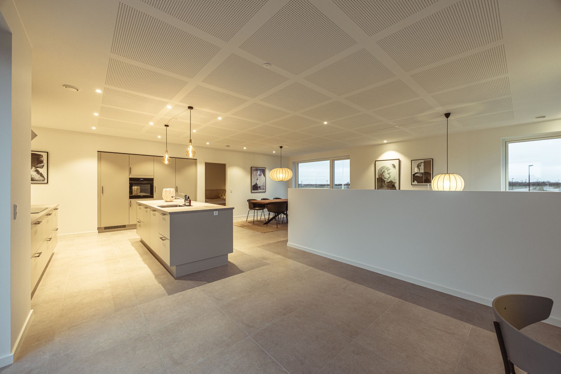 Boligen er indrettet med lyse og vedligeholdelseslette materialer hele vejen igennem, gode opbevaringsmuligheder og akustiklofter i det store opholdsrum. Der er gulvvarme i hele huset samt et ventilationssystem med varmegenvinding, som bidrager til et sundt indeklima og en lav energiregning.