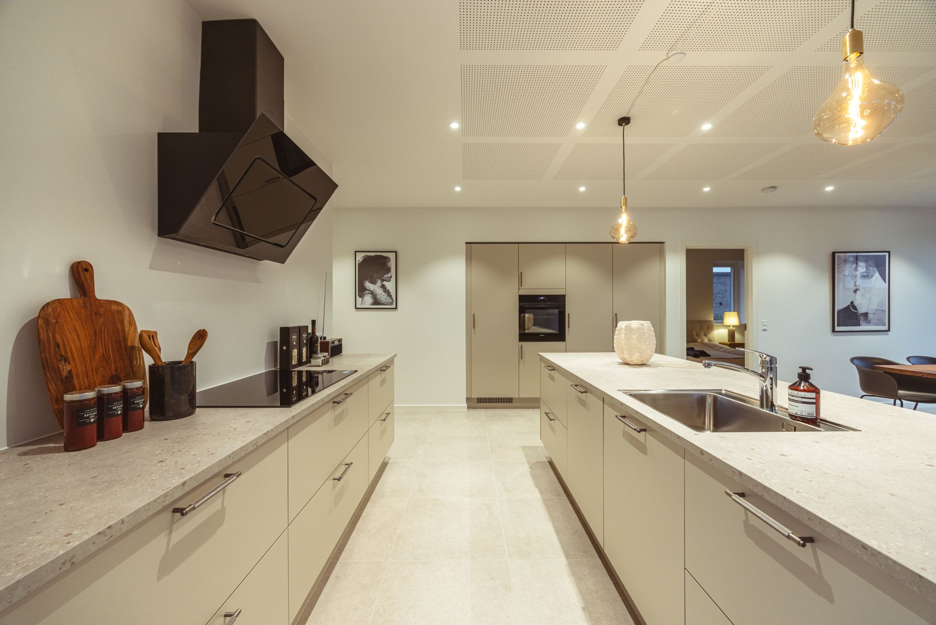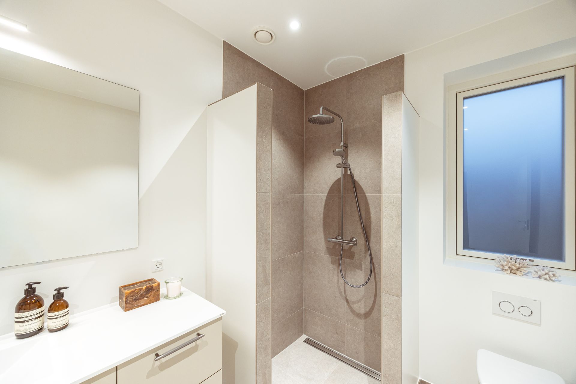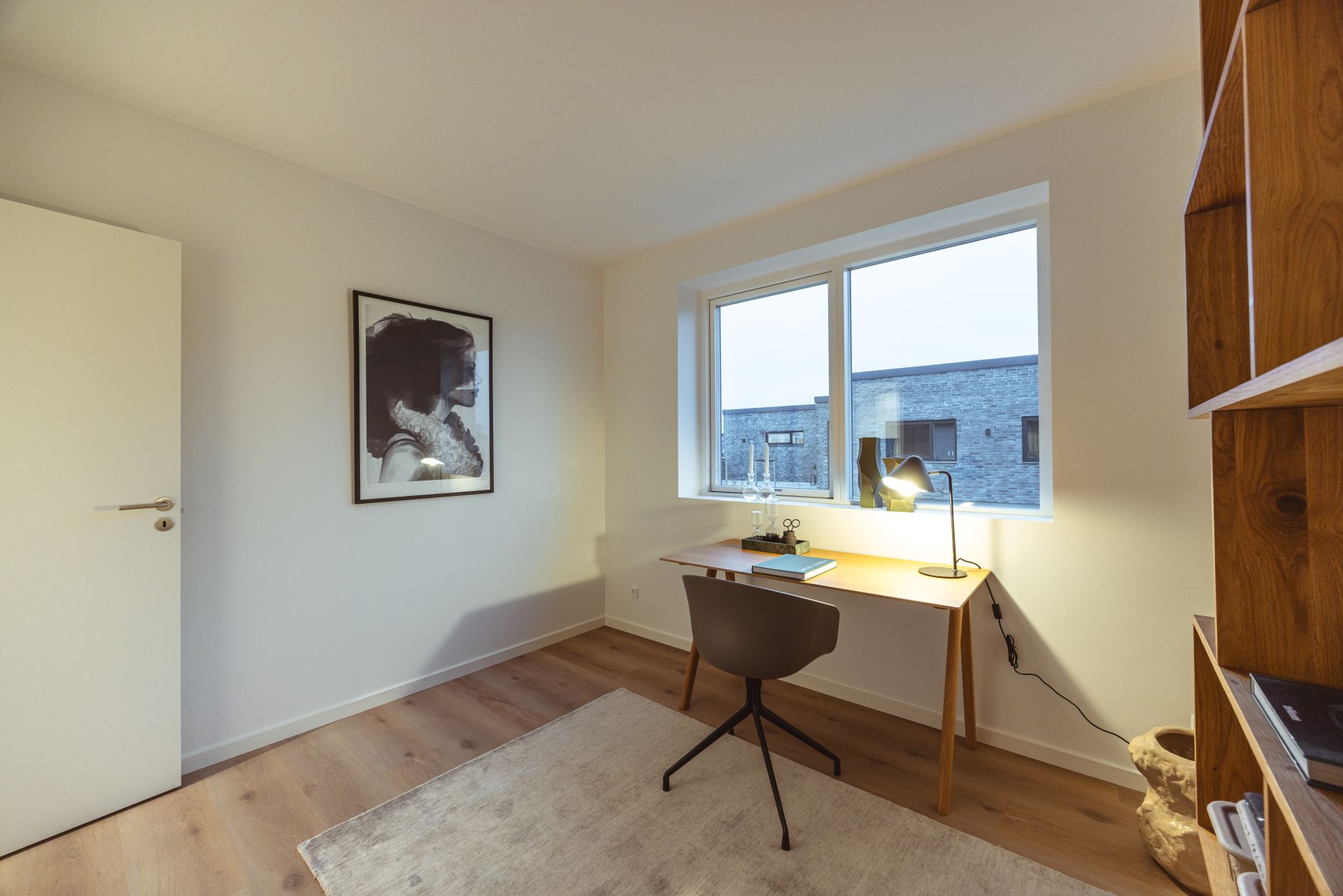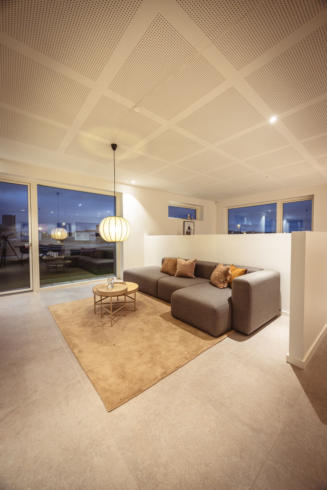 Boligen er indrettet med lyse og vedligeholdelseslette materialer hele vejen igennem, gode opbevaringsmuligheder og akustiklofter i det store opholdsrum. Der er gulvvarme i hele huset samt et ventilationssystem med varmegenvinding, som bidrager til et sundt indeklima og en lav energiregning.