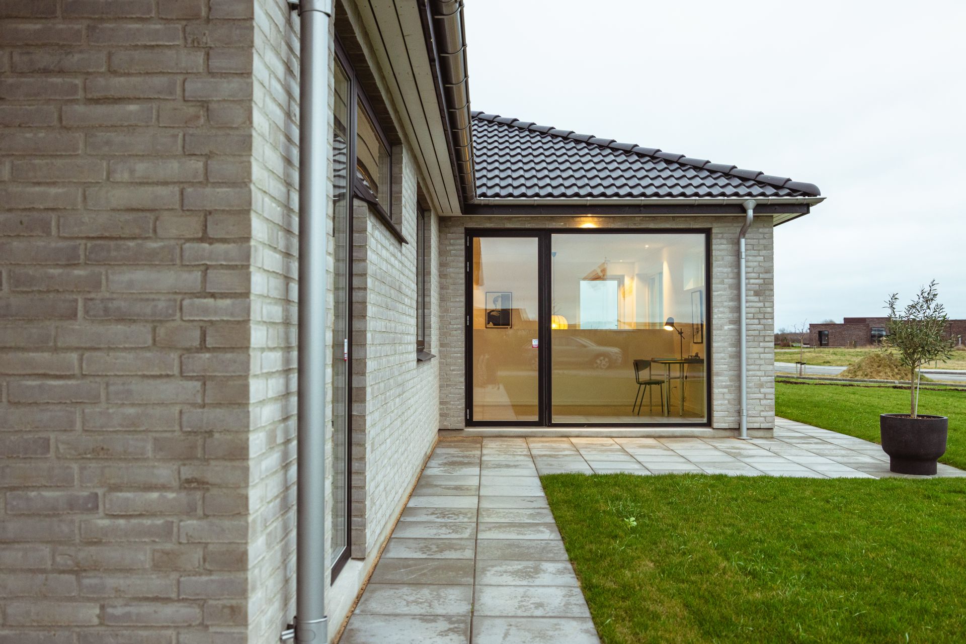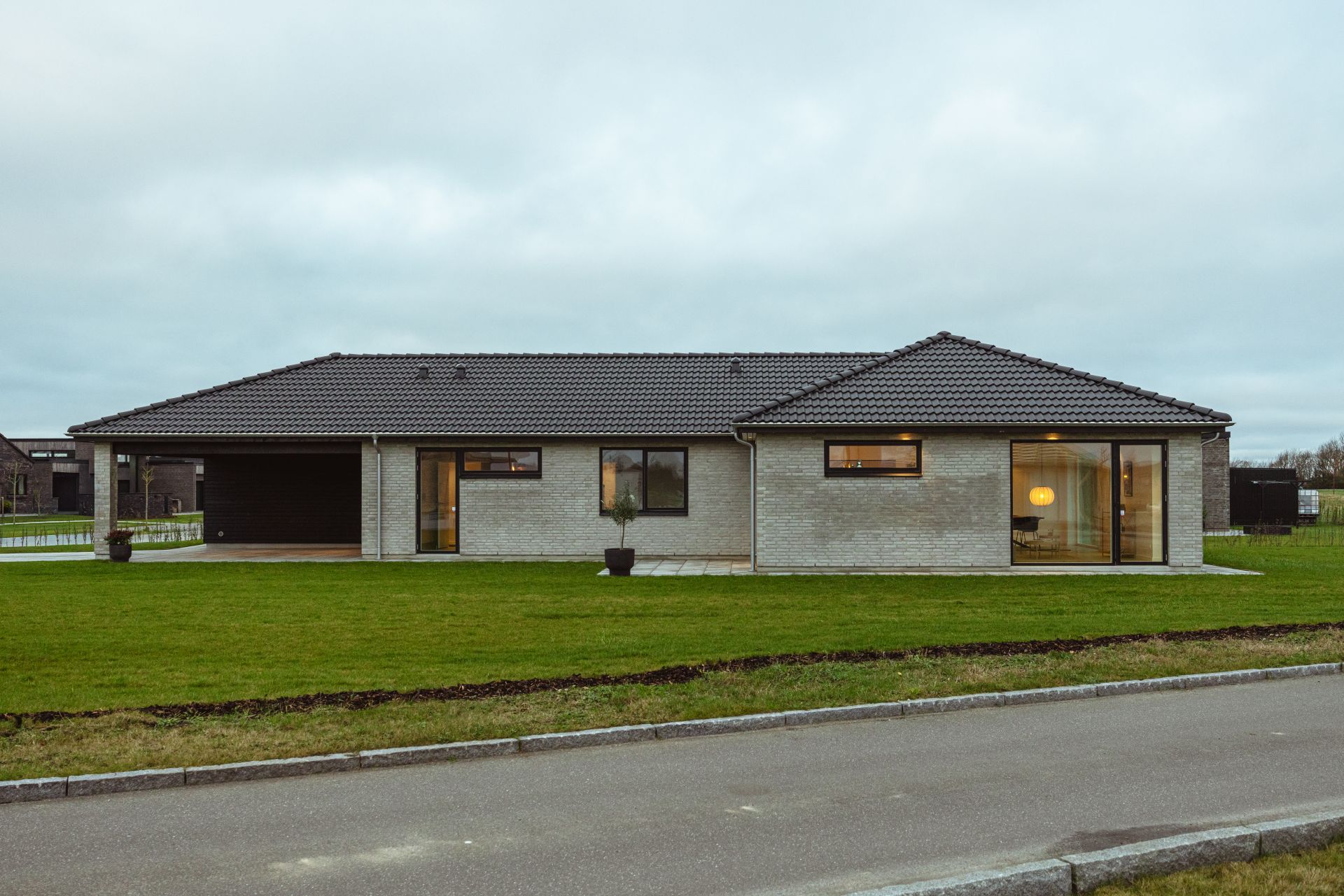 I husets vinkel får du et skønt kombineret køkken-alrum og stue i åben forbindelse, opdelt af en halvmur som åbner op for indretningsmulighederne i det store opholdsrum. Lyset vælter ind ad de store vinduespartier, og der er hele tre udgange til haven og den store, grønne plæne. Fra alrummet er der adgang til en forældreafdeling med stort soveværelse, masser af skabsplads og eget badeværelse med bruseniche.