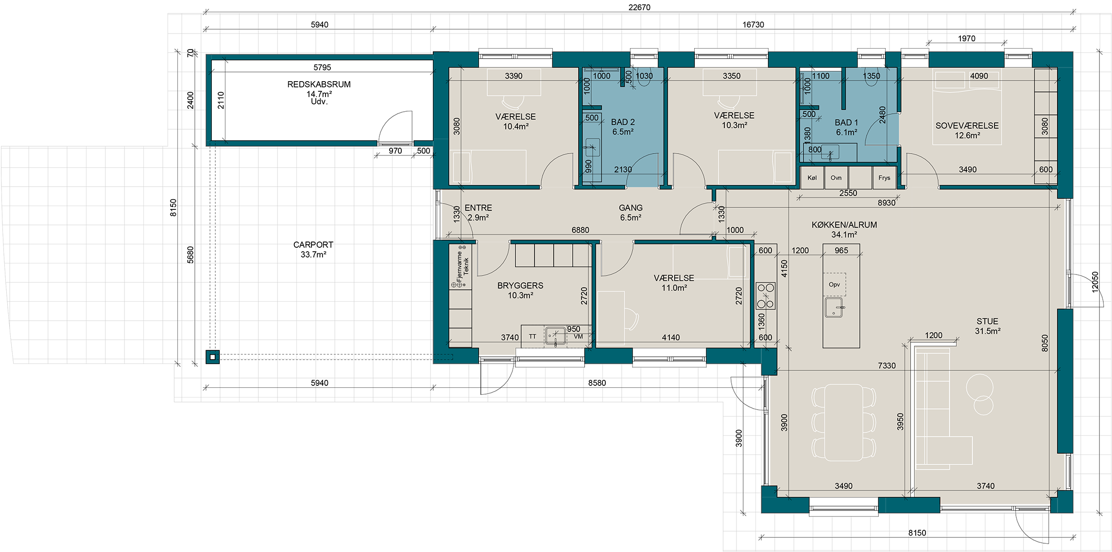 Her får du en separat børneafdeling med tre gode værelser og et badeværelse placeret langs en fordelingsgang. Dertil kommer et stort og praktisk designet bryggers med masser af gulv og skabsplads - ideelt til småbørnsfamilien.